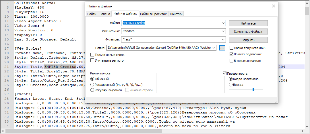 Копируешь название проблемного шрифта -> ctrl+F -> Найти в файлах -> Вставляешь шрифт в поле "найти" -> В поле "заменить на" пишешь свой шрифт -> В фильтрах лучше поставить формат своих сабов вроде *.ass -> указываешь папку с сабами для замены -> Жмешь на "Заменить в файлах. Пример на скринах.
