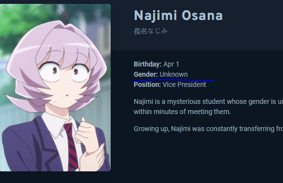 >>146770 Нет, это просто фича персонажа. Тут же они все построены вокруг какой-нибудь идеи, вот Наджими - образ подруги\друга детства, пол не важен (и его нет).