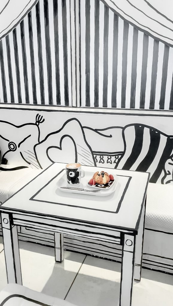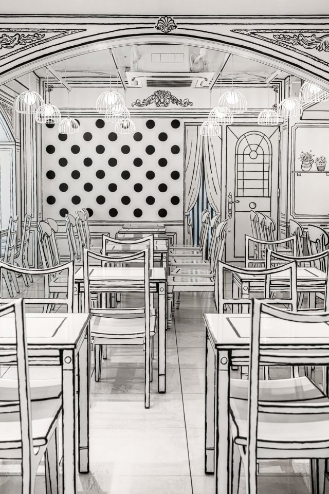 Интерьер так спроектирован, что выглядит как плоская черно-белая иллюстрация манги, но вся мебель реальна, как и светильники, которые играют фантастическую роль в создании оптической иллюзии.