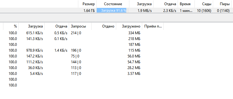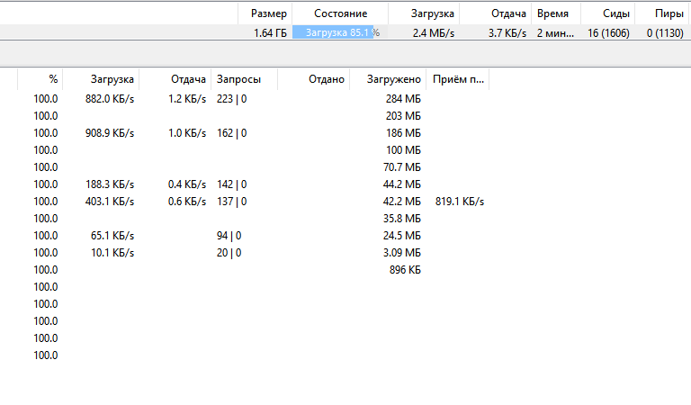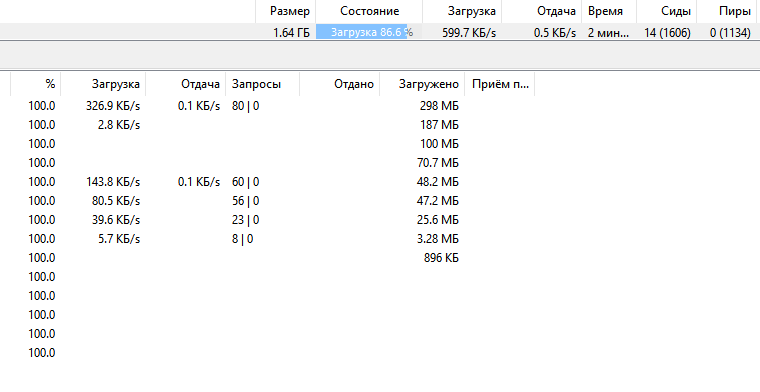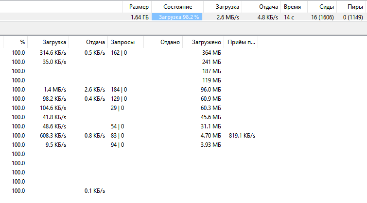 >>152037 > Не понятно почему у тебя такая низкая. А ещё у меня часто бывает, что некоторые торренты, несмотря на то, что они только вышли, и у них 200+ сидов с пирами, некоторое время вообще не грузятся, или грузятся очень медленно. Сейчас 1 такой был, только через 4 минуты грузиться начал. А теперь грузится со скоростью 0.5-1 МБ/с.
