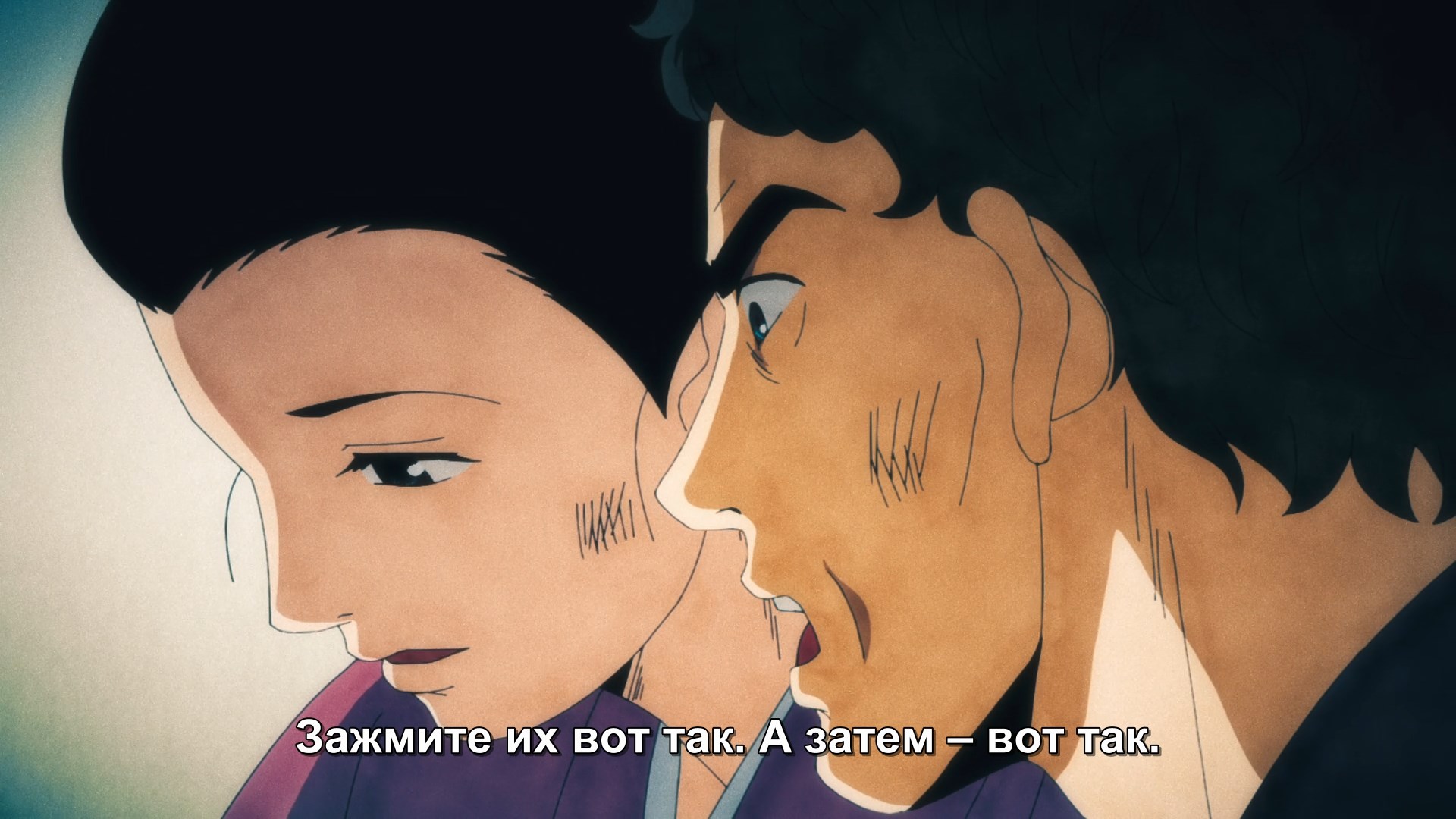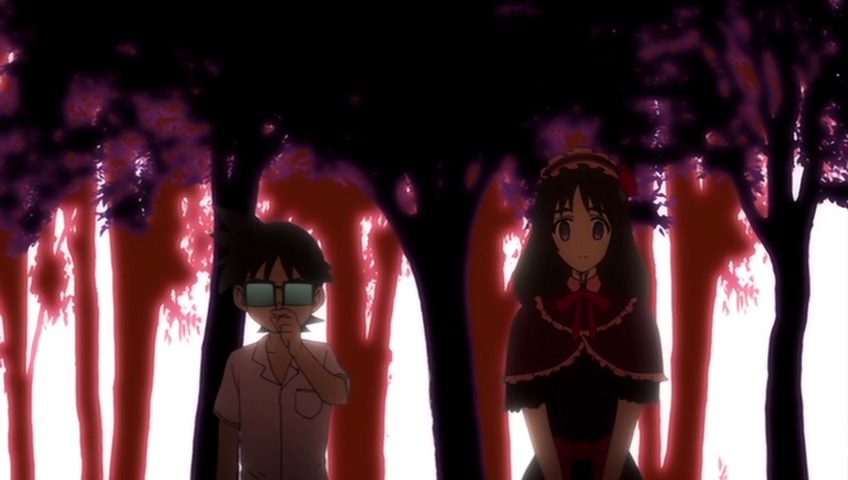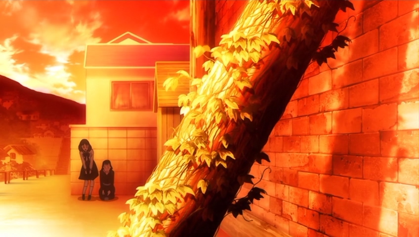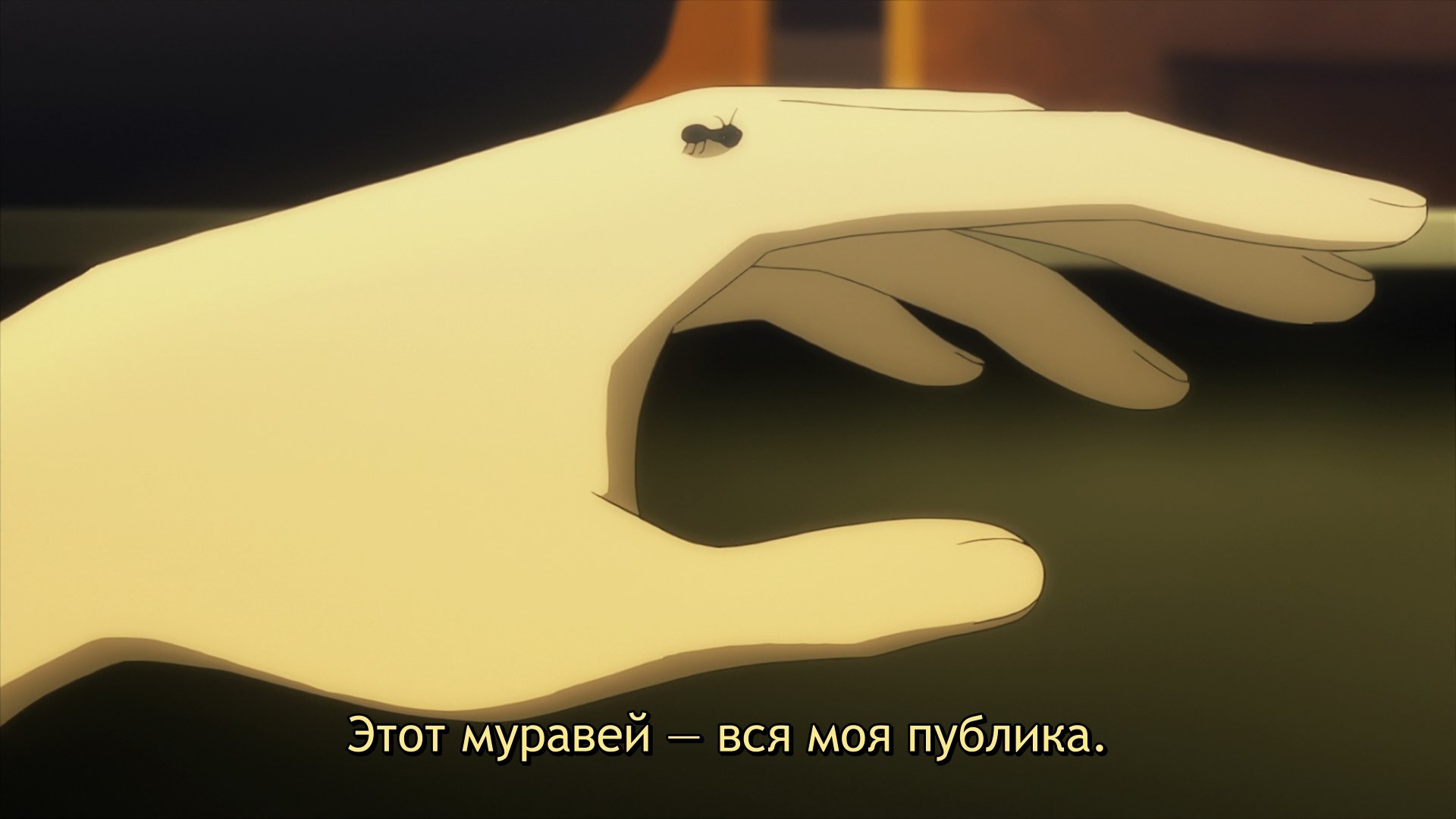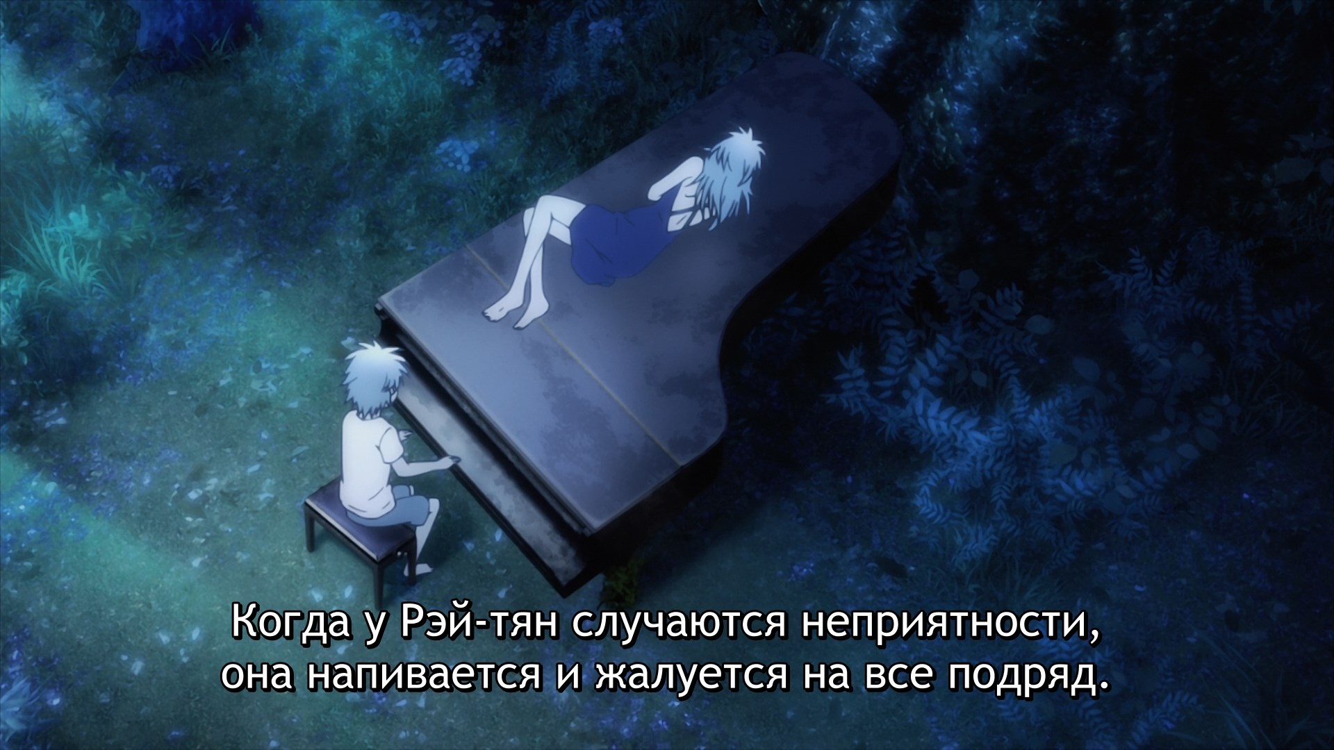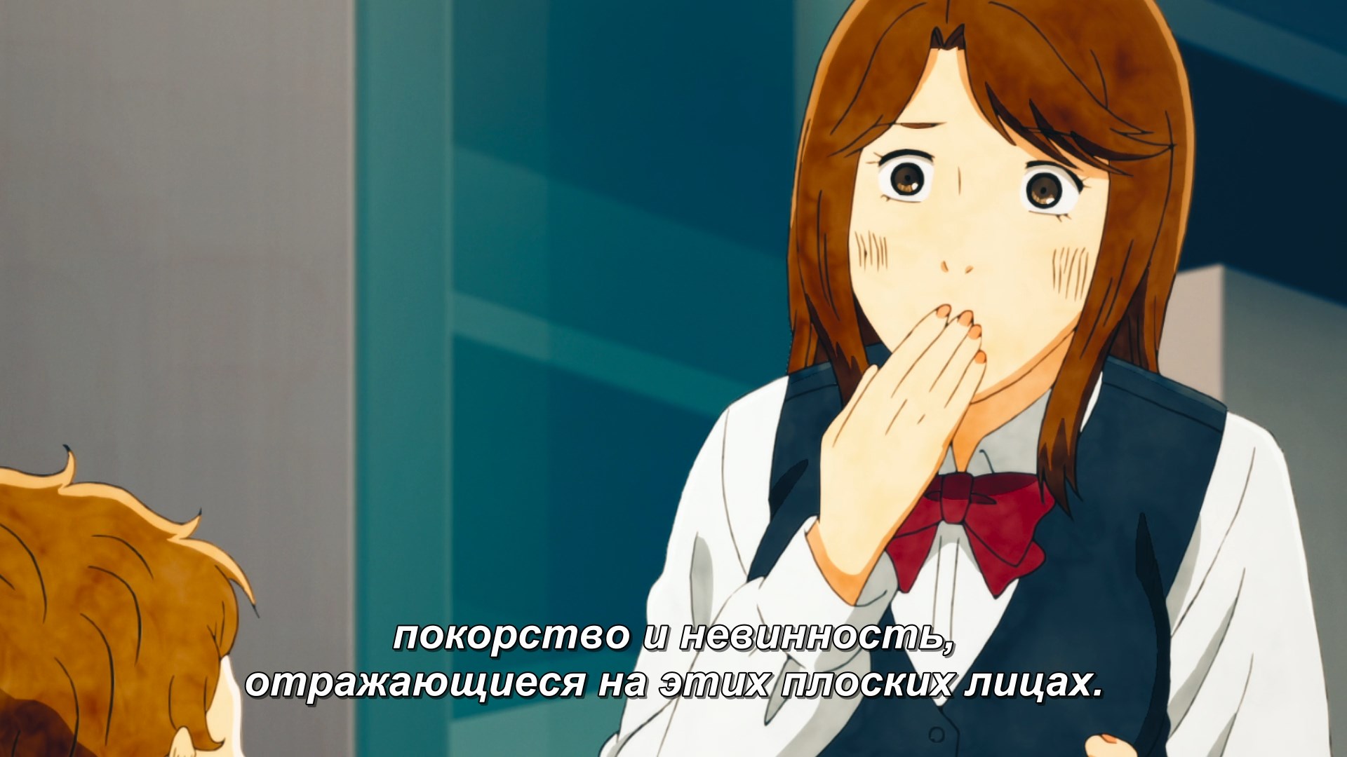 Только вот сама атмосфера произведения, цветовая гамма, сверхтягучесть вообще ВСЕГО живо напомнили мне Бугипопа. Но триллером здесь даже и не пахнет, поэтому подобное нагнетание вкупе со всеобщей тормознутостью мне не особо понятны. Такое чувство, будто все персонажи закинулись лошадиной дозой антидепрессантов, настолько аутично они себя ведут. Диалогами в принципе можно пытать особо нетерпеливых зрителей, ведь после каждой фразы обязательно надо сделать паузу подлиннее...