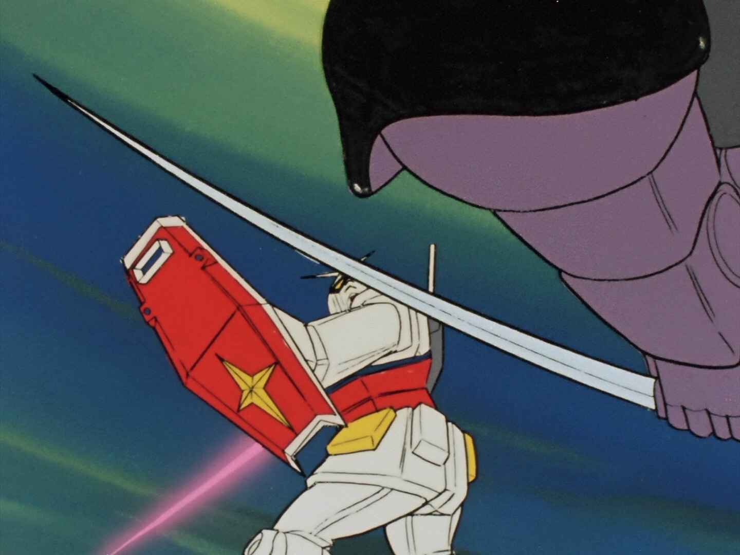 Внезапная атака сзади - для того чтобы в стопятьсотый раз разрубить гандаму его щит. Там цех щитов на белой базе круглосуточно работает, наверное. Все же зионцы как то не так с ним сражаются. Может по каким то особым правилам, как в кэндо? Типа вот так сходу по корпусу бить нельзя - нужно в щит постараться всегда попасть, даже если проще по корпусу. А Амуро про эти правила забыли рассказать - он же не военный.