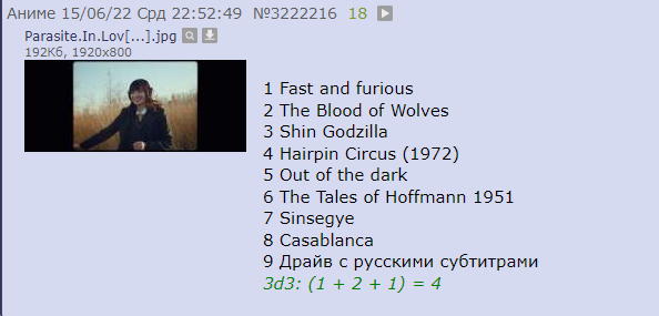 1 Fast and furious 2 The Blood of Wolves 3 Shin Godzilla 4 Out of the dark 5 Sinsegye 6 Casablanca 7 Драйв с русскими субтитрами 8 Serial Experiments Lain 9 Психо 10 Мальтийский сокол
