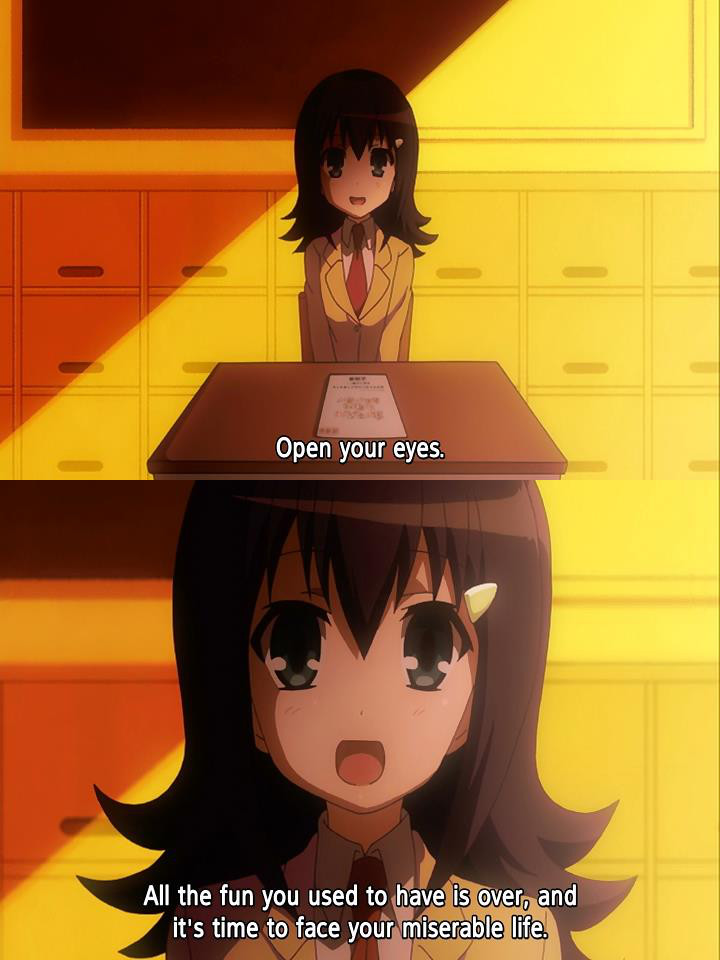 Мне хуёво от этого тайтла. Просто пиздец как хуёво. В КАКОМ, СУКА ТЫ БЛЯДСКАЯ, МЕСТЕ ТЫ НАПОРТАЧИЛА, А?!!! В том, что помогла этому беспомощному достать листочек с дерева? ТЫ ЕБАНУТАЯ? ГДЕ ТЫ ТУТ НАПОРТАЧИЛА? ТЫ НЕ УПАЛА, НЕ ПОЦАРАПАЛАСЬ, НЕ ЗАСВЕТИЛА СВОИ ОБЪЁБАНЫЕ ТРУСЫ - НИЧЕГО! Неее, это просто ебанёшься какое говно. Худший кал сезона, лучше бы его дропнул, а не Ахарен-сан.