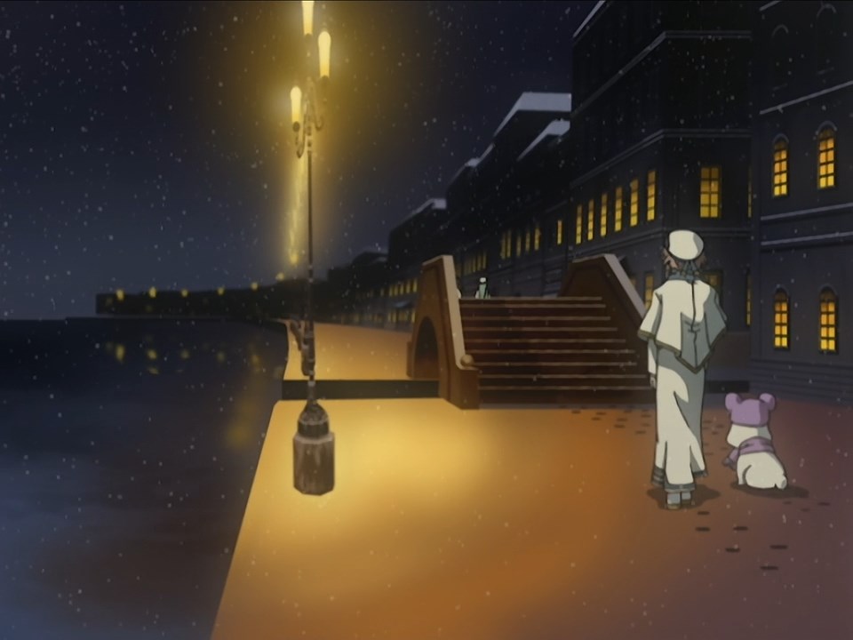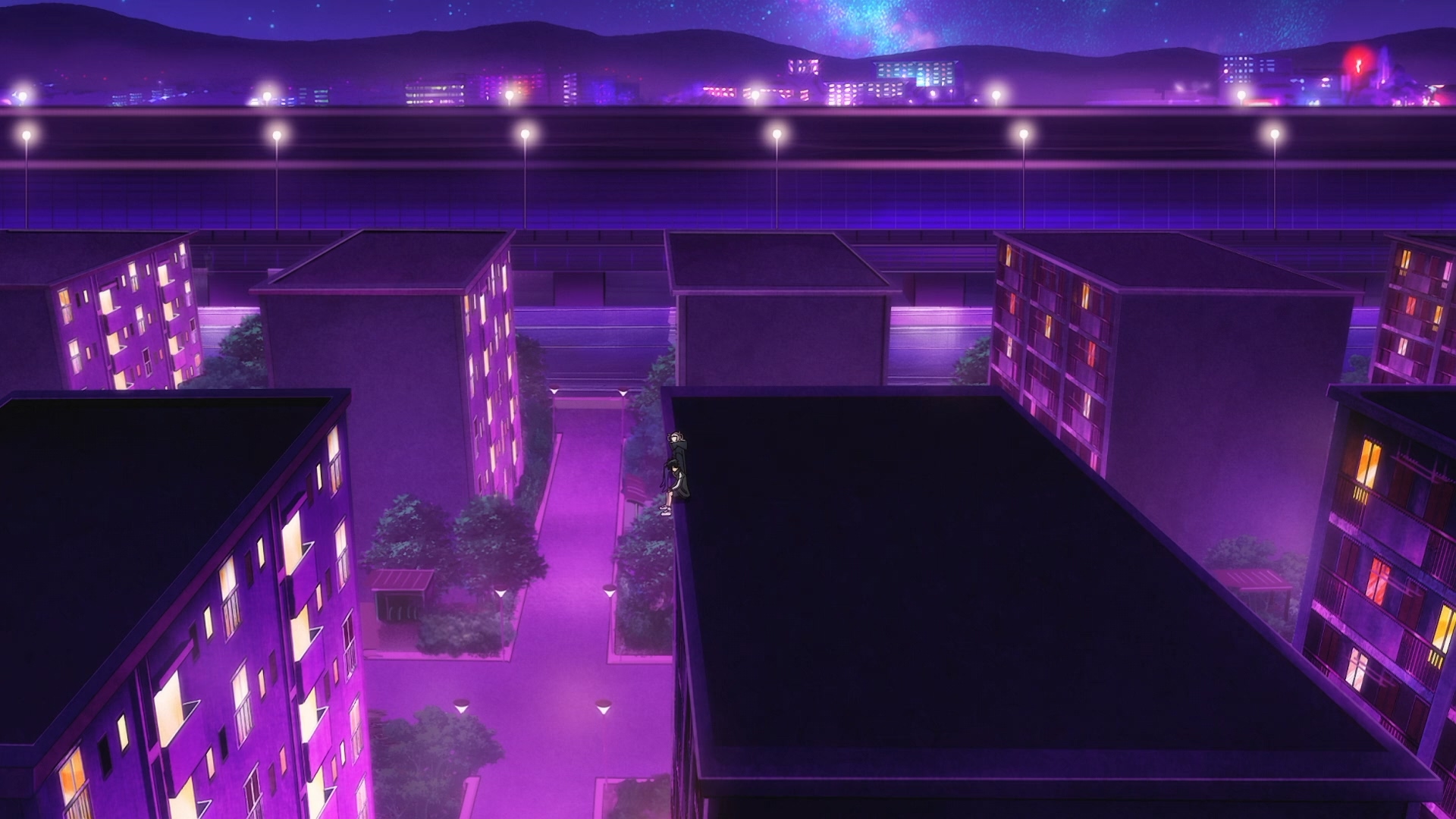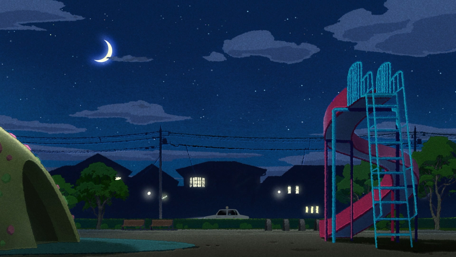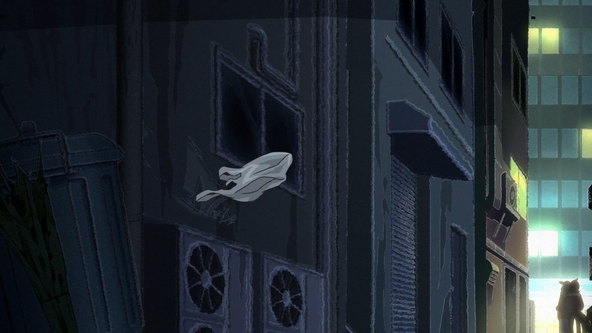 Сочная картинка, даже жалко, что не скриншотю. Показан контраст между цветастой ночью и серым угрюмым днём. Анимация и рисовка на высшем уровне.
