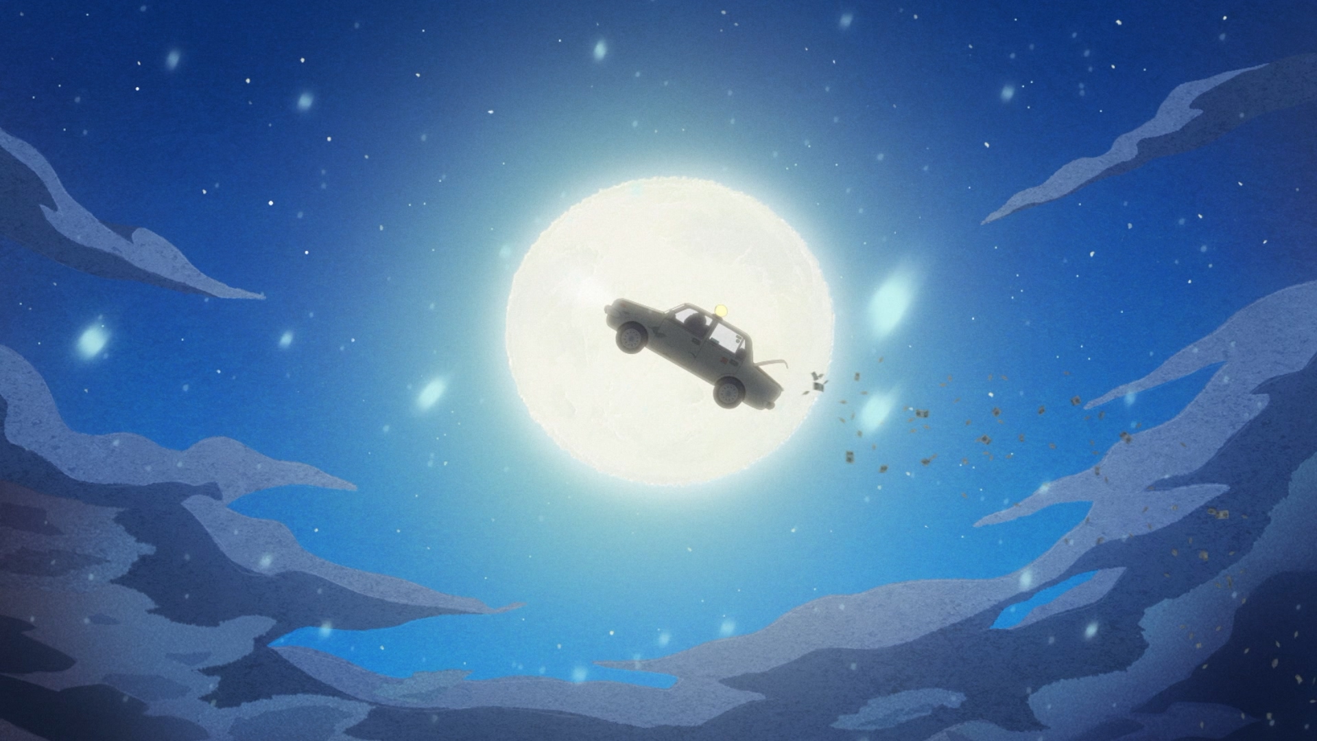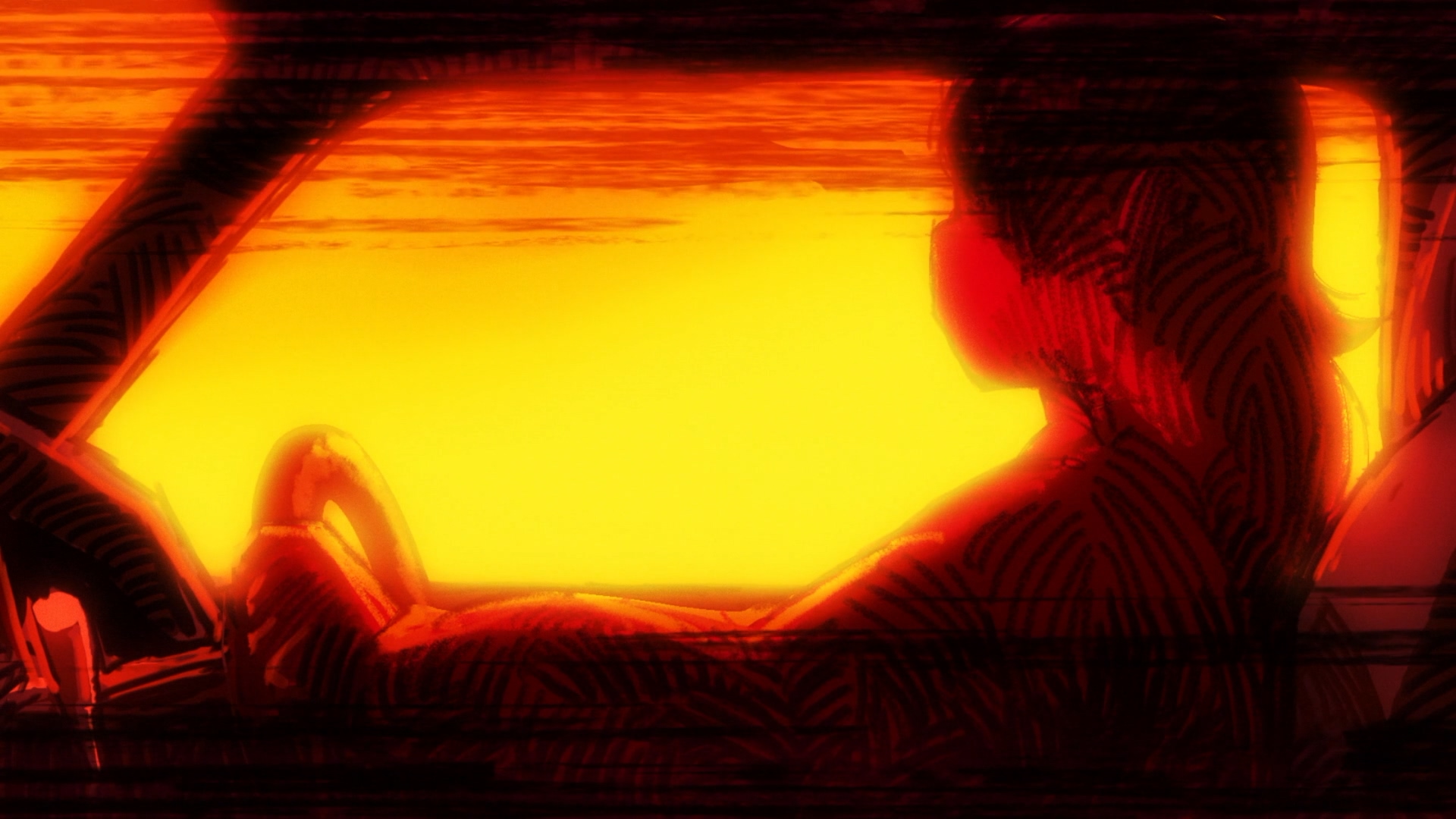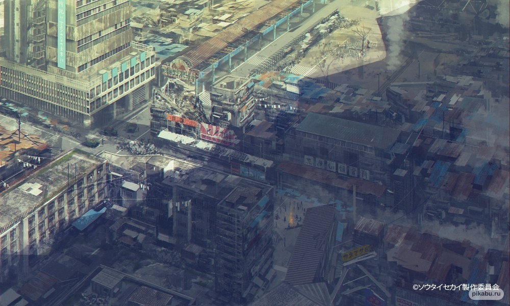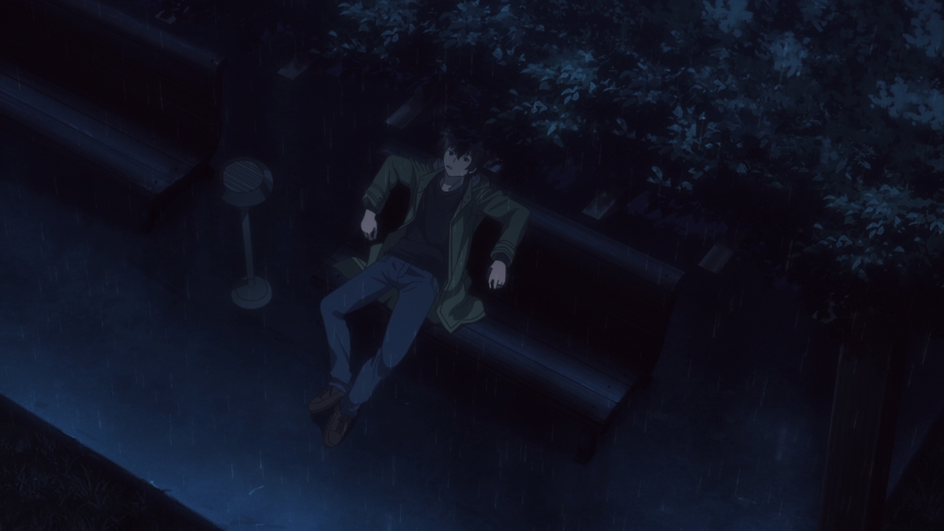 Сочная картинка, даже жалко, что не скриншотю. Показан контраст между цветастой ночью и серым угрюмым днём. Анимация и рисовка на высшем уровне.