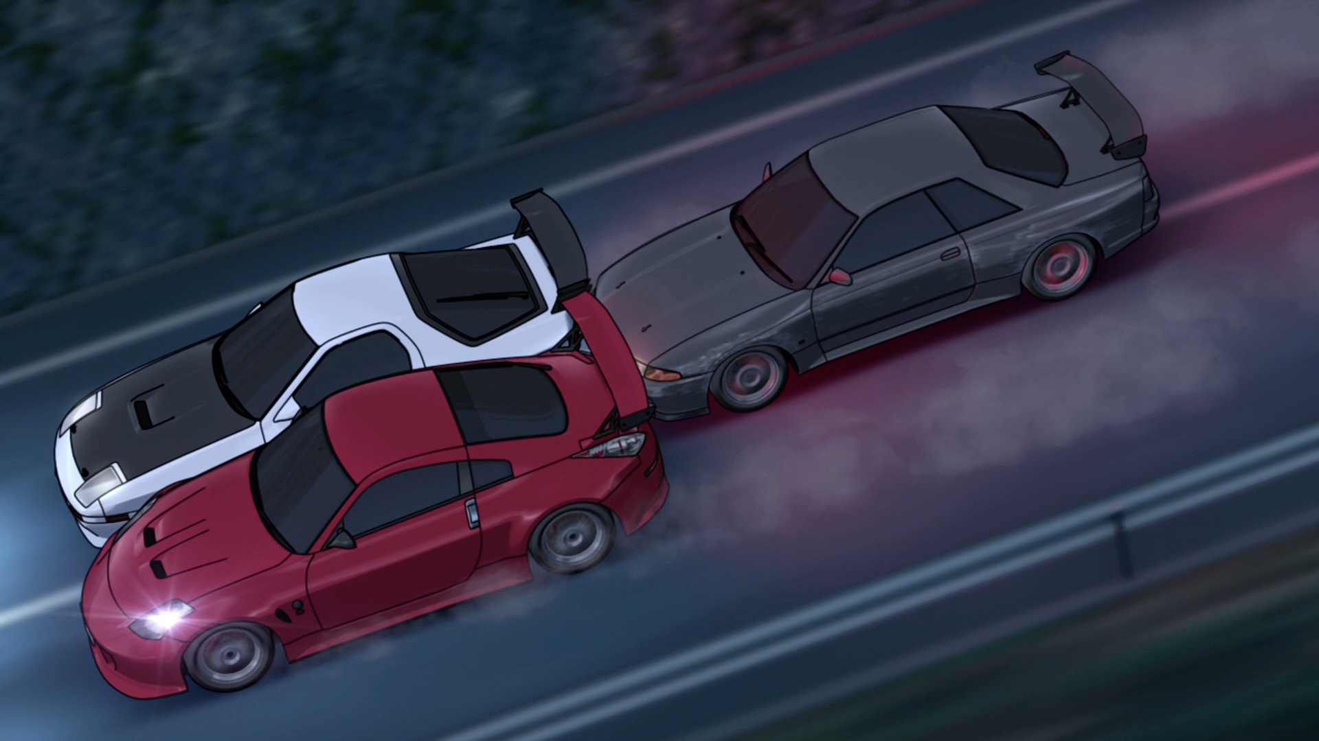 Бля, это такой пиздец. Чел своей тачкой тормозит другую, не справляется, и к нему на помощь приходит другой чел, и вот они вместе тормозят эту черную скайлайн.
