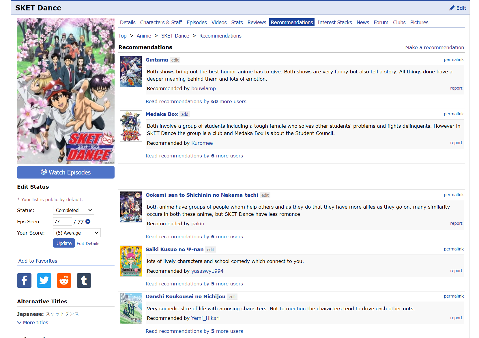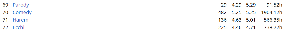 >>162379 В самом листе, в списке комлитов, если нажать на stats - будут только тв, муви, ова, спешлы Оны как будто не учитываются, хотя если их не отдельной категорией, то можно было бы к овам приплюсовывать, но этого не делается