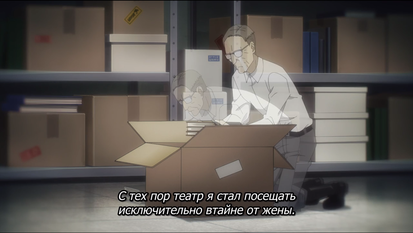 Но главная моя претензия к аниме - непосредственно исполнение ракуго. Может быть сейю недорабатывали, может еще что, но сам процесс рассказа историй... скучный и невыразительный. Плюс, через некоторое время начинают вылазить вот эти шоненодрючки как на втором скрине, что, мол "Это техника супер-четкого рассказа, от которой зрители замирают в благоговении!!!", а потом еще и всякие визуализации этого самого благоговения, ну, типа как в каком-нибудь Сомном девки улетали в небеса и кончали три раза от одного кусочка котлетки. То есть, другими словами, авторы не показывают выступление, давая нам шанс самим сложить о нем мнение, а рассказывают о нем, какое оно крутое и сверхвыразительное. А нам остается лишь поверить им. Еще здесь много женских персонажей-рассказчиц и всего три мужских. Так вот, выступления этих троих - лучшие в сериале. Смены темпа, настроения, плавные переходы от женских ролей к мужским, экспрессия... Не буду вновь пенять на нерадивых сейю, а лишь выскажу мнение, что ракуго, как по мне - исключительно мужская вотчина.