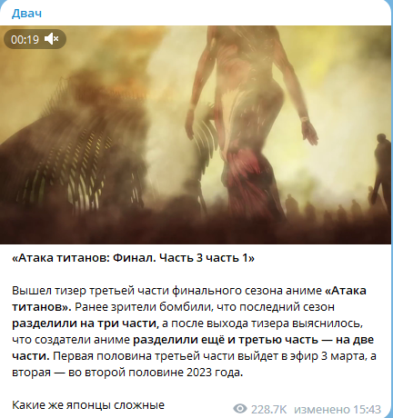 >>168114 Там же объявили, что это будет по факту фильм, разделенный на две части, в марте выйдет спецэпизод "значительно длиннее обычной серии", видимо около часа