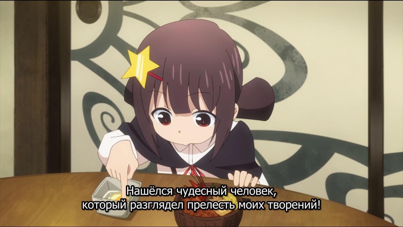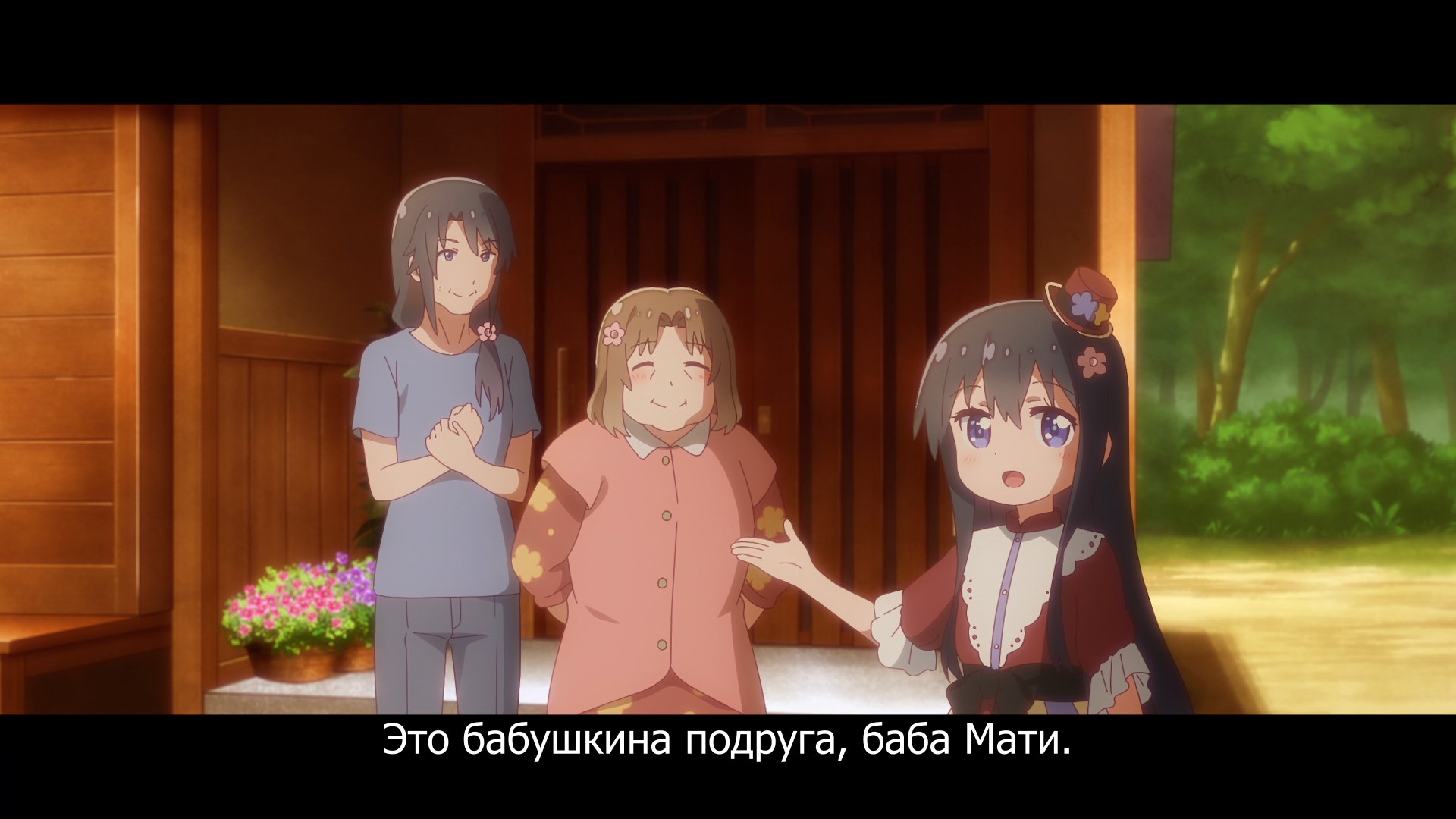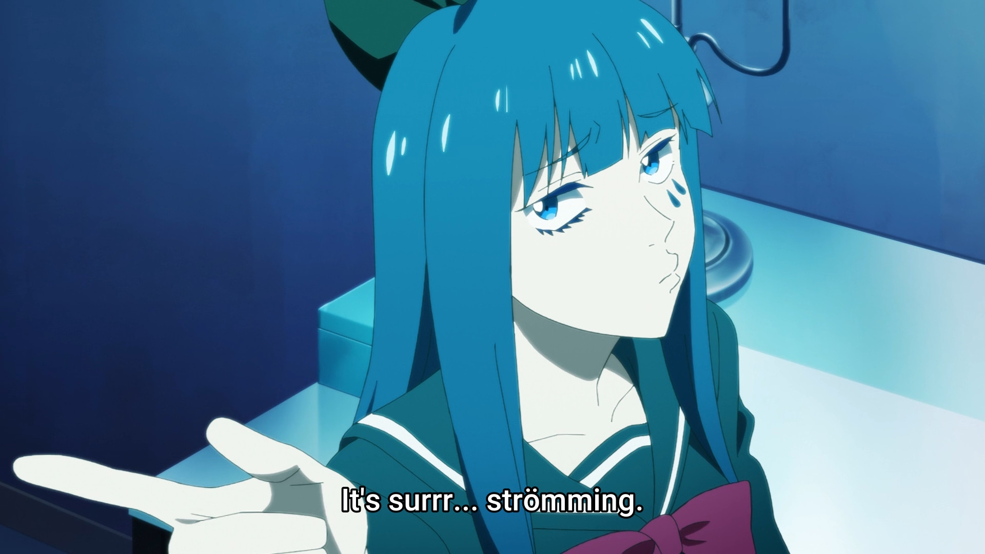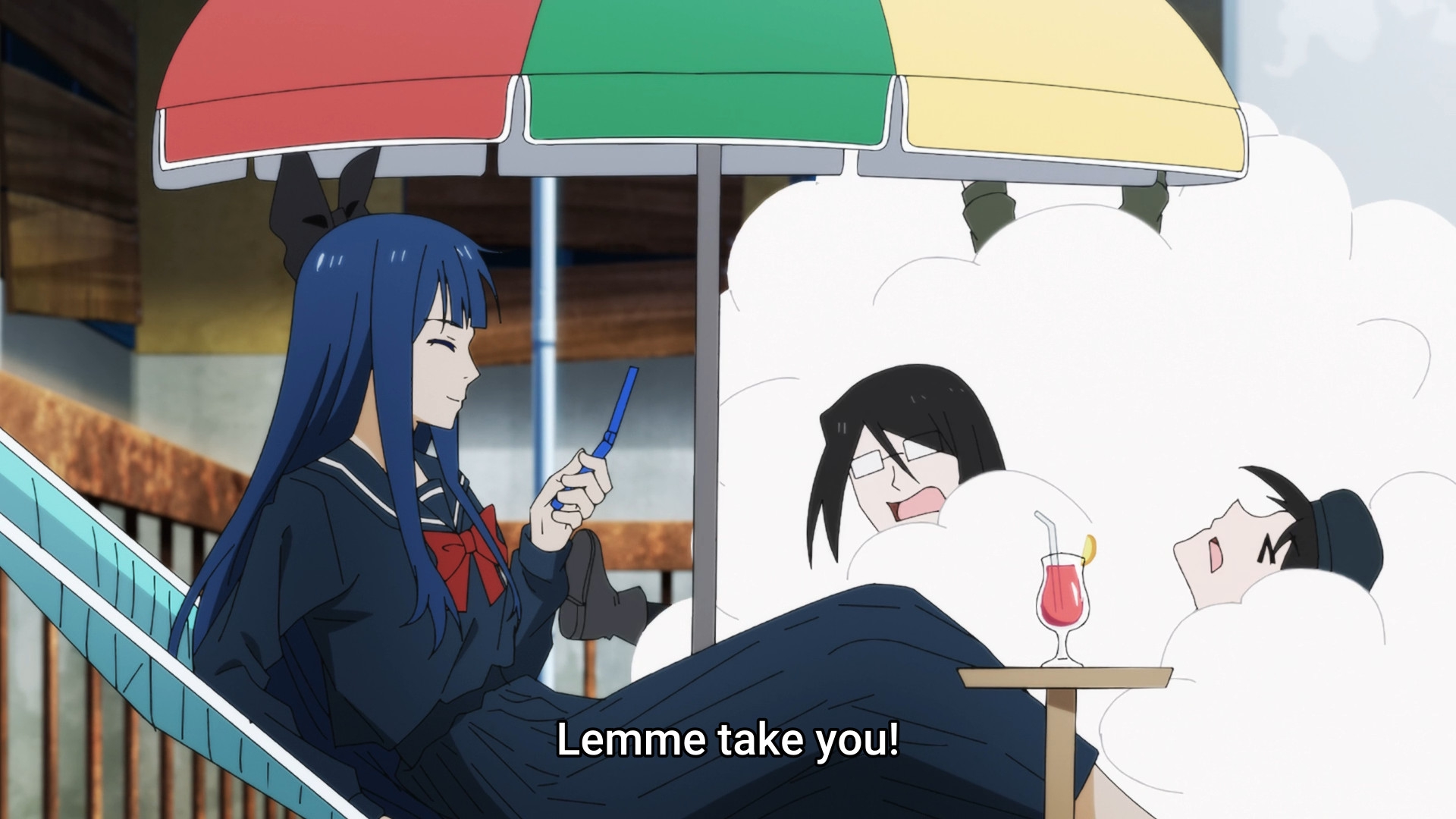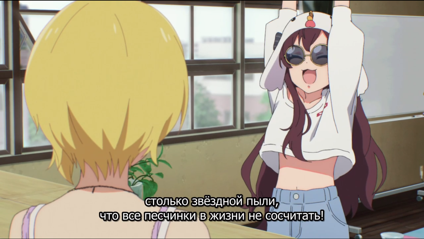 Нет, все же залупа какая-то. Только усилилось ощущение любительского характера всего этого, и чувство постороннего - ну словно ты в чужой тебе компании оказался - все что-то шутят, мемсами и отсылками перекидываются и хихикают, а ты не то, чтобы не понимаешь отсылок и культурный контекст, но просто веселым все происходящее не кажется. В общем опенинг и эндинг видимо останутся лучшим, что тайтлу есть предложить - тут, кстати, поработал Тайки Конно, выходец из Шафта, с его очень характерным художественным стилем, лучше всего известным по второму эпизоду Онимоногатари с длинными полотнами истории Шинобу. Дроп