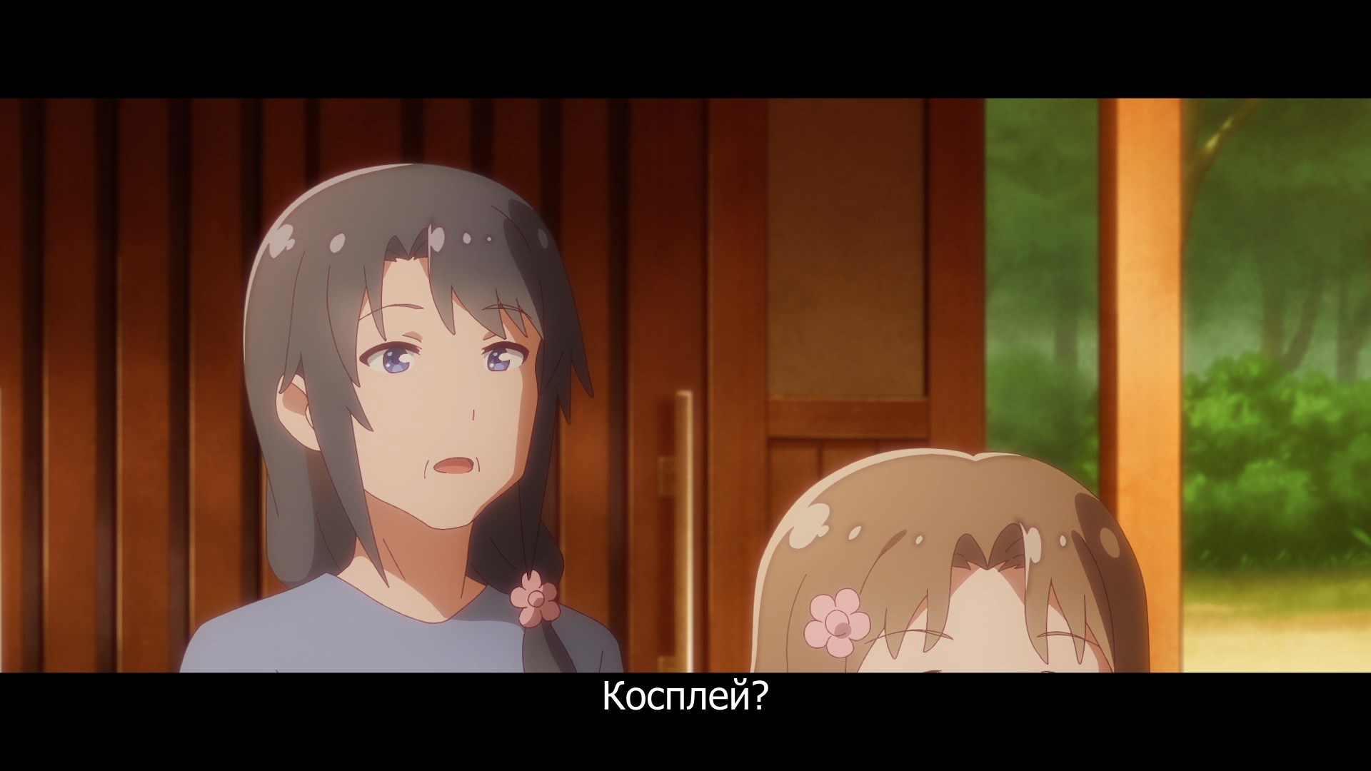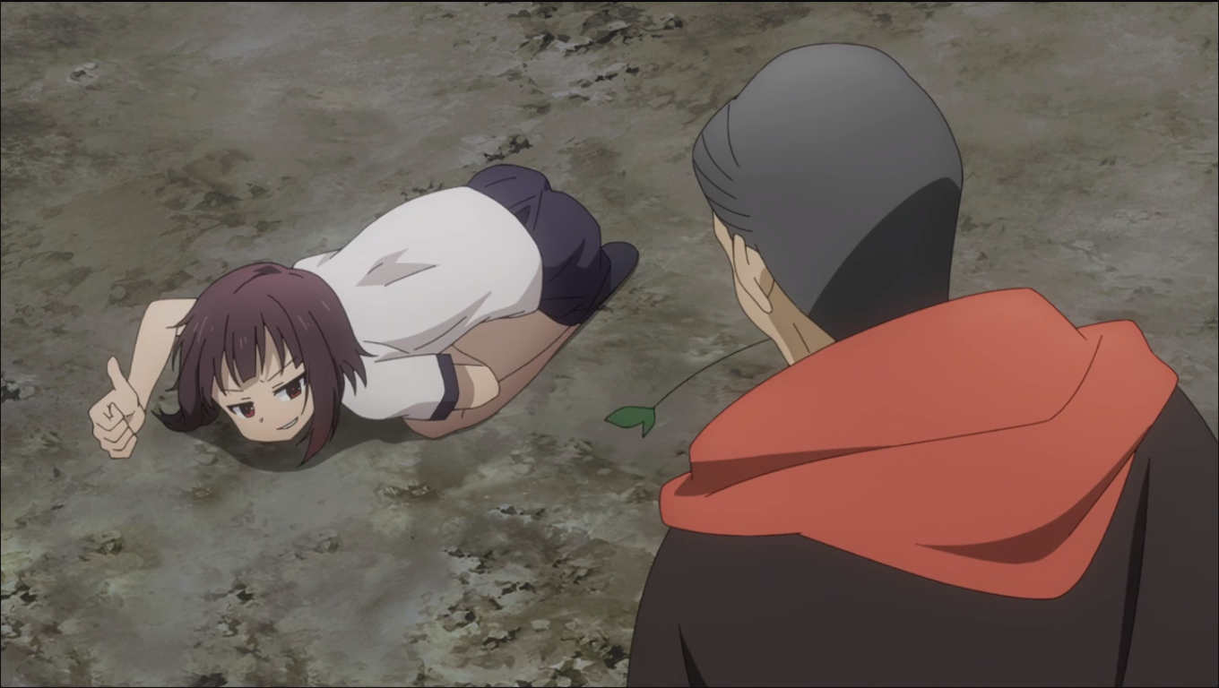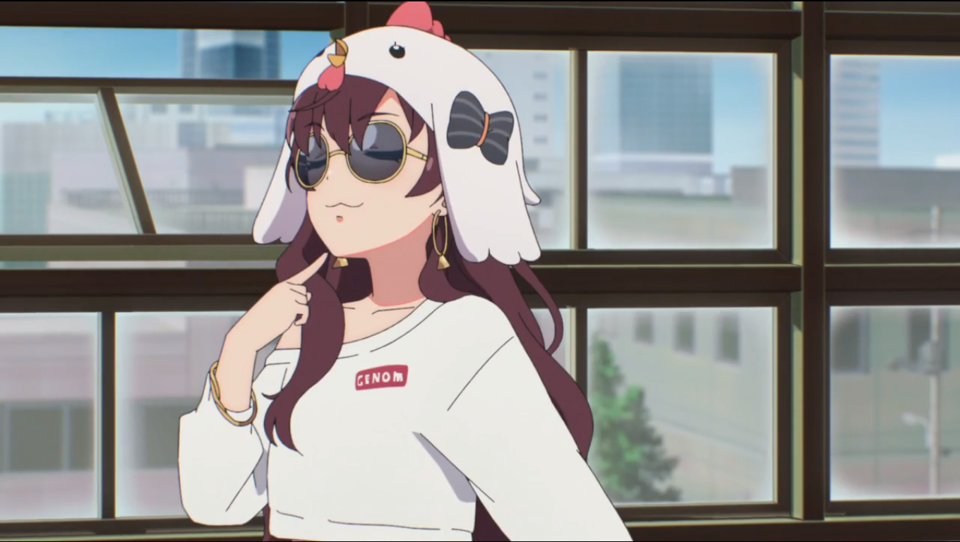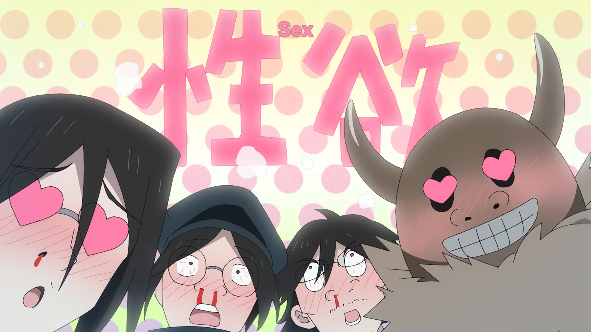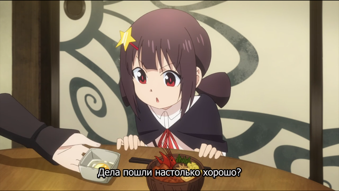 Нет, все же залупа какая-то. Только усилилось ощущение любительского характера всего этого, и чувство постороннего - ну словно ты в чужой тебе компании оказался - все что-то шутят, мемсами и отсылками перекидываются и хихикают, а ты не то, чтобы не понимаешь отсылок и культурный контекст, но просто веселым все происходящее не кажется. В общем опенинг и эндинг видимо останутся лучшим, что тайтлу есть предложить - тут, кстати, поработал Тайки Конно, выходец из Шафта, с его очень характерным художественным стилем, лучше всего известным по второму эпизоду Онимоногатари с длинными полотнами истории Шинобу. Дроп