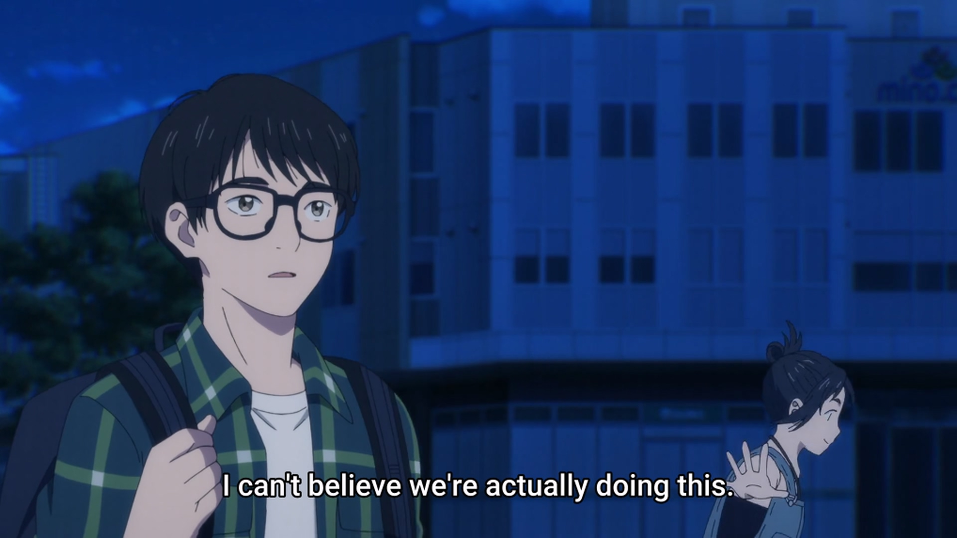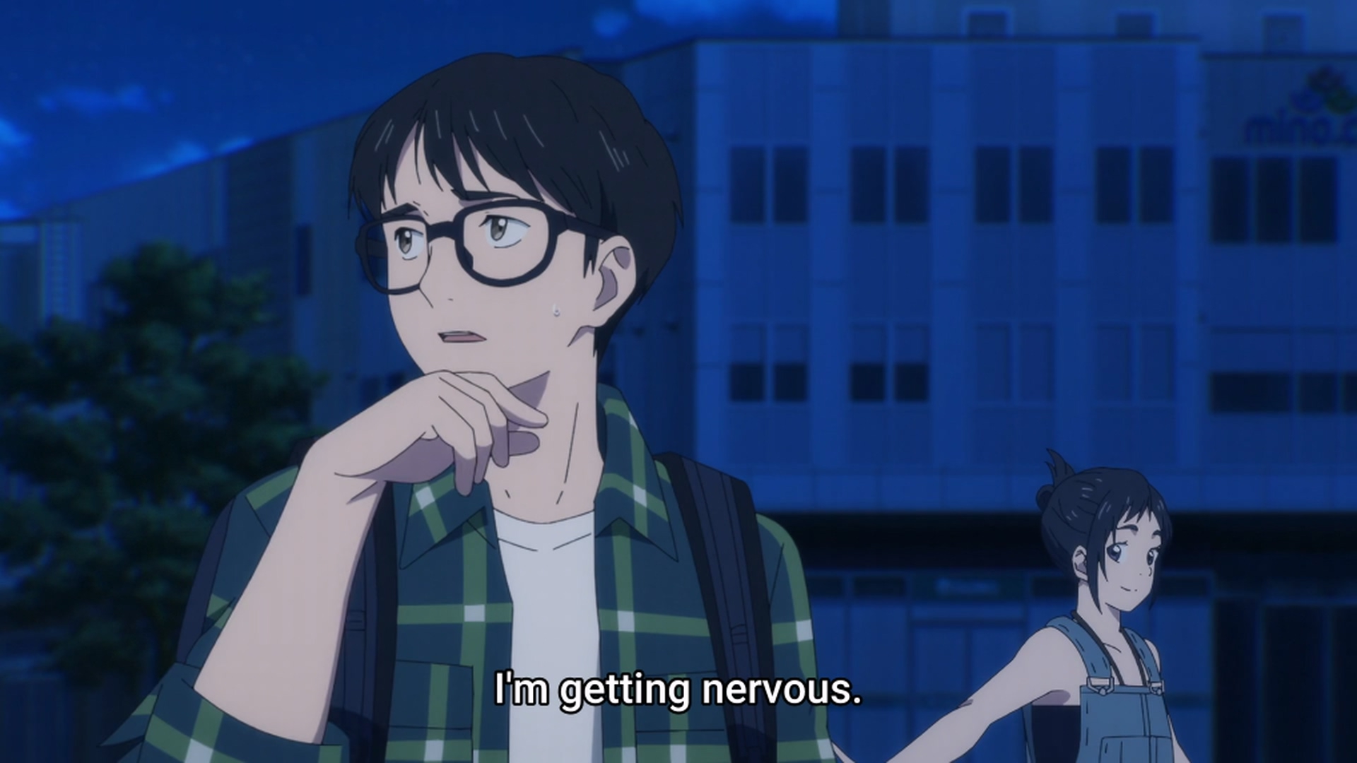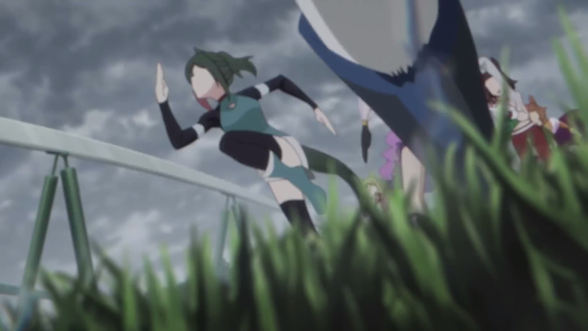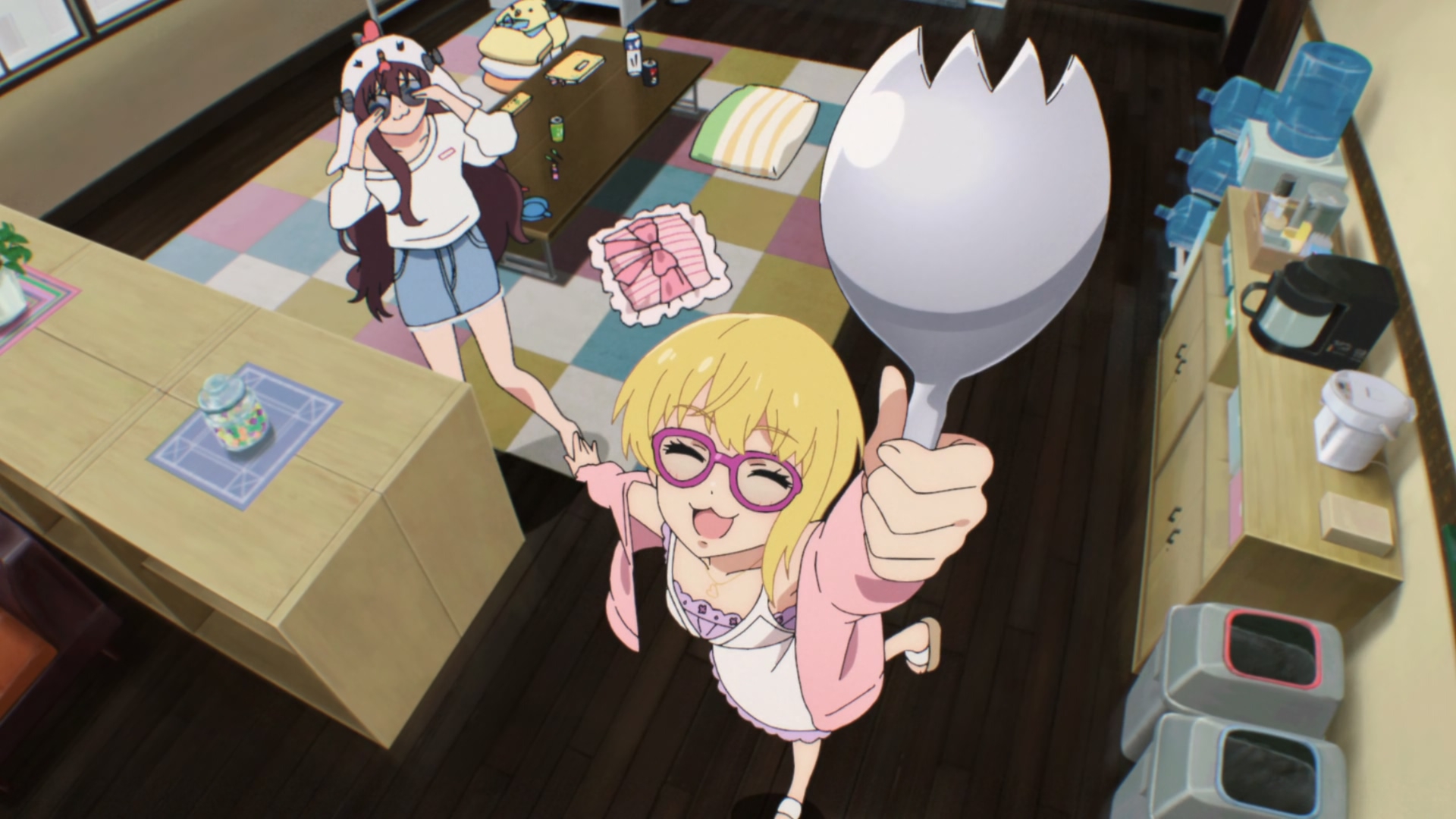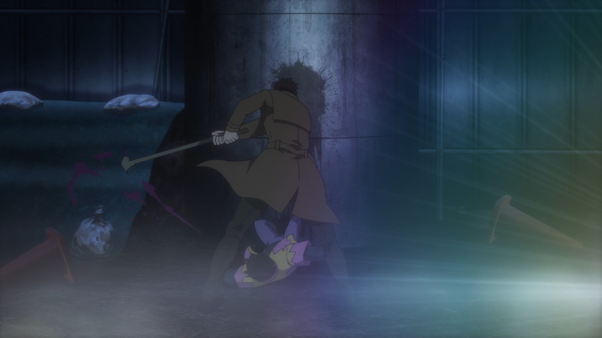 Нет, все же залупа какая-то. Только усилилось ощущение любительского характера всего этого, и чувство постороннего - ну словно ты в чужой тебе компании оказался - все что-то шутят, мемсами и отсылками перекидываются и хихикают, а ты не то, чтобы не понимаешь отсылок и культурный контекст, но просто веселым все происходящее не кажется. В общем опенинг и эндинг видимо останутся лучшим, что тайтлу есть предложить - тут, кстати, поработал Тайки Конно, выходец из Шафта, с его очень характерным художественным стилем, лучше всего известным по второму эпизоду Онимоногатари с длинными полотнами истории Шинобу. Дроп