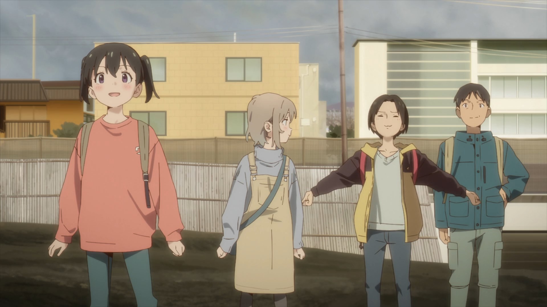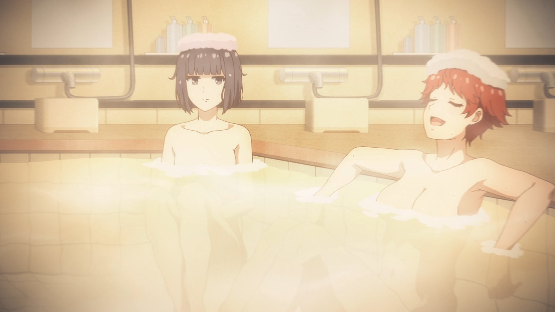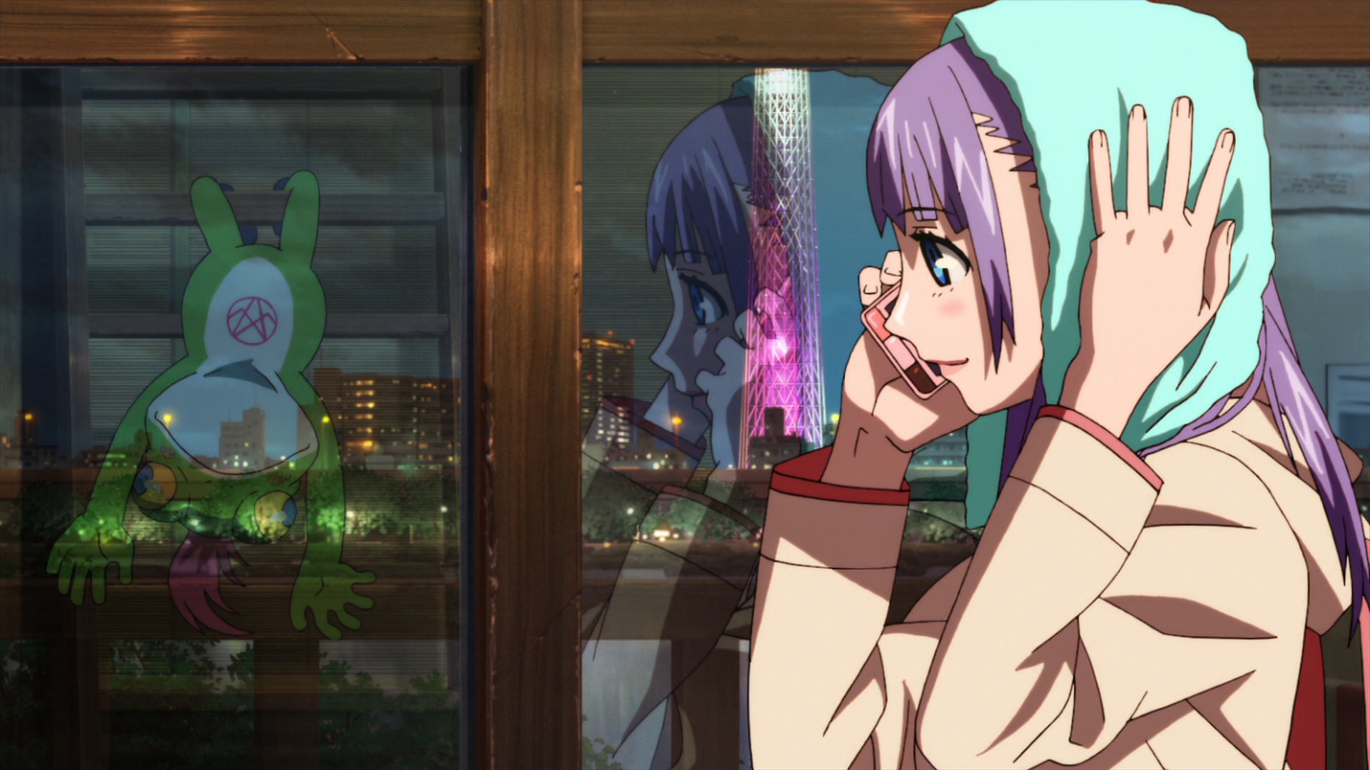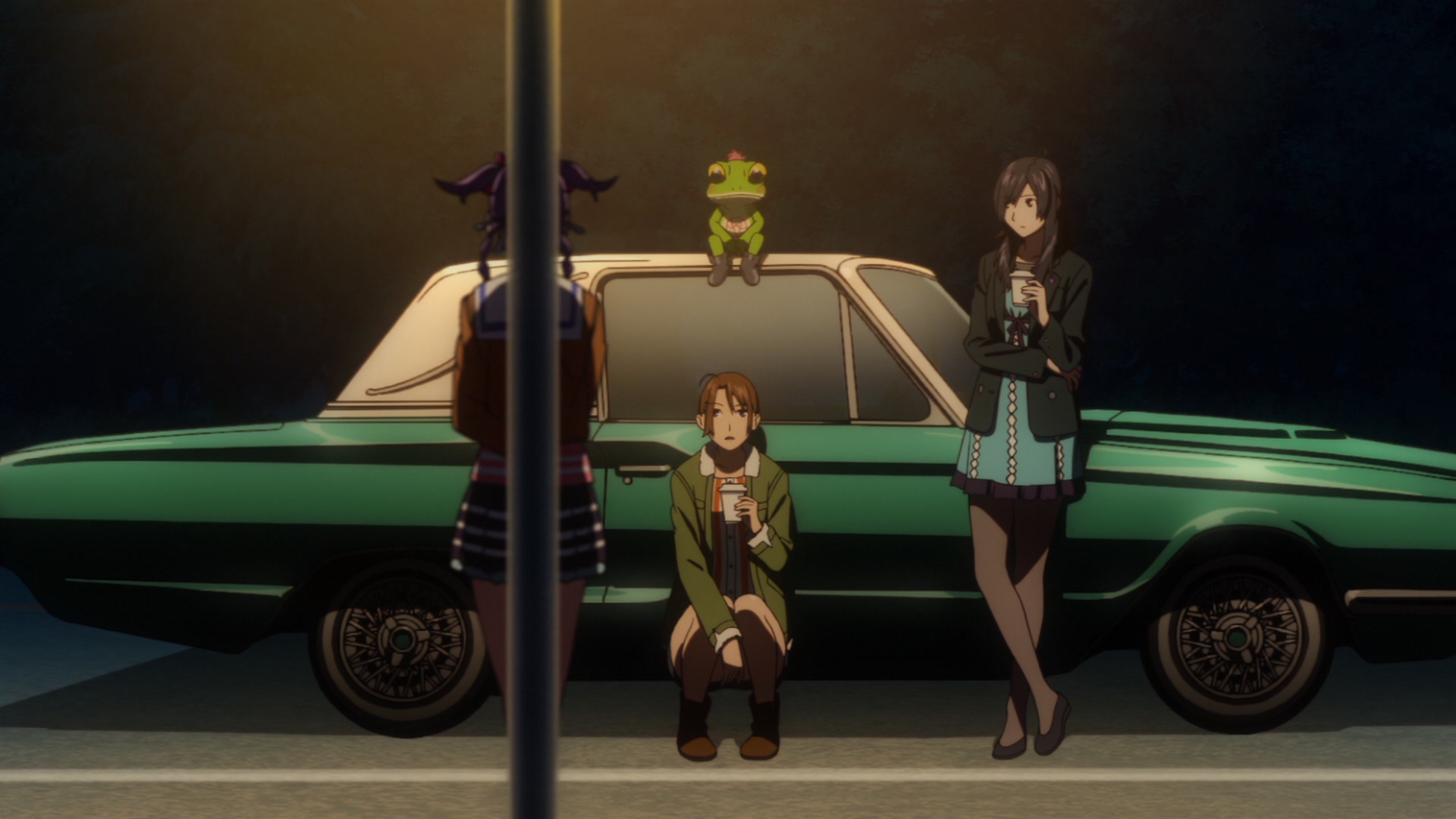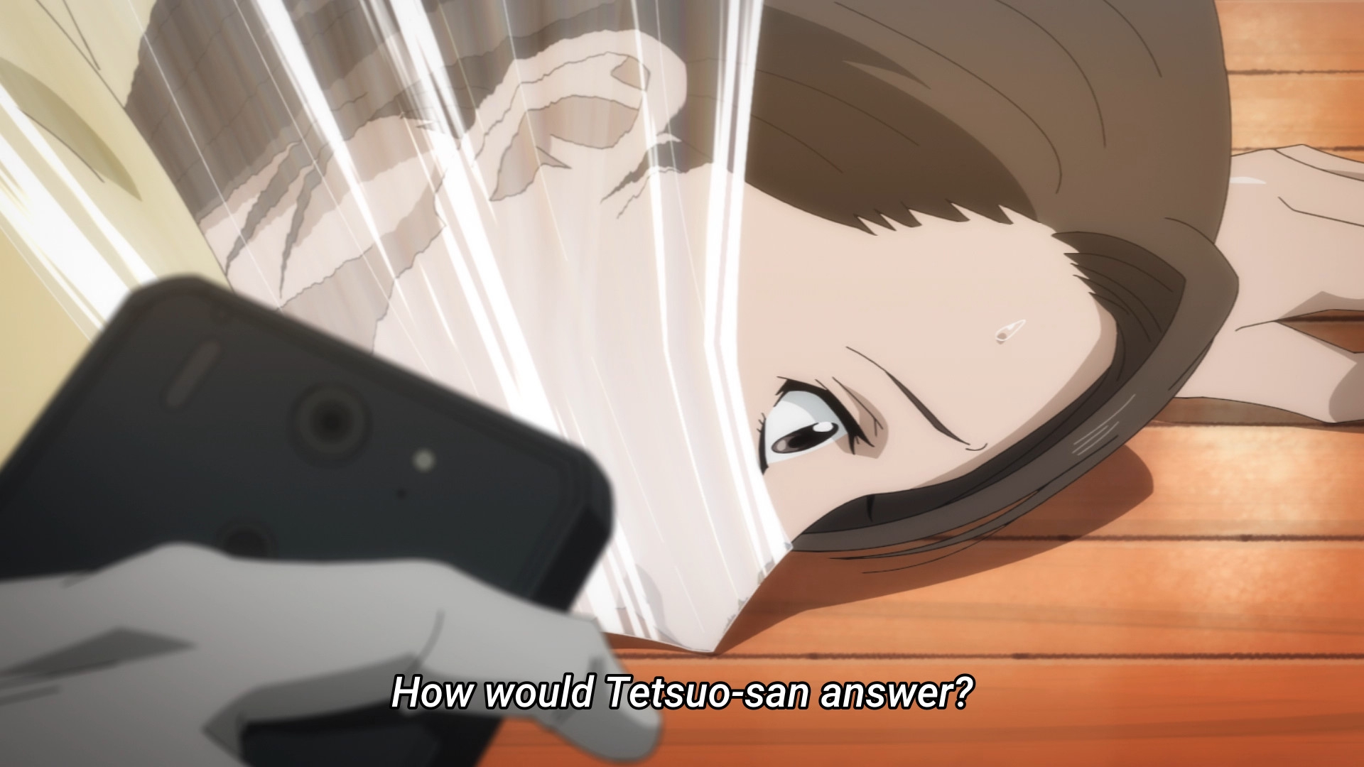 Нет, все же залупа какая-то. Только усилилось ощущение любительского характера всего этого, и чувство постороннего - ну словно ты в чужой тебе компании оказался - все что-то шутят, мемсами и отсылками перекидываются и хихикают, а ты не то, чтобы не понимаешь отсылок и культурный контекст, но просто веселым все происходящее не кажется. В общем опенинг и эндинг видимо останутся лучшим, что тайтлу есть предложить - тут, кстати, поработал Тайки Конно, выходец из Шафта, с его очень характерным художественным стилем, лучше всего известным по второму эпизоду Онимоногатари с длинными полотнами истории Шинобу. Дроп