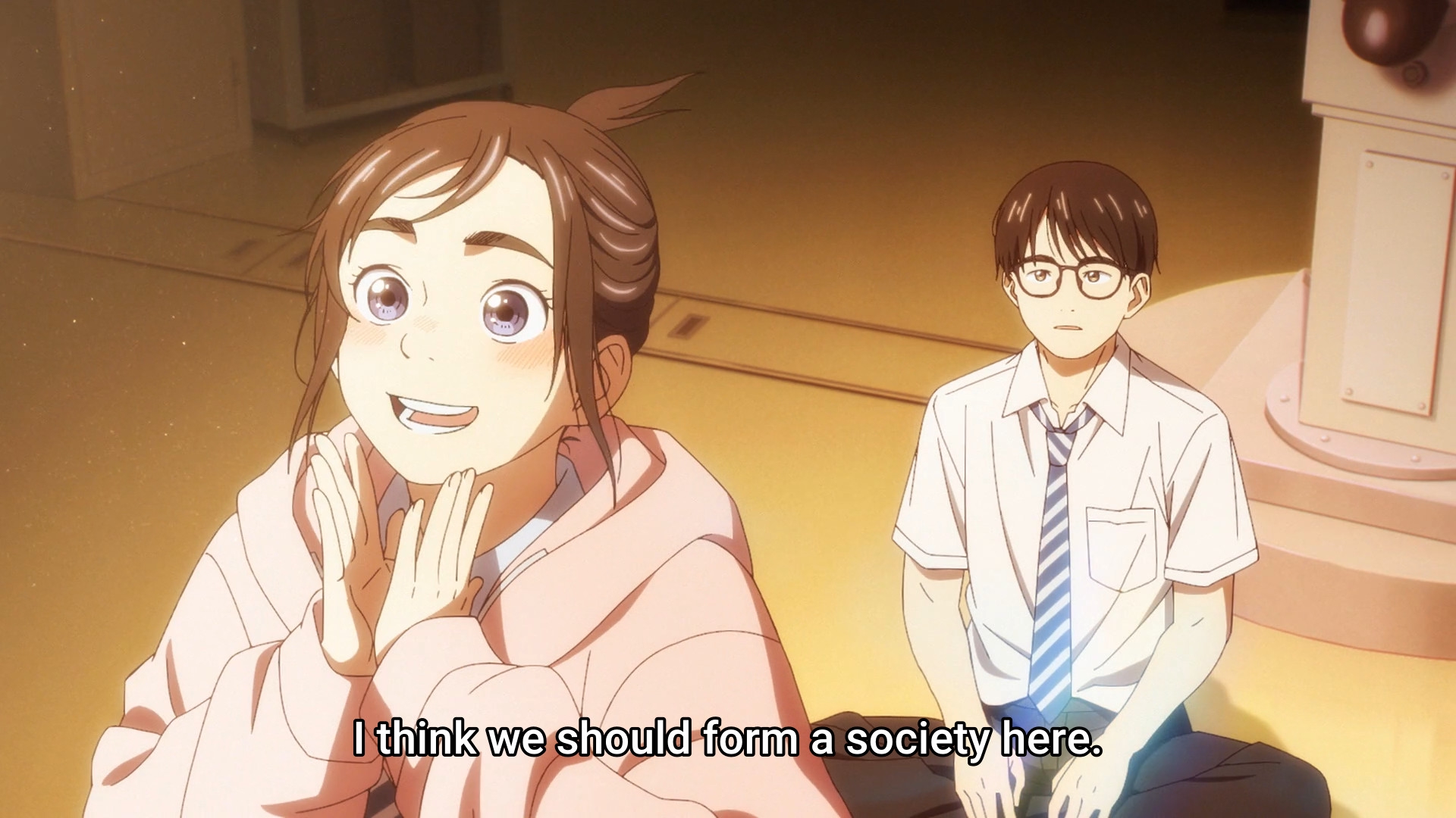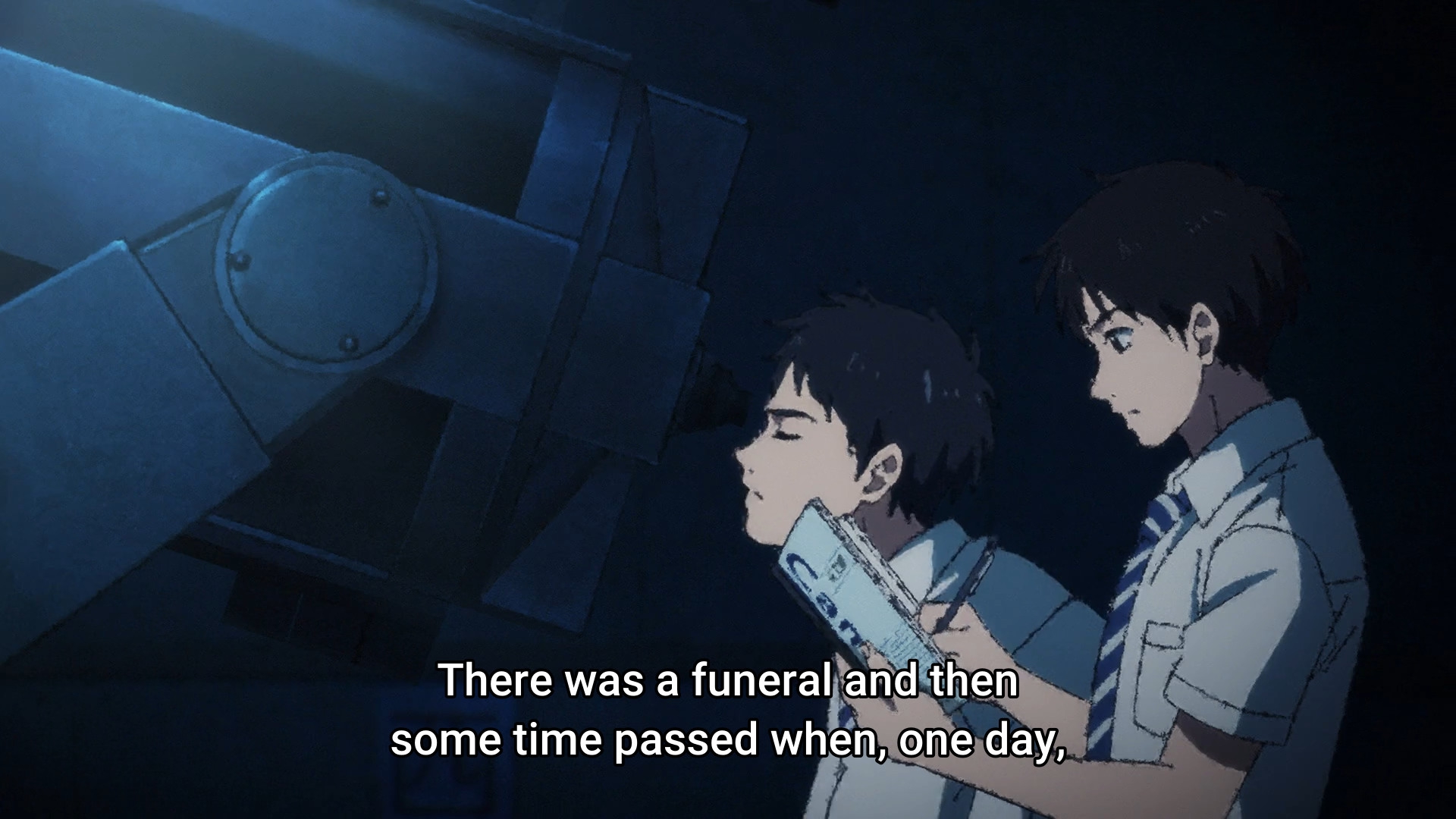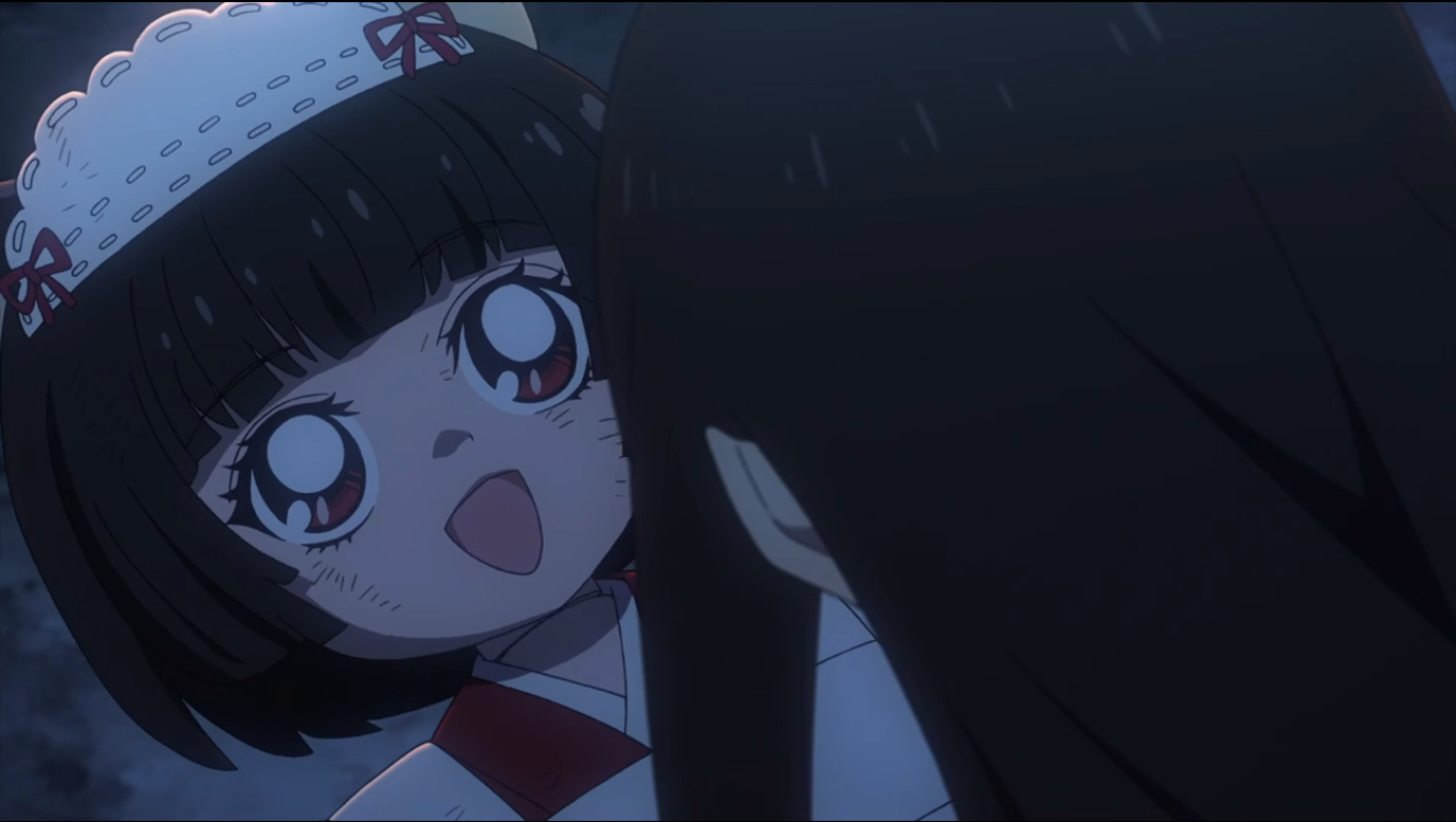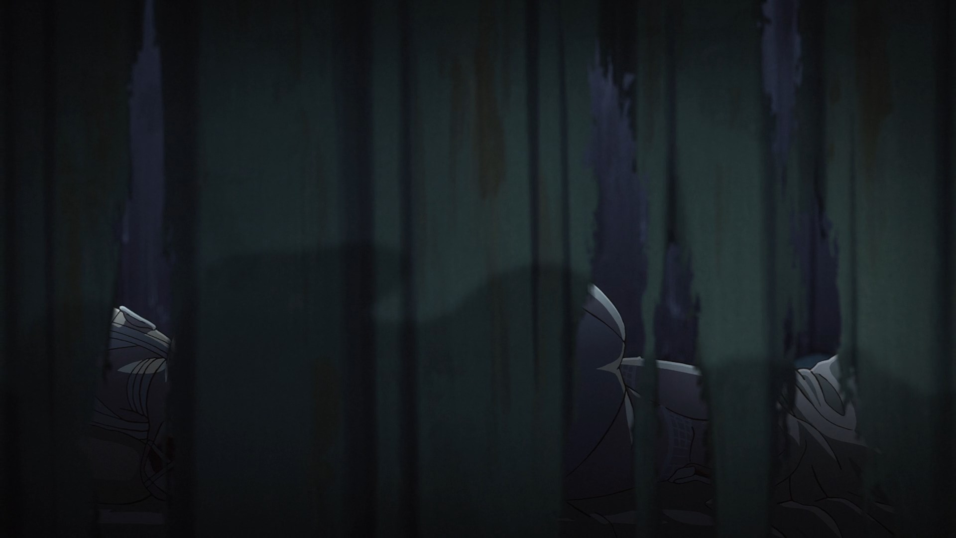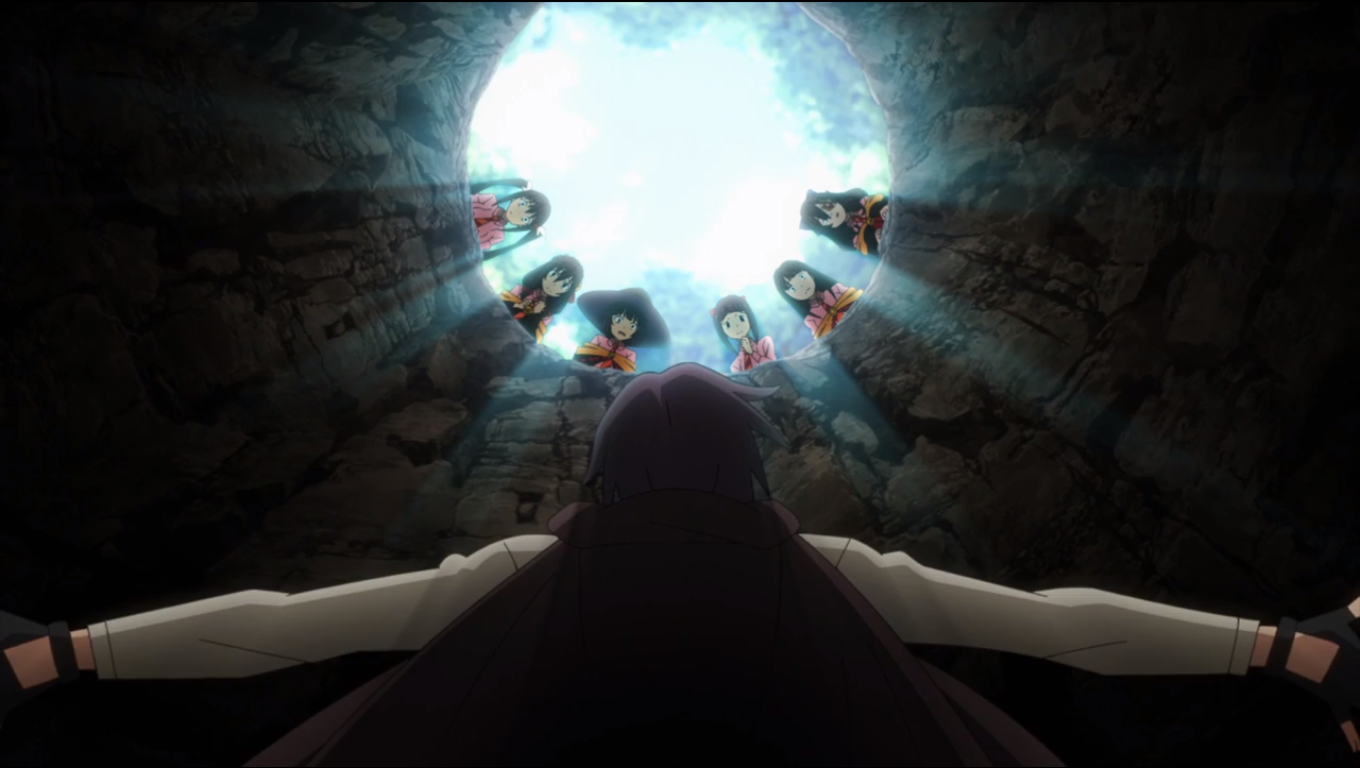 Нет, все же залупа какая-то. Только усилилось ощущение любительского характера всего этого, и чувство постороннего - ну словно ты в чужой тебе компании оказался - все что-то шутят, мемсами и отсылками перекидываются и хихикают, а ты не то, чтобы не понимаешь отсылок и культурный контекст, но просто веселым все происходящее не кажется. В общем опенинг и эндинг видимо останутся лучшим, что тайтлу есть предложить - тут, кстати, поработал Тайки Конно, выходец из Шафта, с его очень характерным художественным стилем, лучше всего известным по второму эпизоду Онимоногатари с длинными полотнами истории Шинобу. Дроп