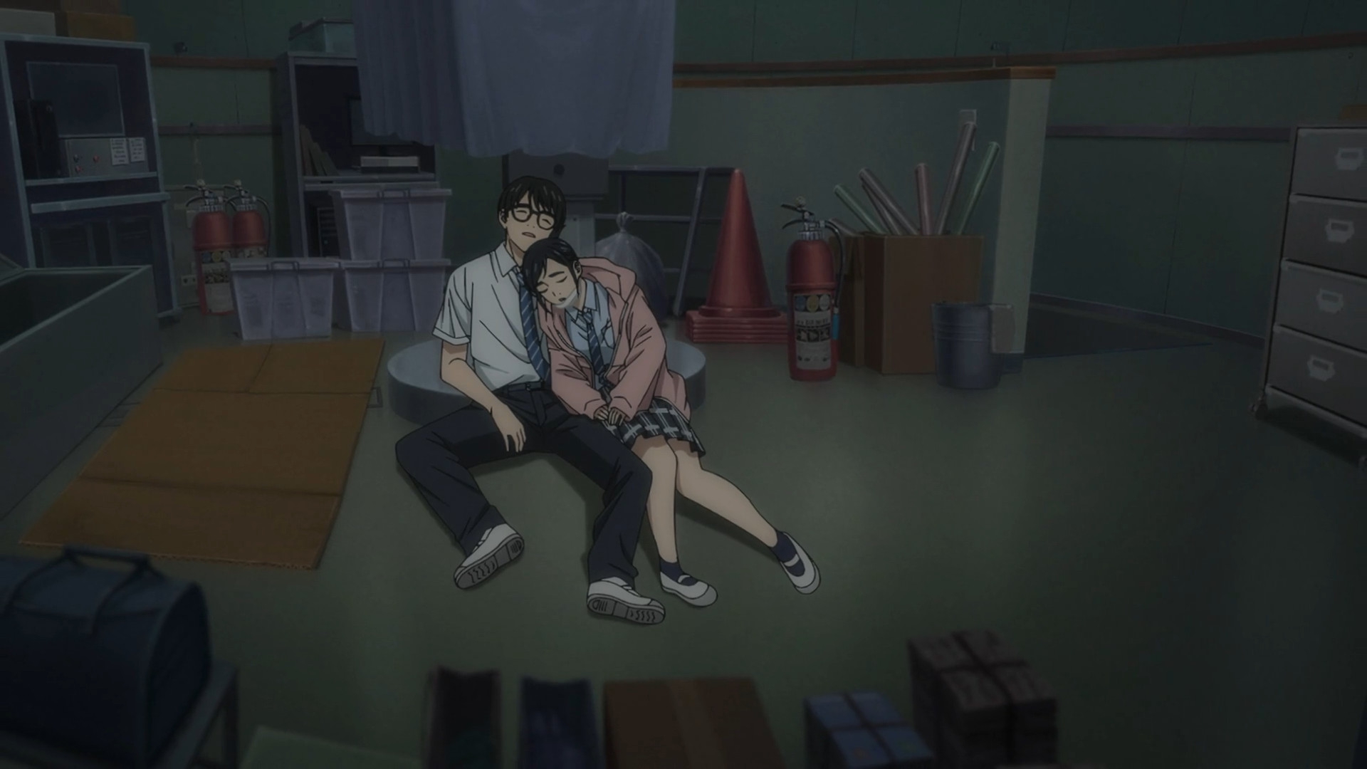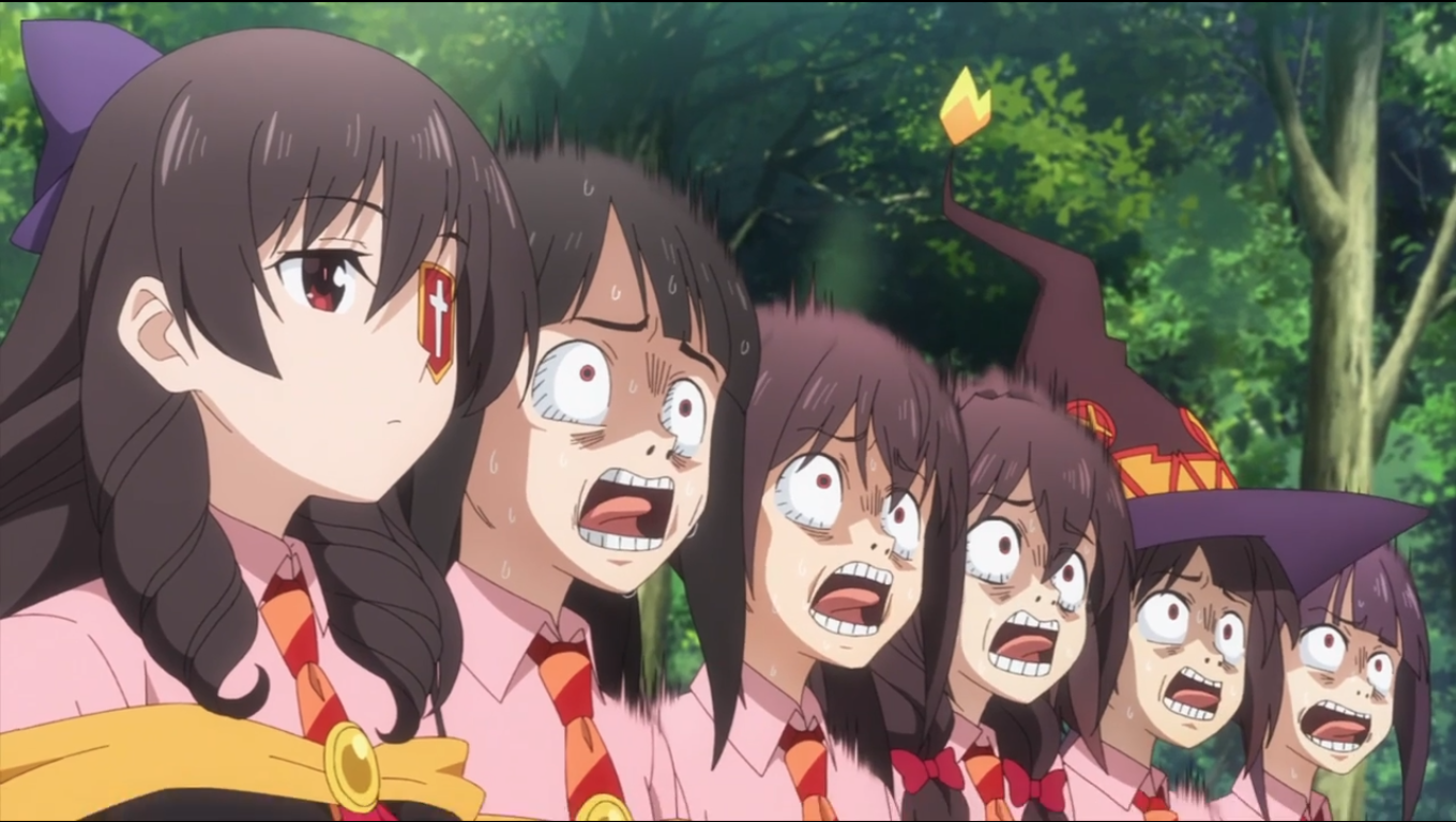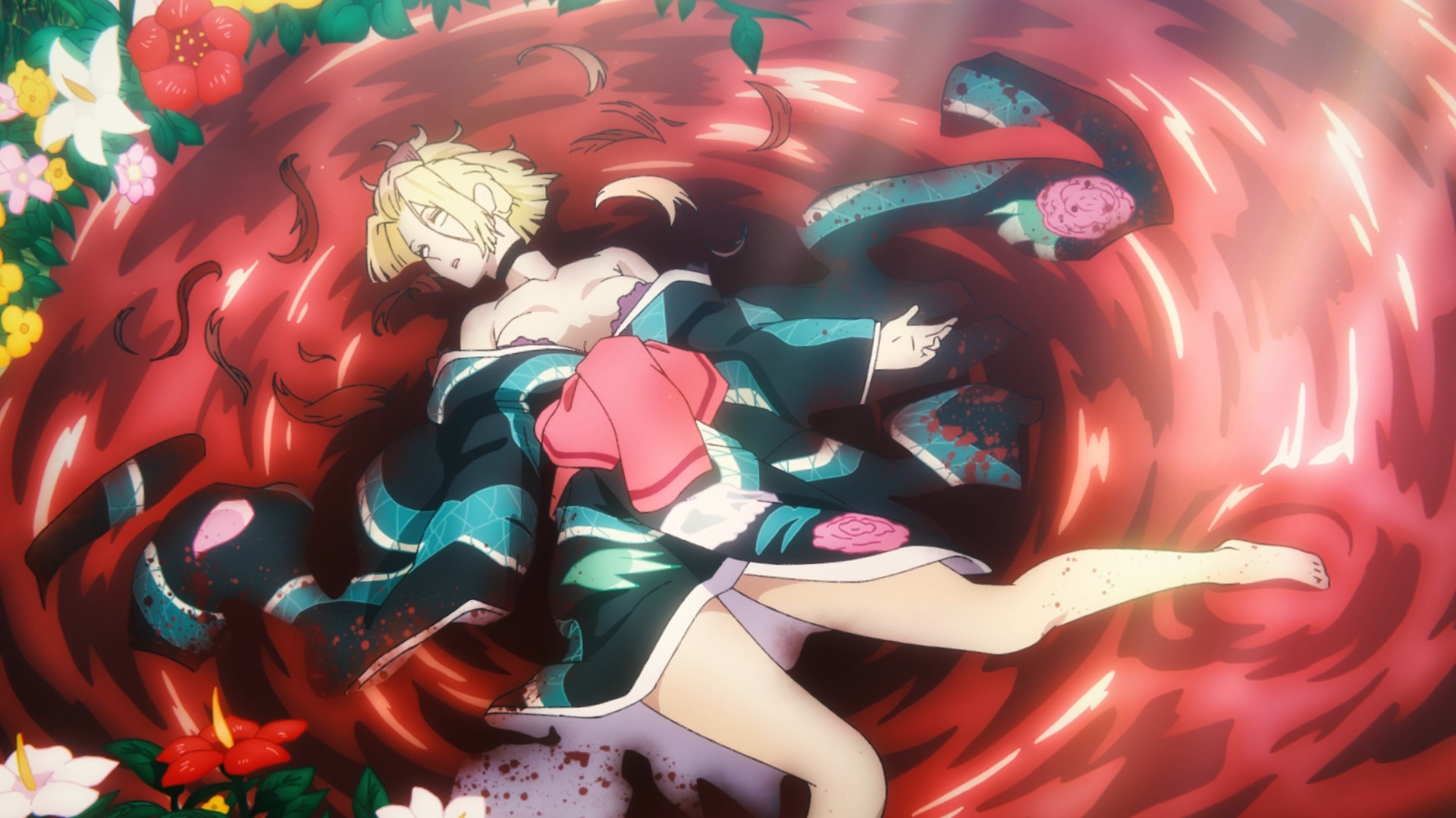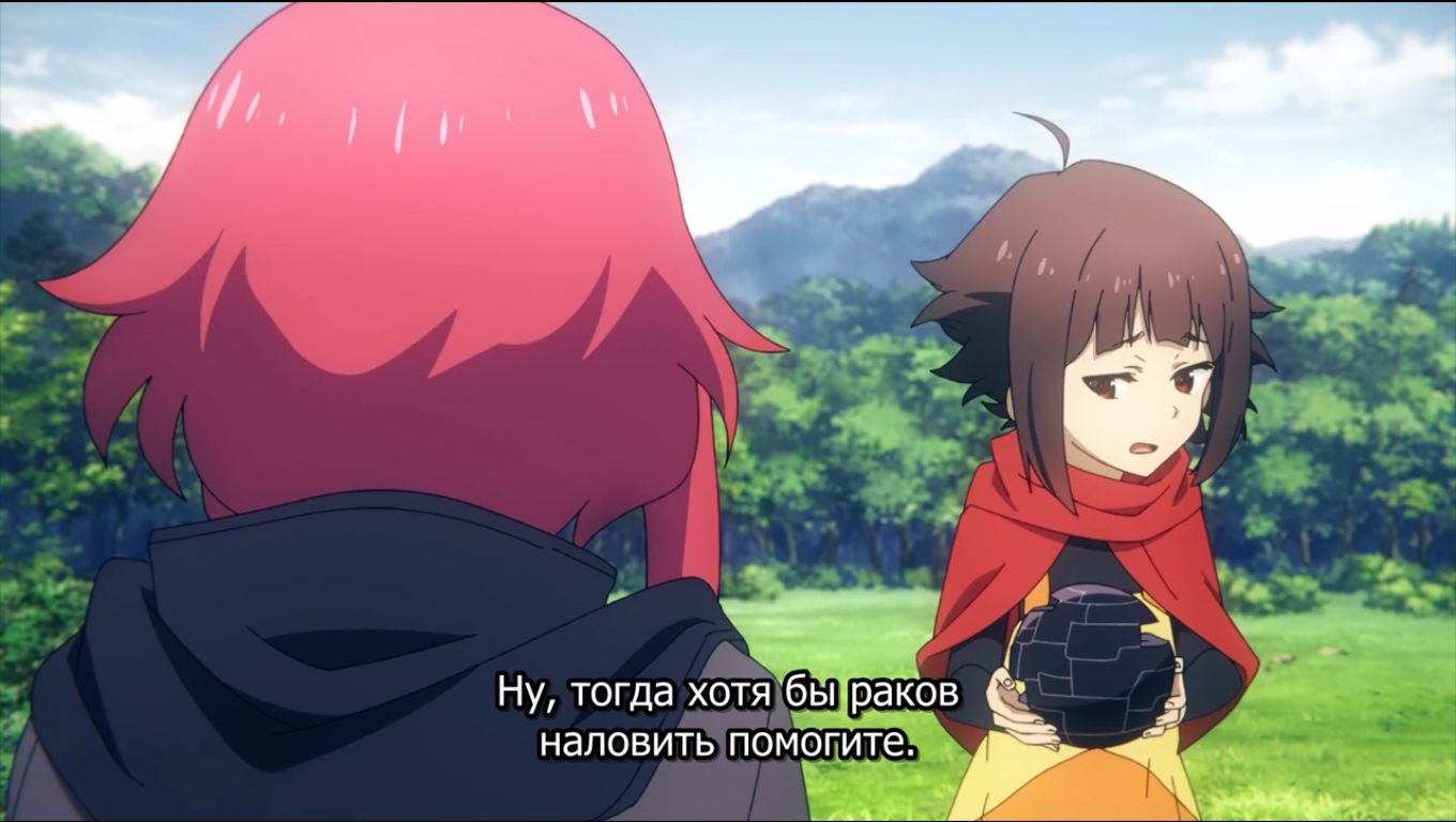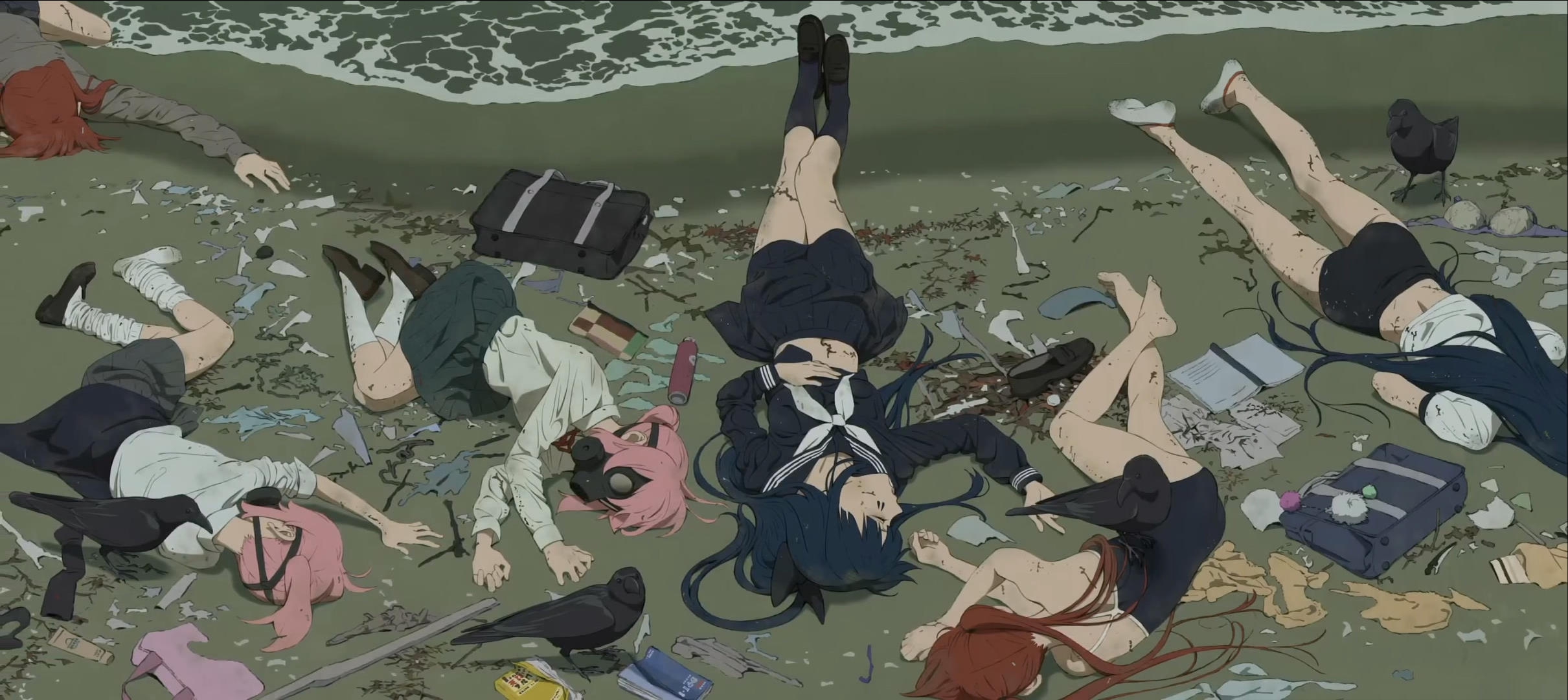 Нет, все же залупа какая-то. Только усилилось ощущение любительского характера всего этого, и чувство постороннего - ну словно ты в чужой тебе компании оказался - все что-то шутят, мемсами и отсылками перекидываются и хихикают, а ты не то, чтобы не понимаешь отсылок и культурный контекст, но просто веселым все происходящее не кажется. В общем опенинг и эндинг видимо останутся лучшим, что тайтлу есть предложить - тут, кстати, поработал Тайки Конно, выходец из Шафта, с его очень характерным художественным стилем, лучше всего известным по второму эпизоду Онимоногатари с длинными полотнами истории Шинобу. Дроп