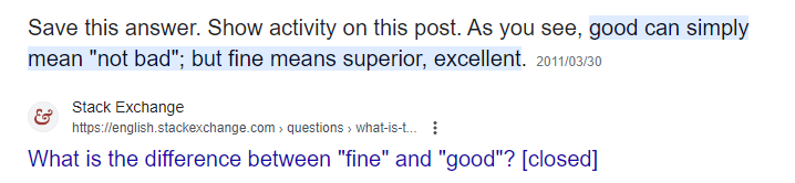 >>173748 >А почему у них fine меньше good (см. пики)? По-моему в неформальном английском часто говорят, например, it was fine, в значении типа нормас, но до "хорошо" не дотягивает. Decent вон как синоним, подходит >"Good" is an expression used to something that makes the person/thing feel pleasant, whereas "fine" has dual (two) meaning(s), it can also be an expression word, meaning something is decent, expendable, or great but it can also mean "very small". >When describing your emotions, “fine” is less positive (not bad though, but more neutral than “good”)