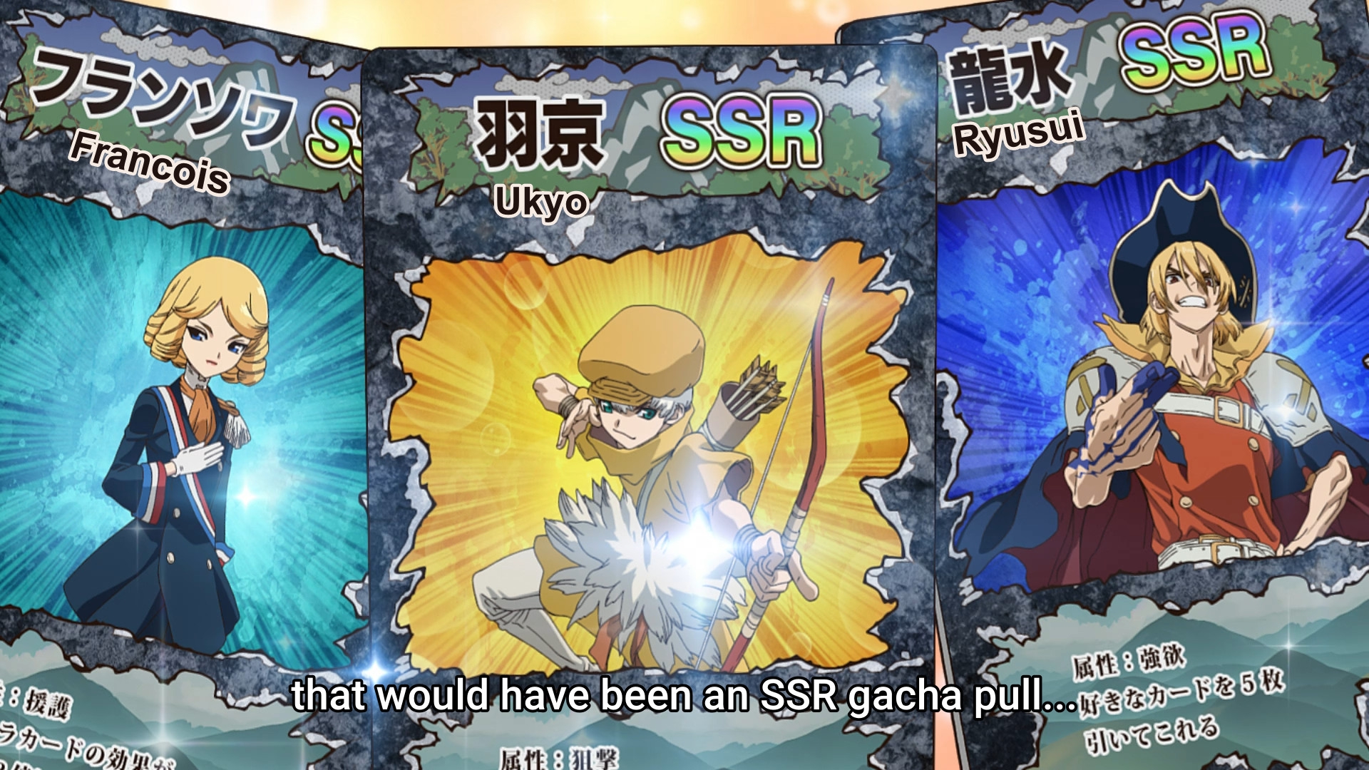 Вот чего-то такого я ждал с самого начала, а не все эти школьные замуты. В конце концов первый сезон мне полюбился именно этим. >>174846 Да не, просто аналогию провели. Видимо кто-то гачами увлекался в прошлой жизни.