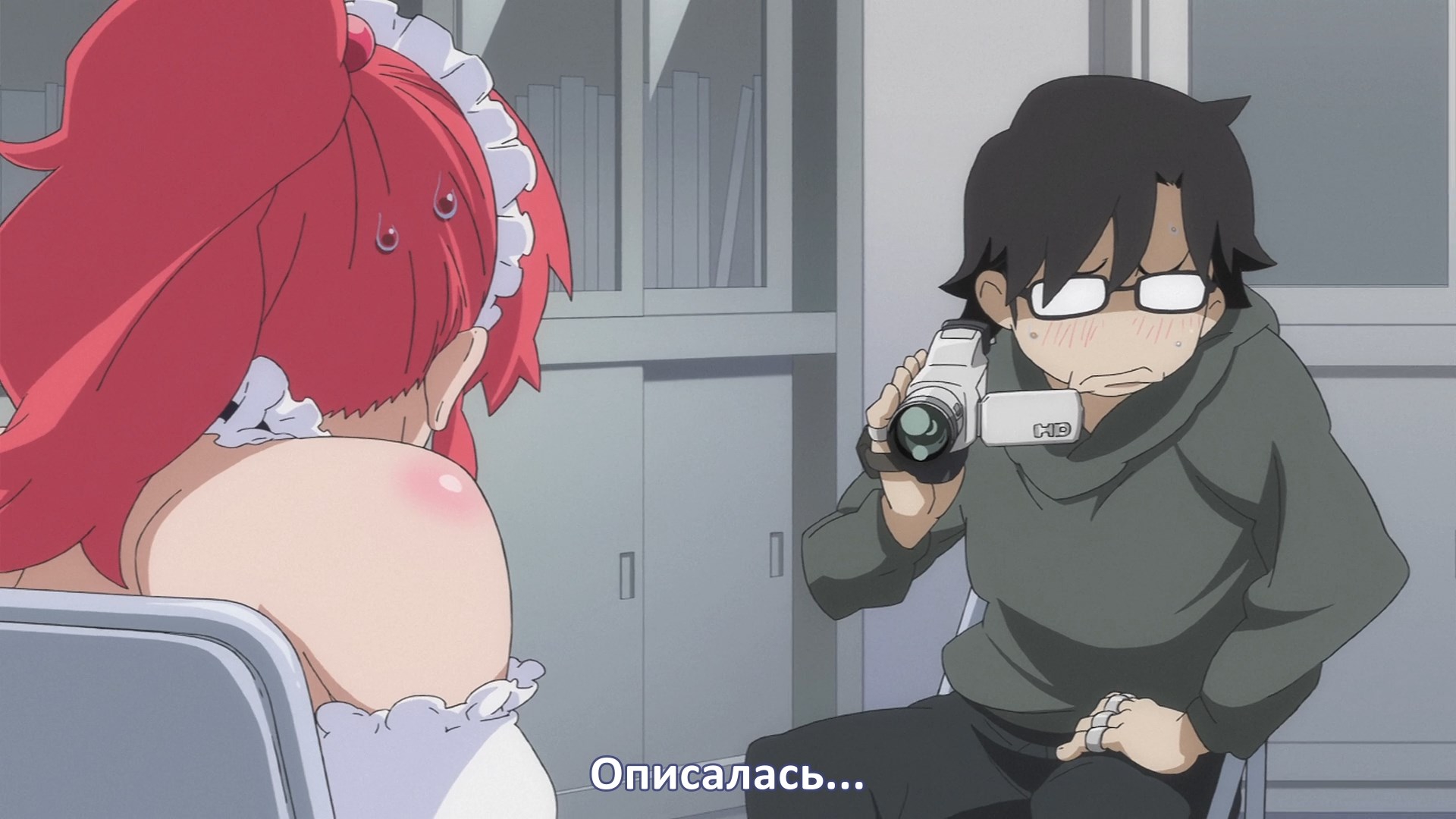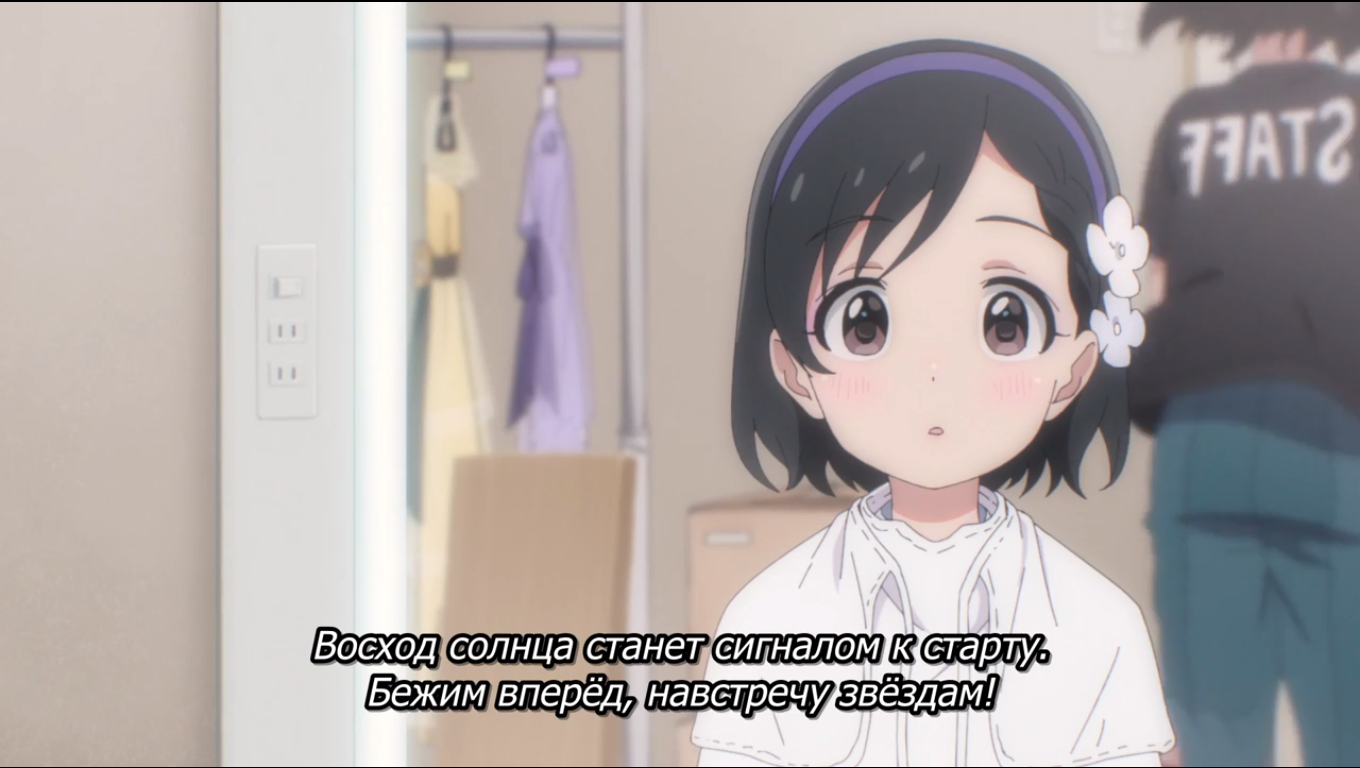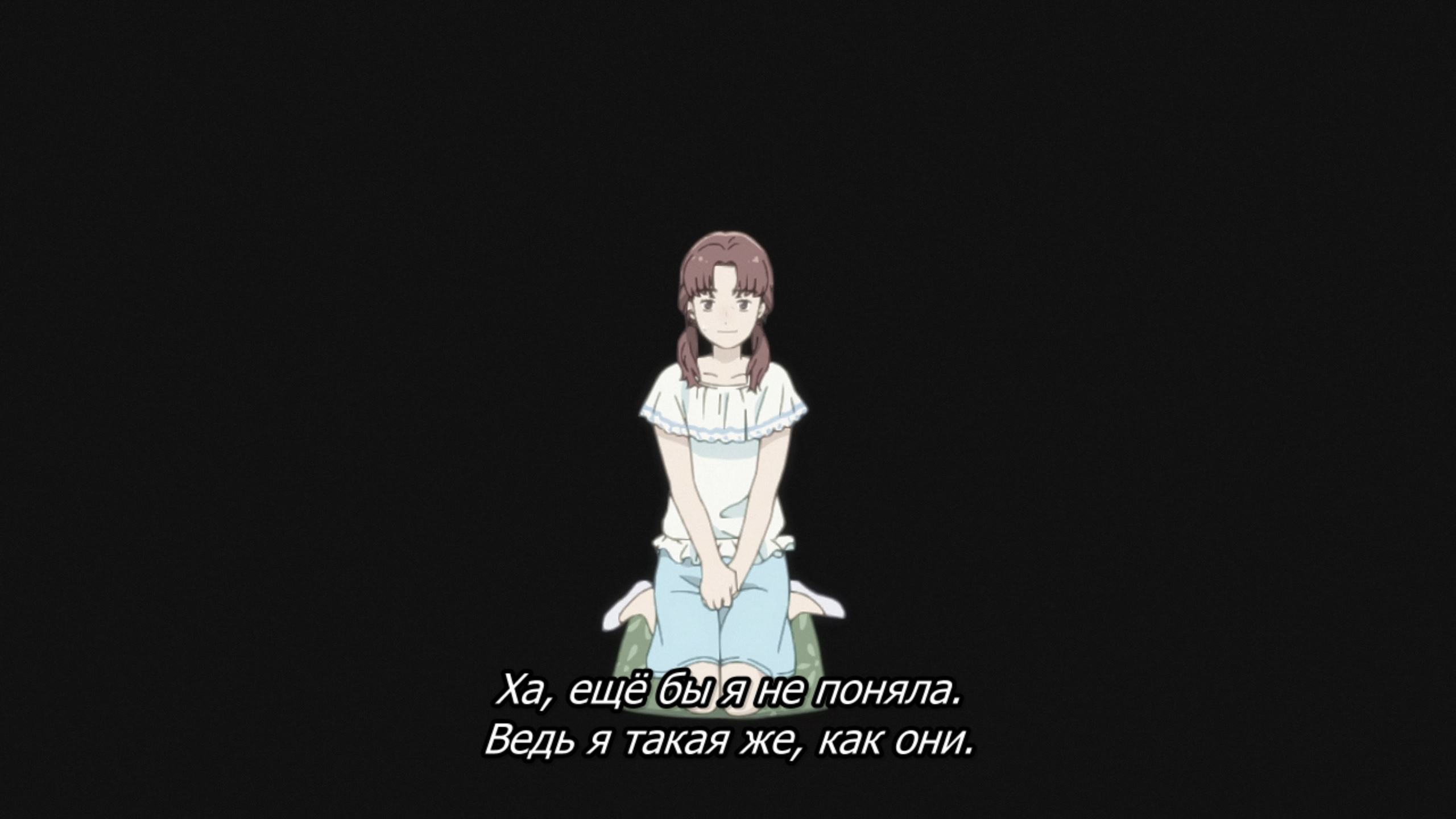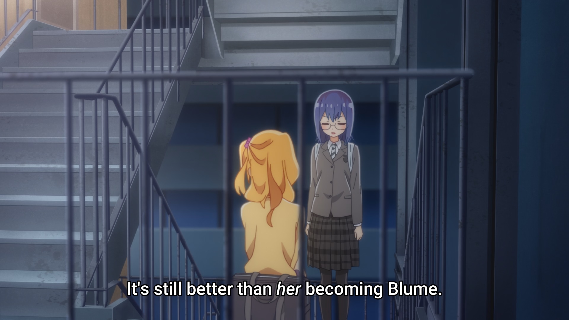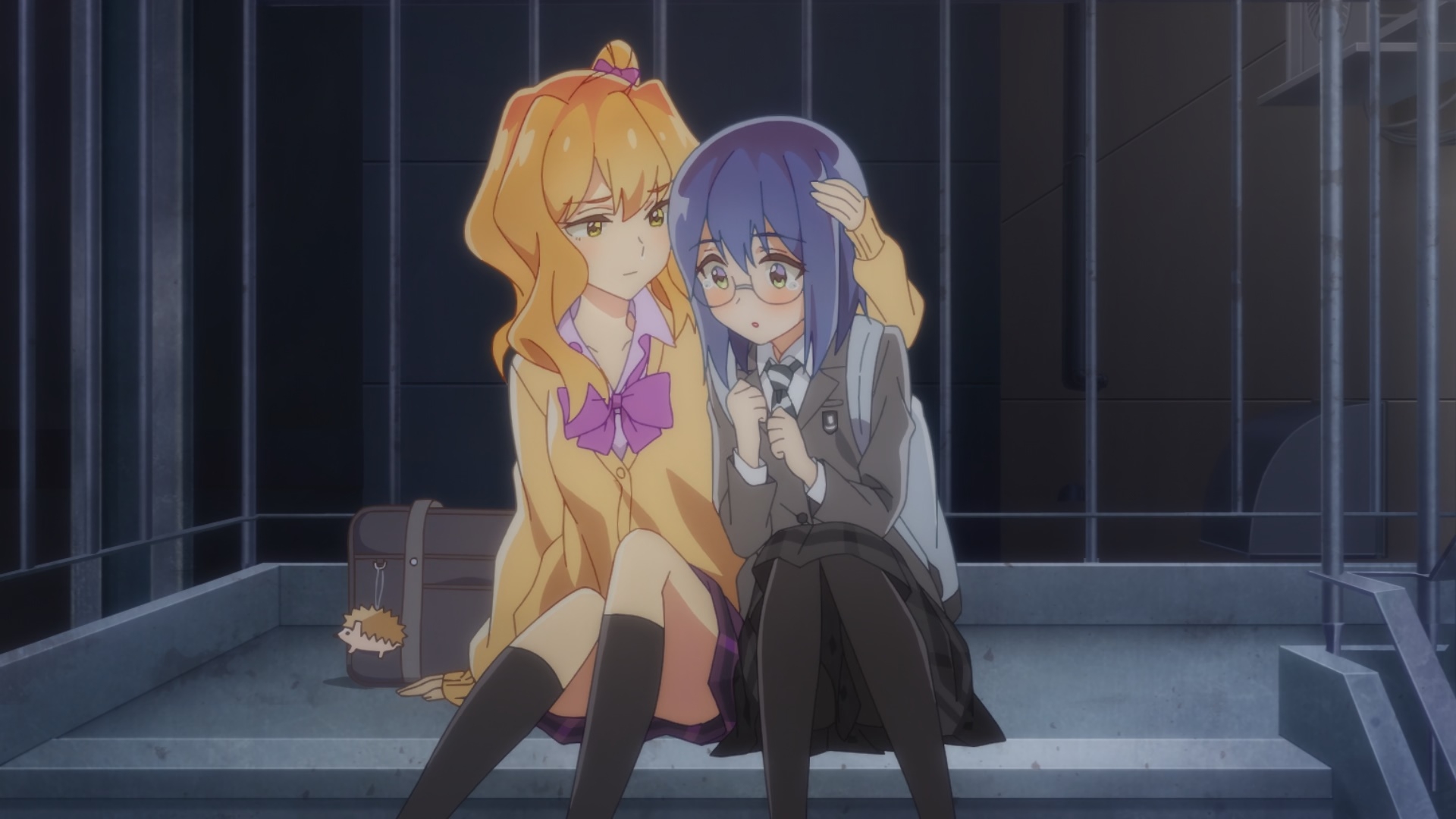 Пиздец, они сидели вдвоём на лестнице и говорили, и тут у этой пизды начинается приход, она видит свою любимую химечан и начинает плакать и с ней разговаривать. Я бы на месте гяру встал и ушёл бы, просто нахуй надо каких-то ебанашек успокаивать. Вот реально, это же до чего нужно было дойти, чтобы юри-тайтл исключительно бугурт и негатив вызывал. Но у этого мультика получилось.