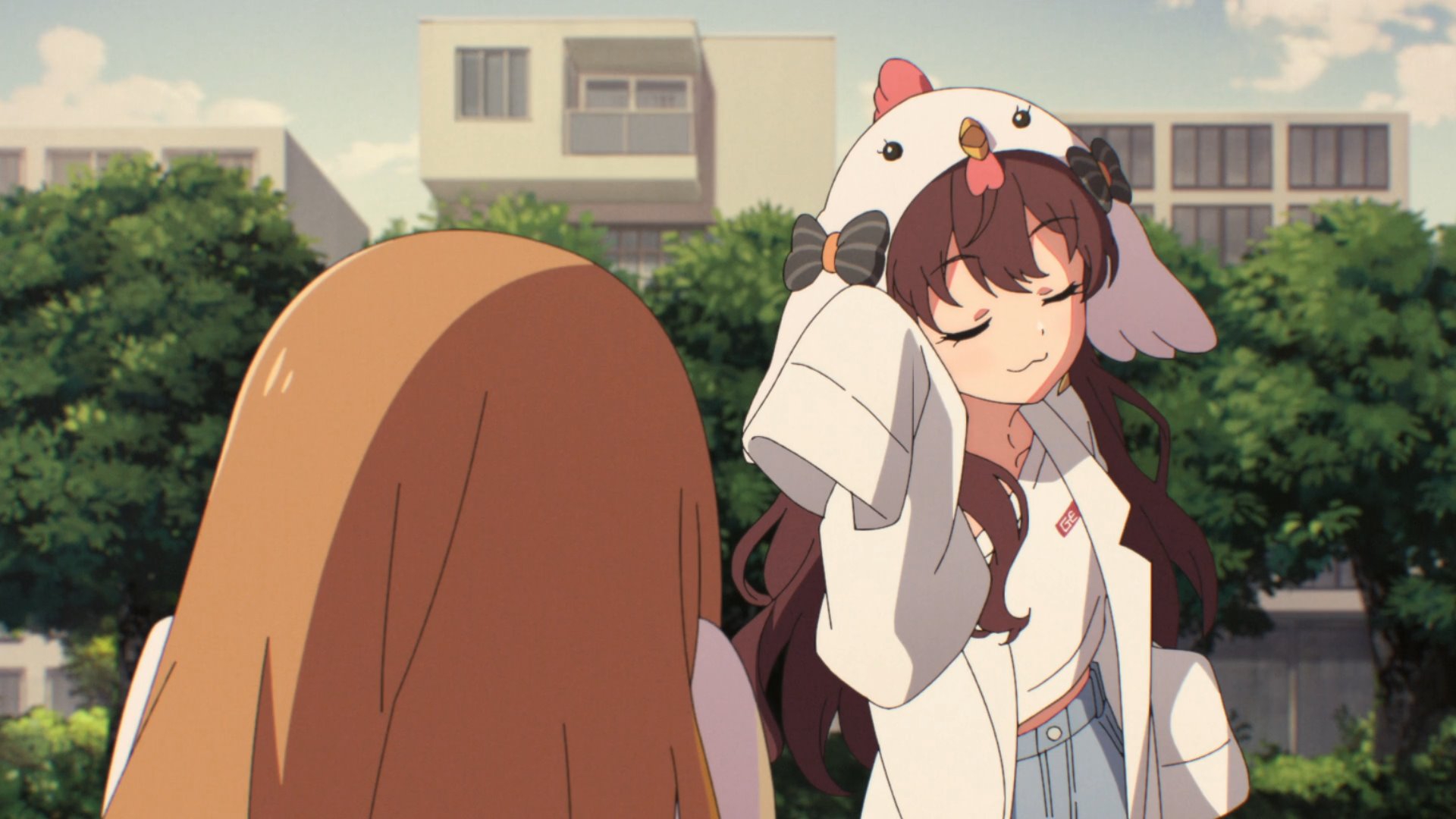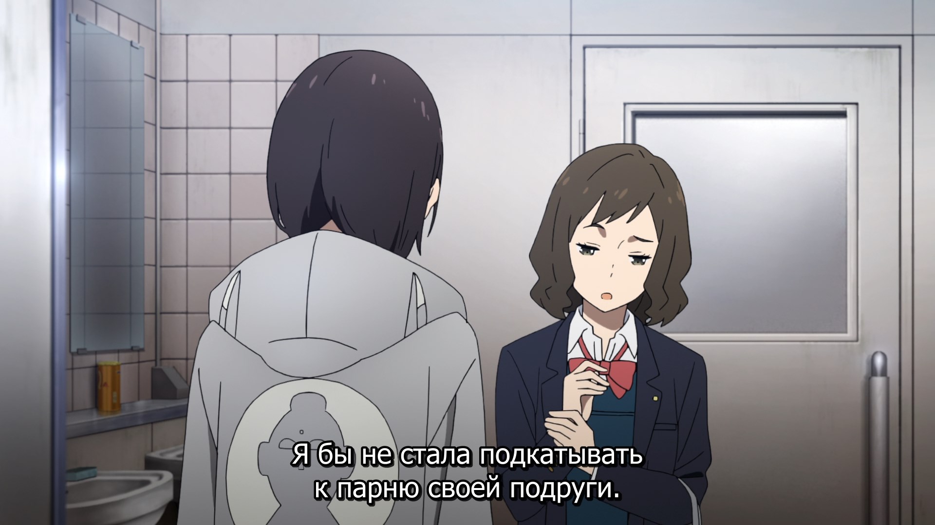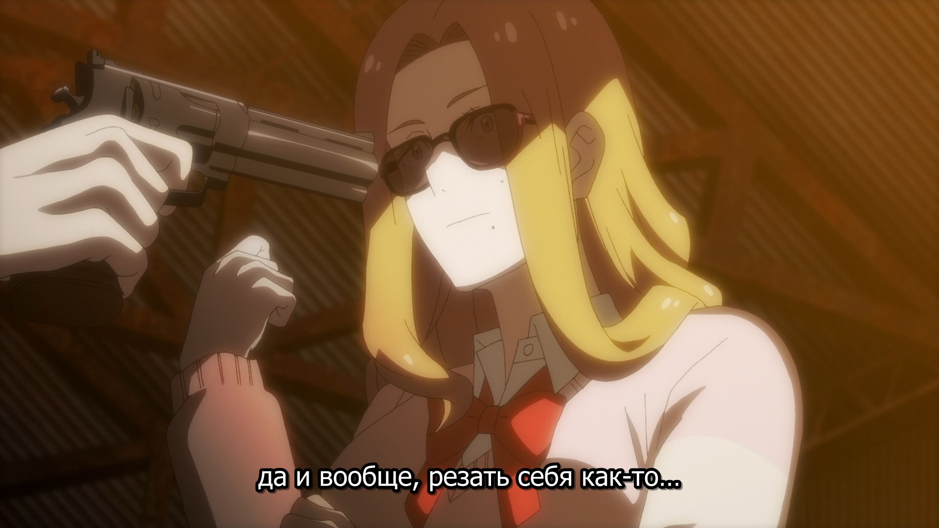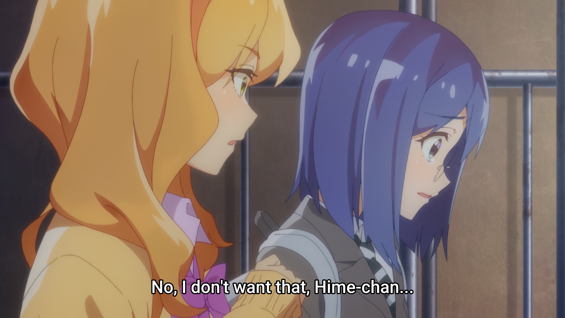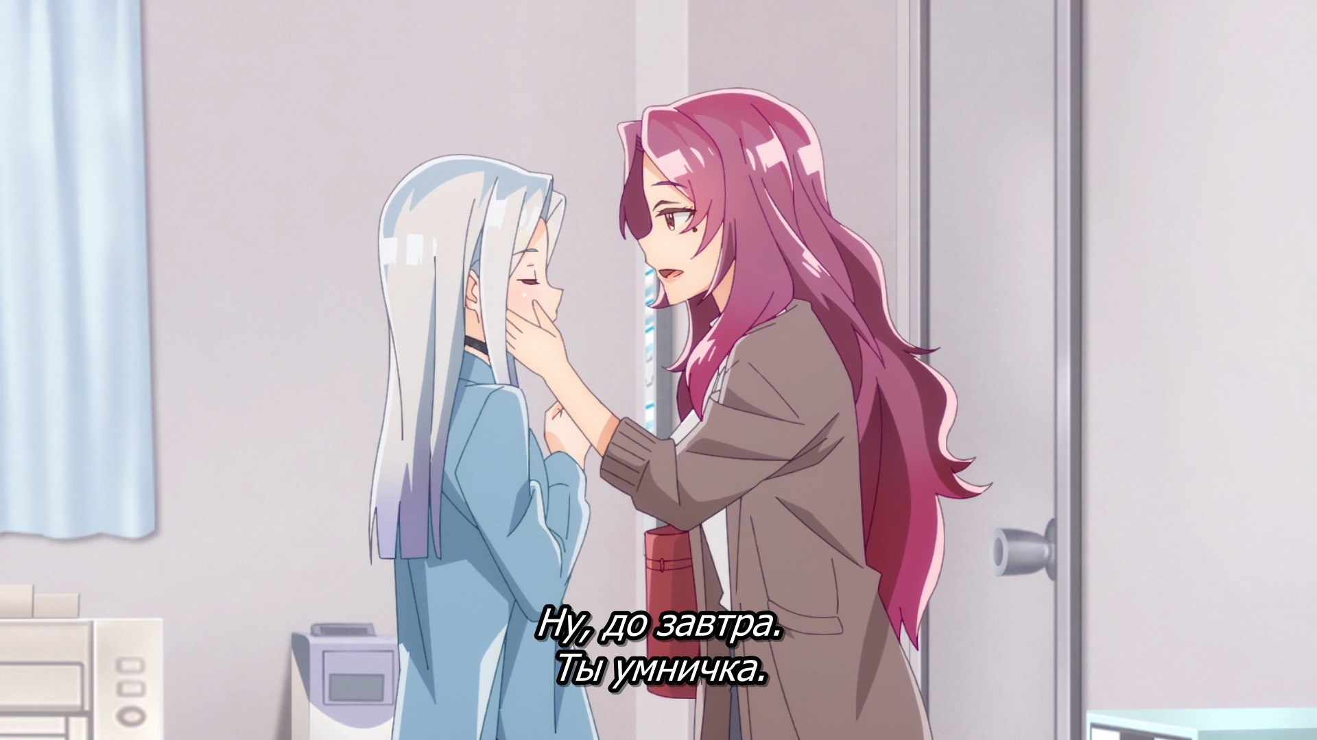 Пиздец, они сидели вдвоём на лестнице и говорили, и тут у этой пизды начинается приход, она видит свою любимую химечан и начинает плакать и с ней разговаривать. Я бы на месте гяру встал и ушёл бы, просто нахуй надо каких-то ебанашек успокаивать. Вот реально, это же до чего нужно было дойти, чтобы юри-тайтл исключительно бугурт и негатив вызывал. Но у этого мультика получилось.