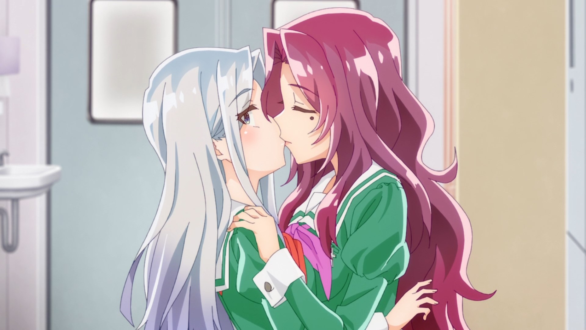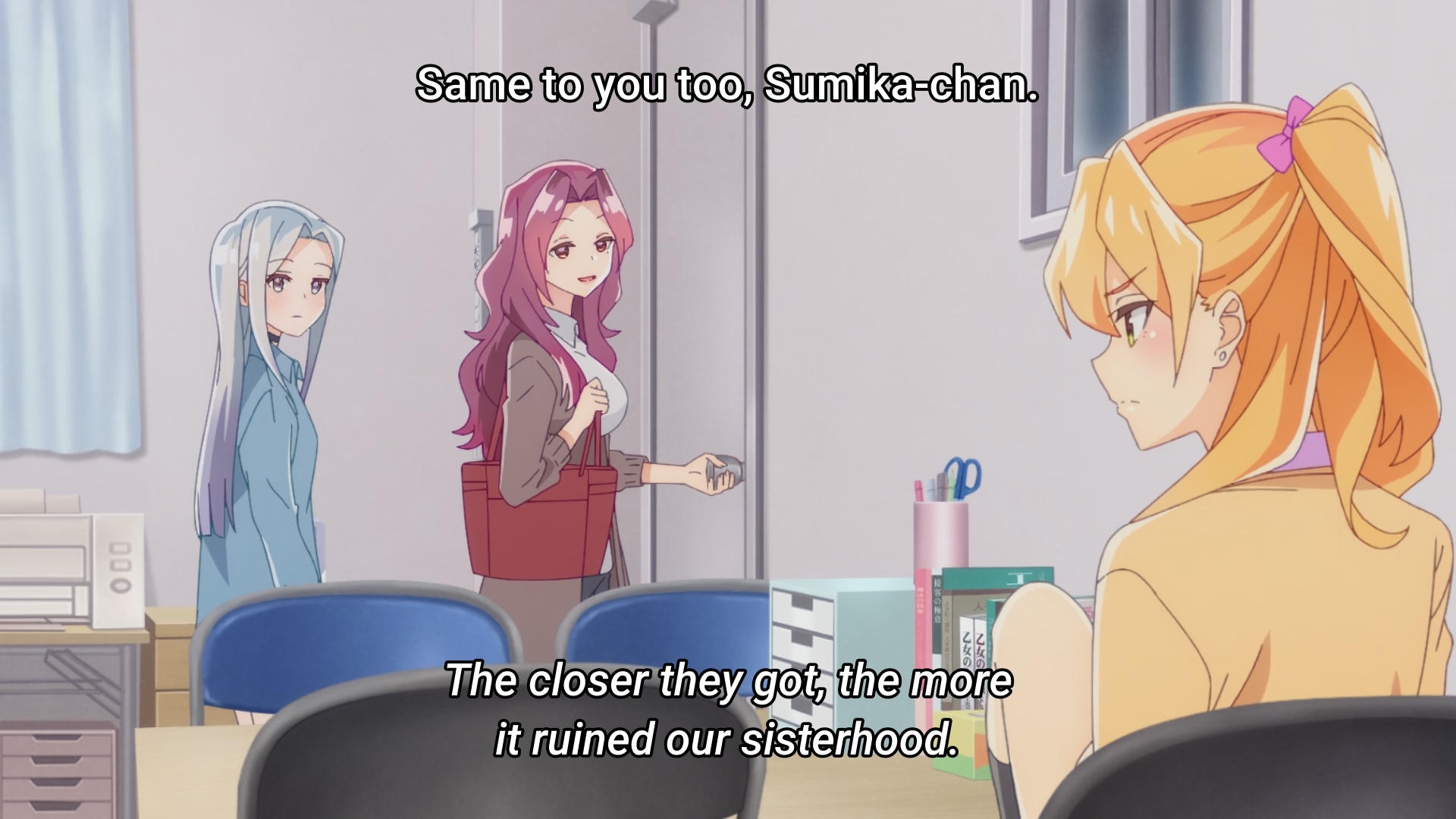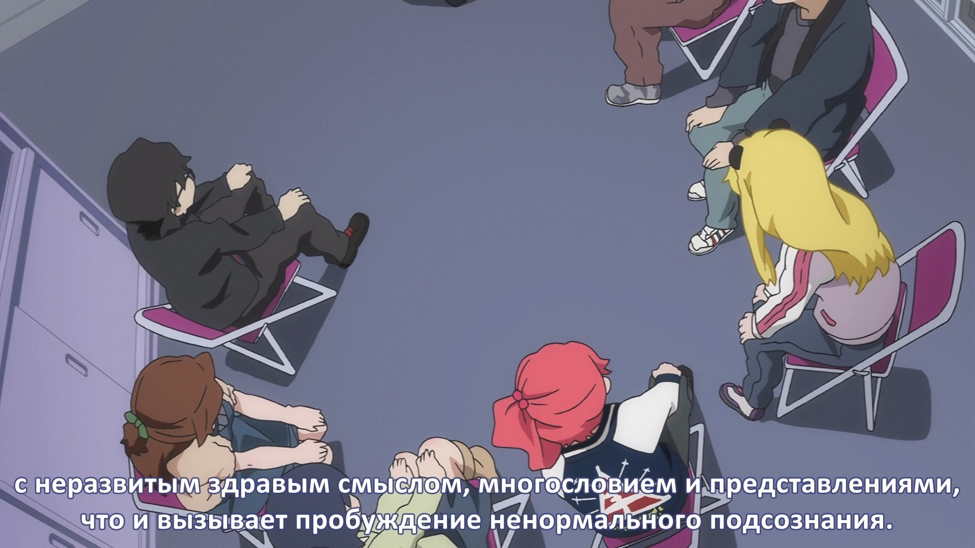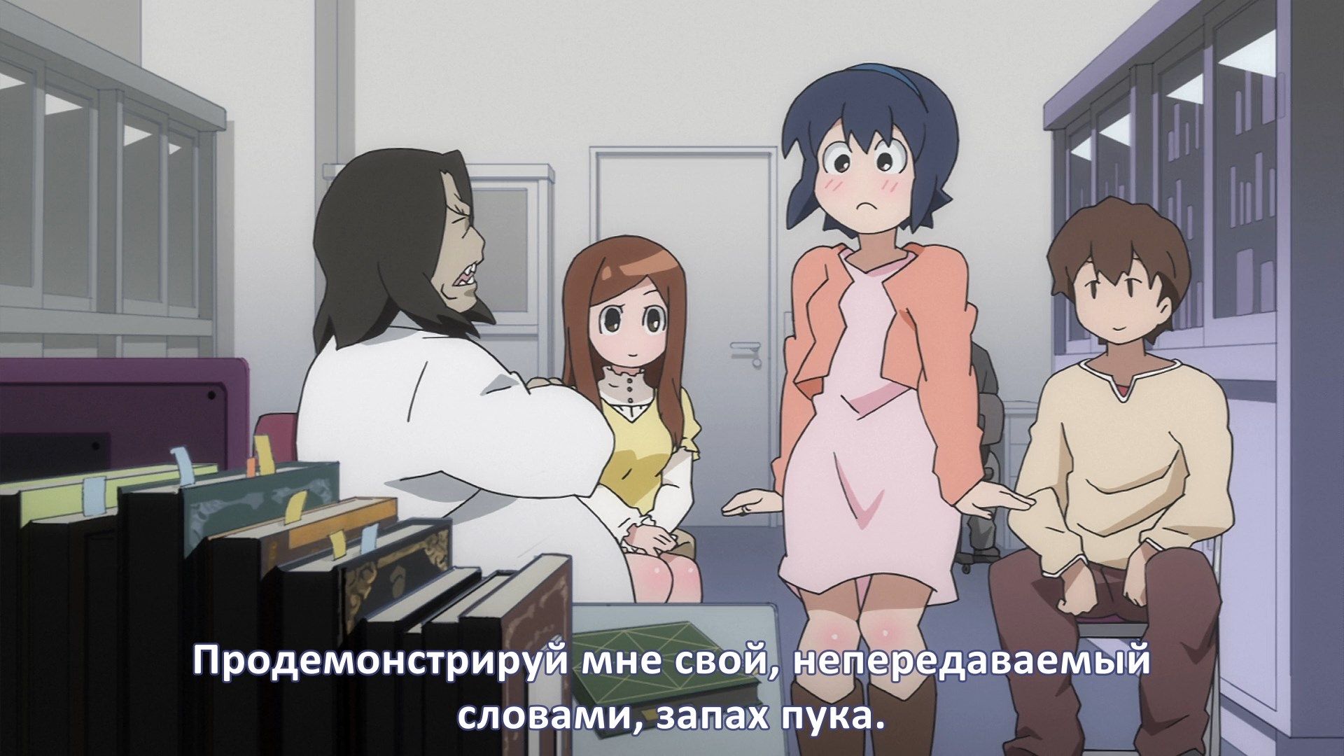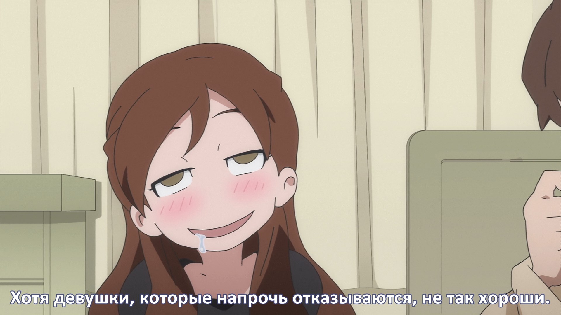 Пиздец, они сидели вдвоём на лестнице и говорили, и тут у этой пизды начинается приход, она видит свою любимую химечан и начинает плакать и с ней разговаривать. Я бы на месте гяру встал и ушёл бы, просто нахуй надо каких-то ебанашек успокаивать. Вот реально, это же до чего нужно было дойти, чтобы юри-тайтл исключительно бугурт и негатив вызывал. Но у этого мультика получилось.