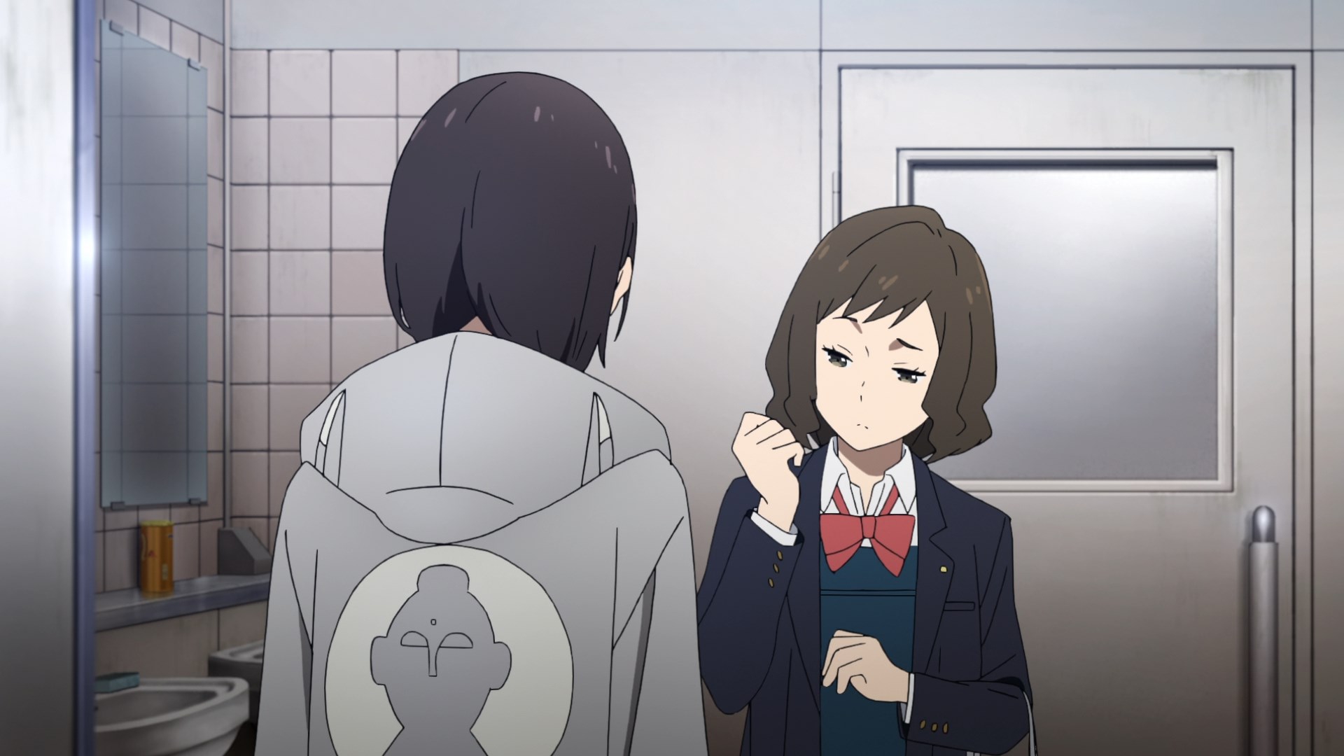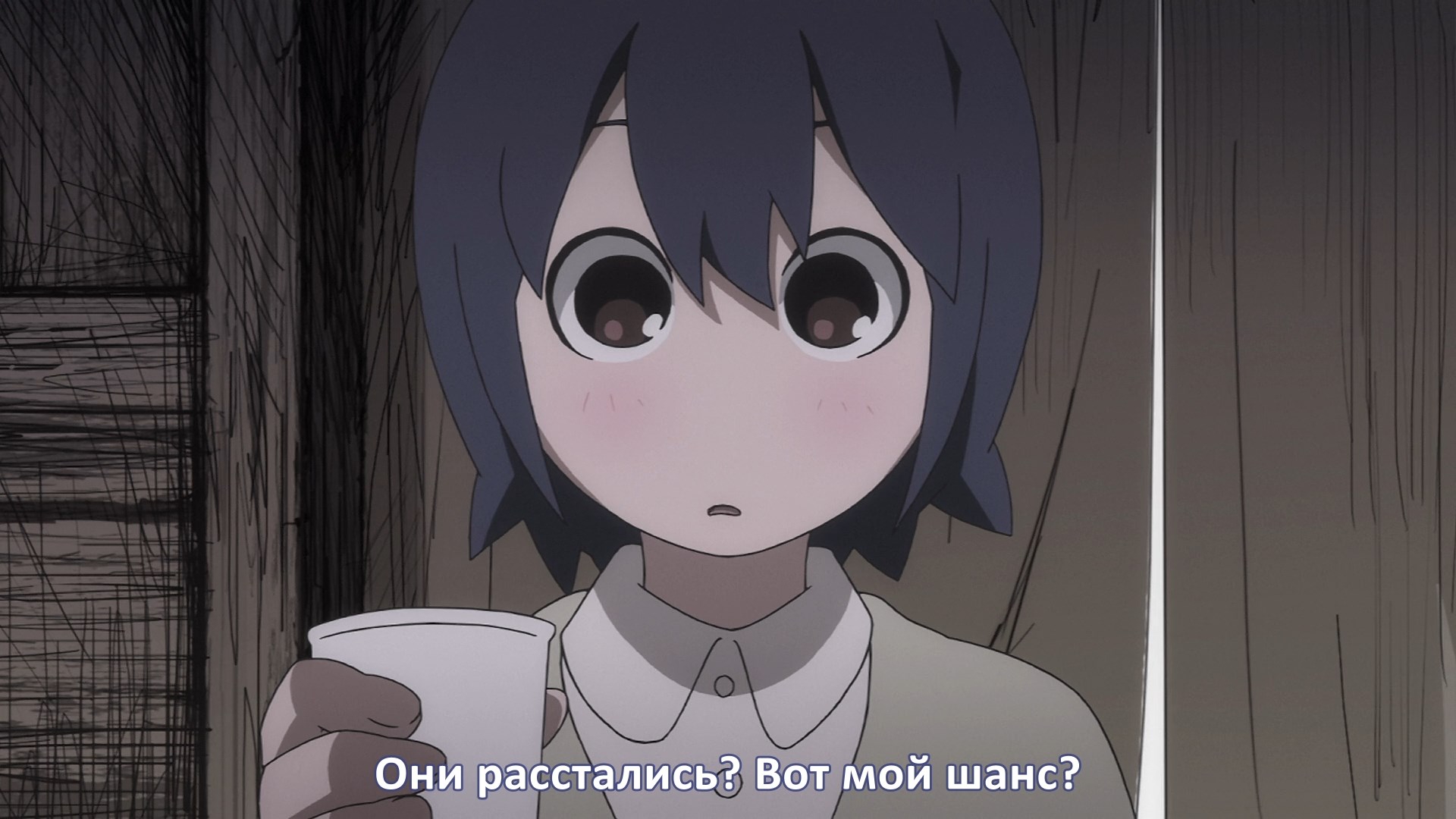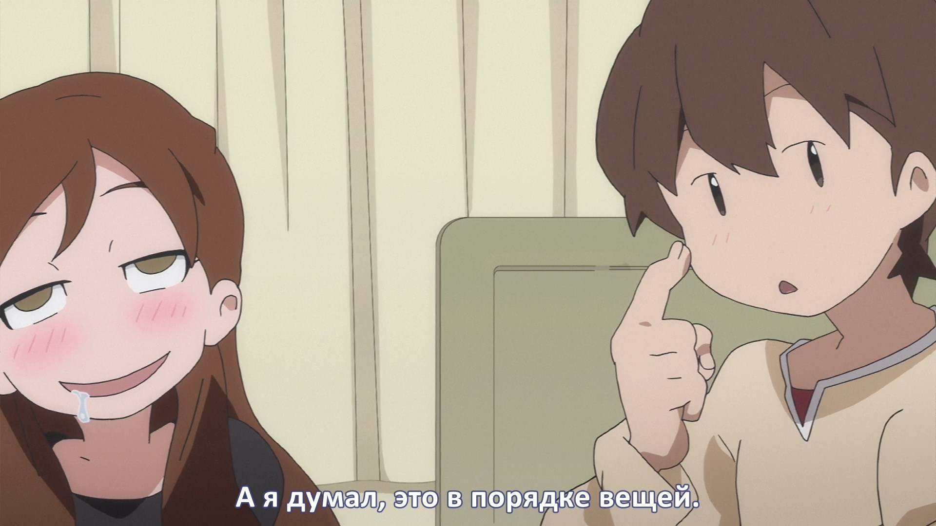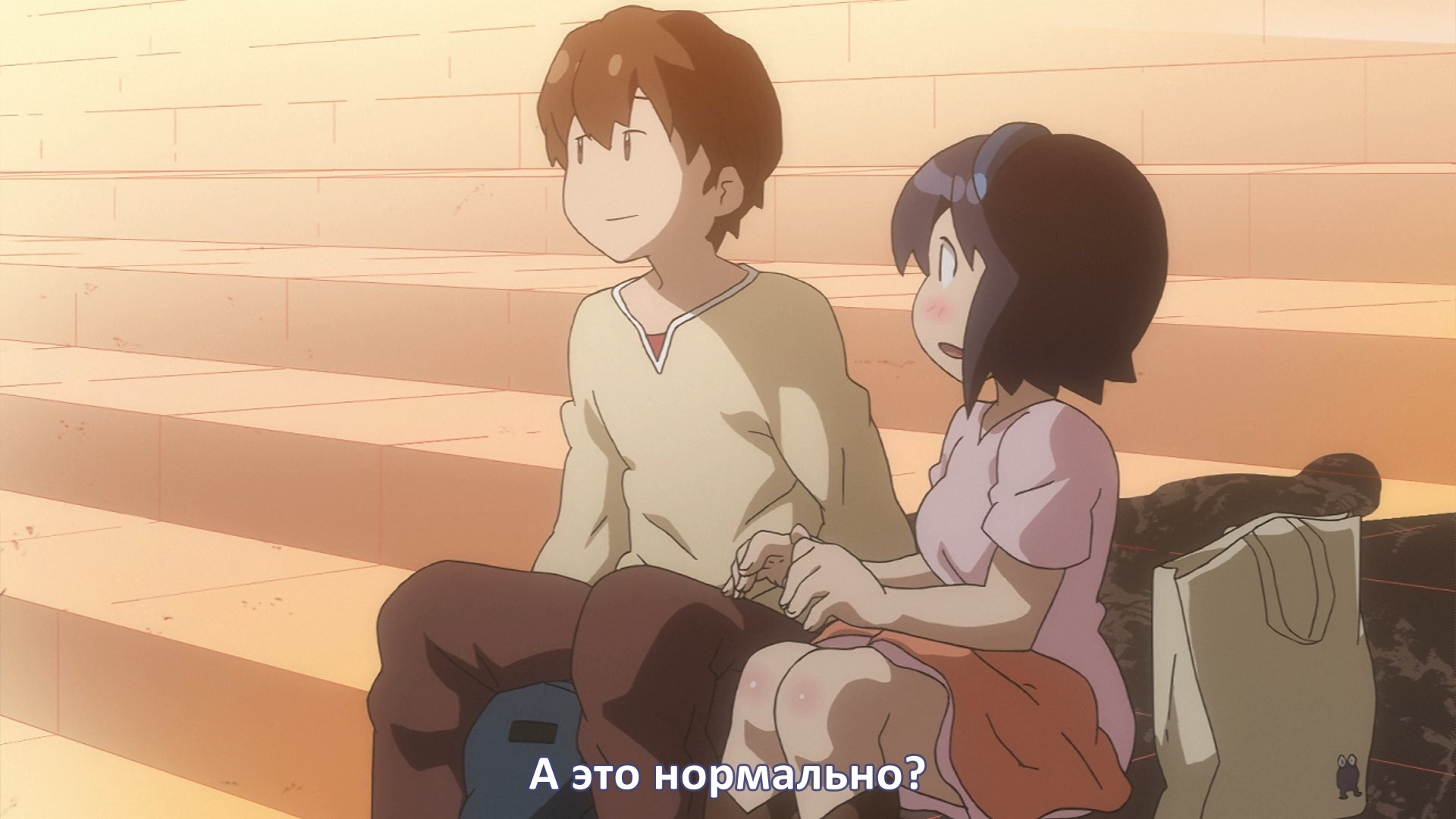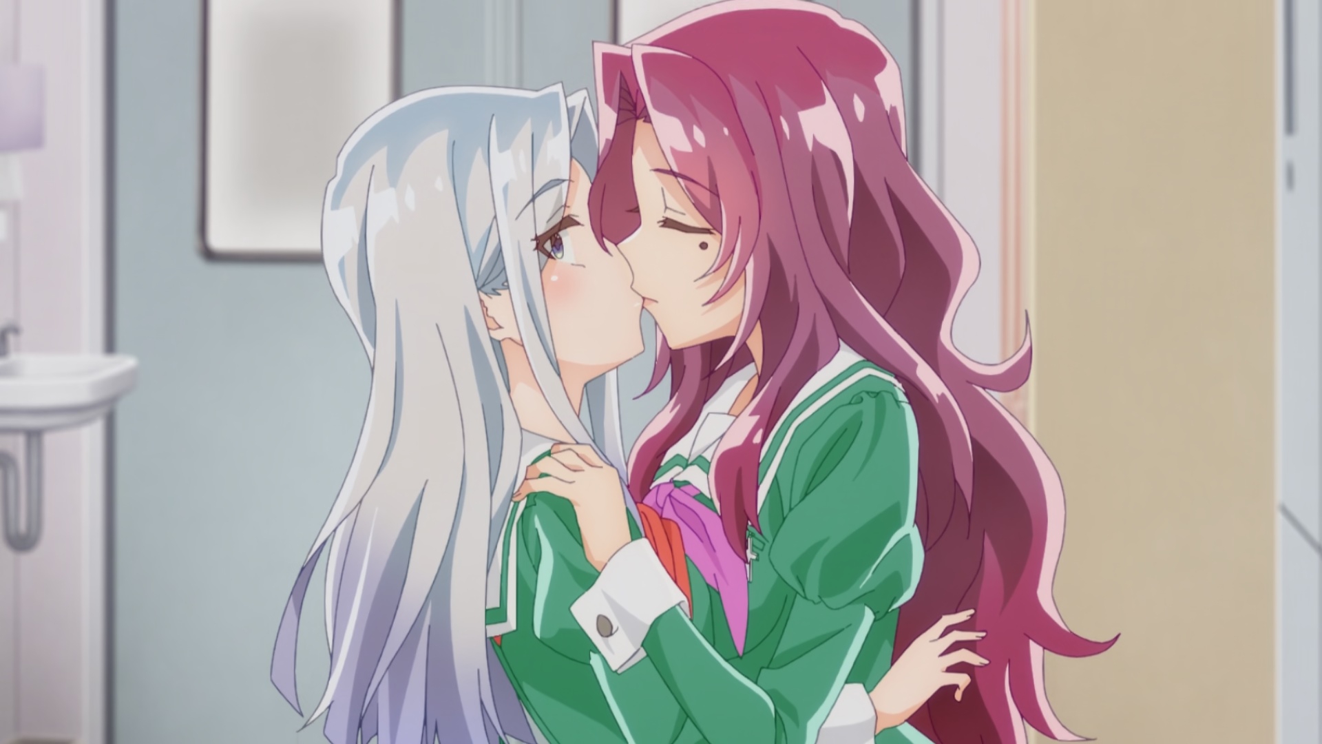 Пиздец, они сидели вдвоём на лестнице и говорили, и тут у этой пизды начинается приход, она видит свою любимую химечан и начинает плакать и с ней разговаривать. Я бы на месте гяру встал и ушёл бы, просто нахуй надо каких-то ебанашек успокаивать. Вот реально, это же до чего нужно было дойти, чтобы юри-тайтл исключительно бугурт и негатив вызывал. Но у этого мультика получилось.