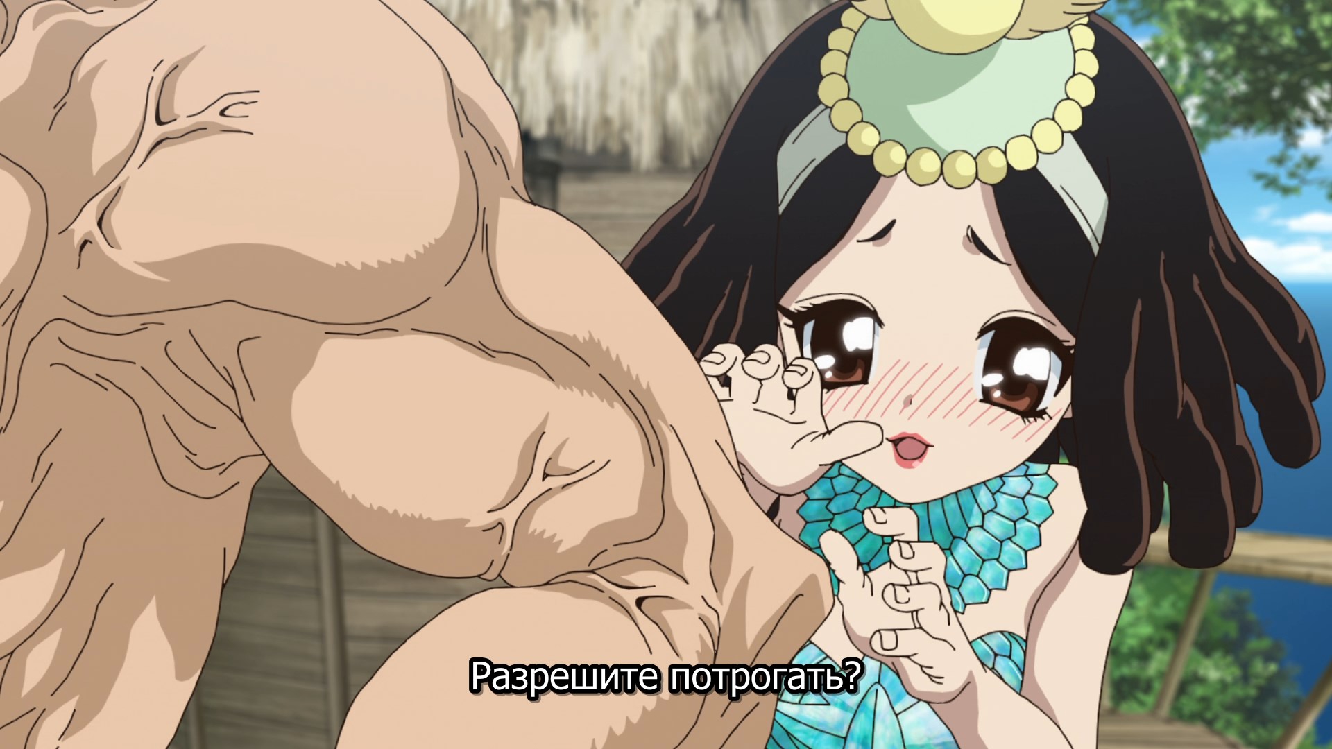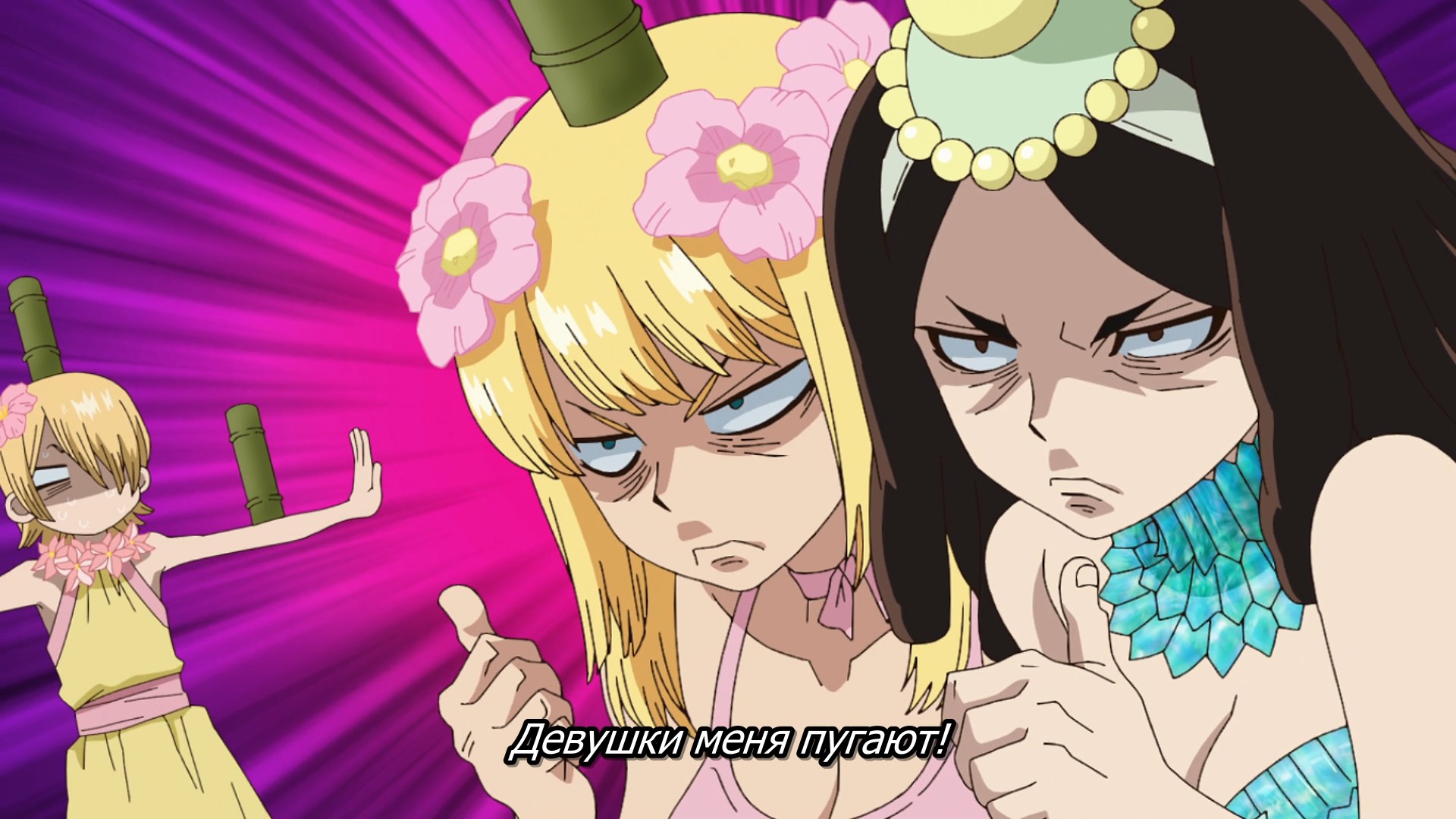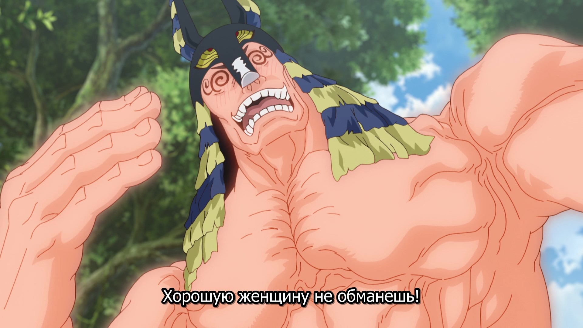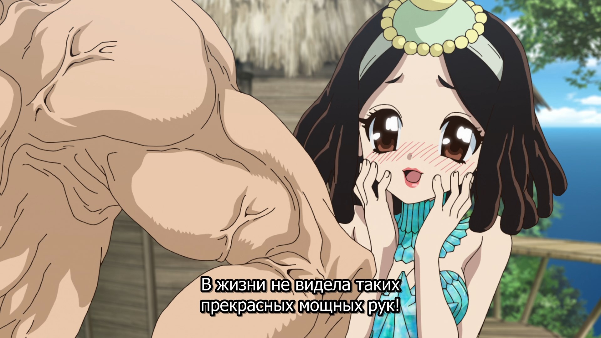 Потом когда они добрались уже до этого острова, у меня тут возникла по-моему очевидная мысль - Сенку буквально может создать что угодно, и оружие типа слезоточивого газа уже делал. Какого хуя он не делает какое-нибудь эффективное оружие против этого племени? Но вместо этого смехуешки с проникновением в деревню под видом наложниц