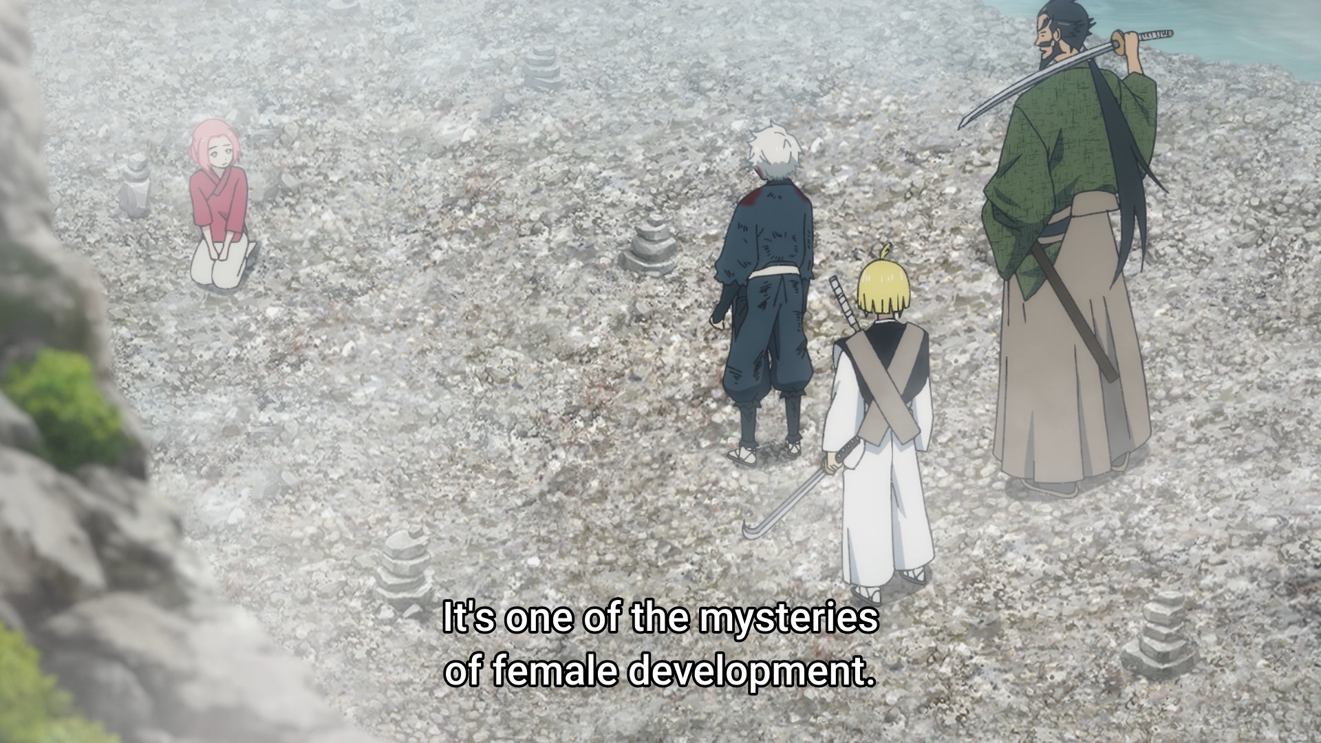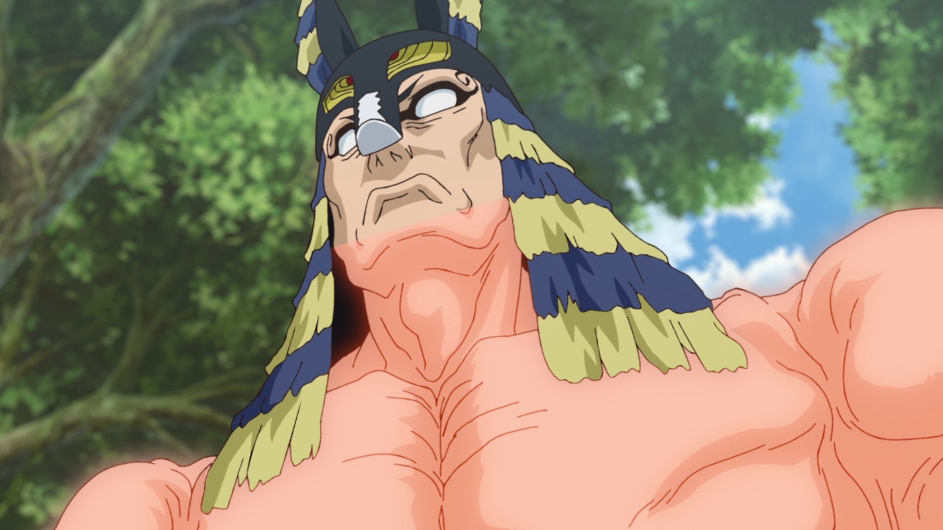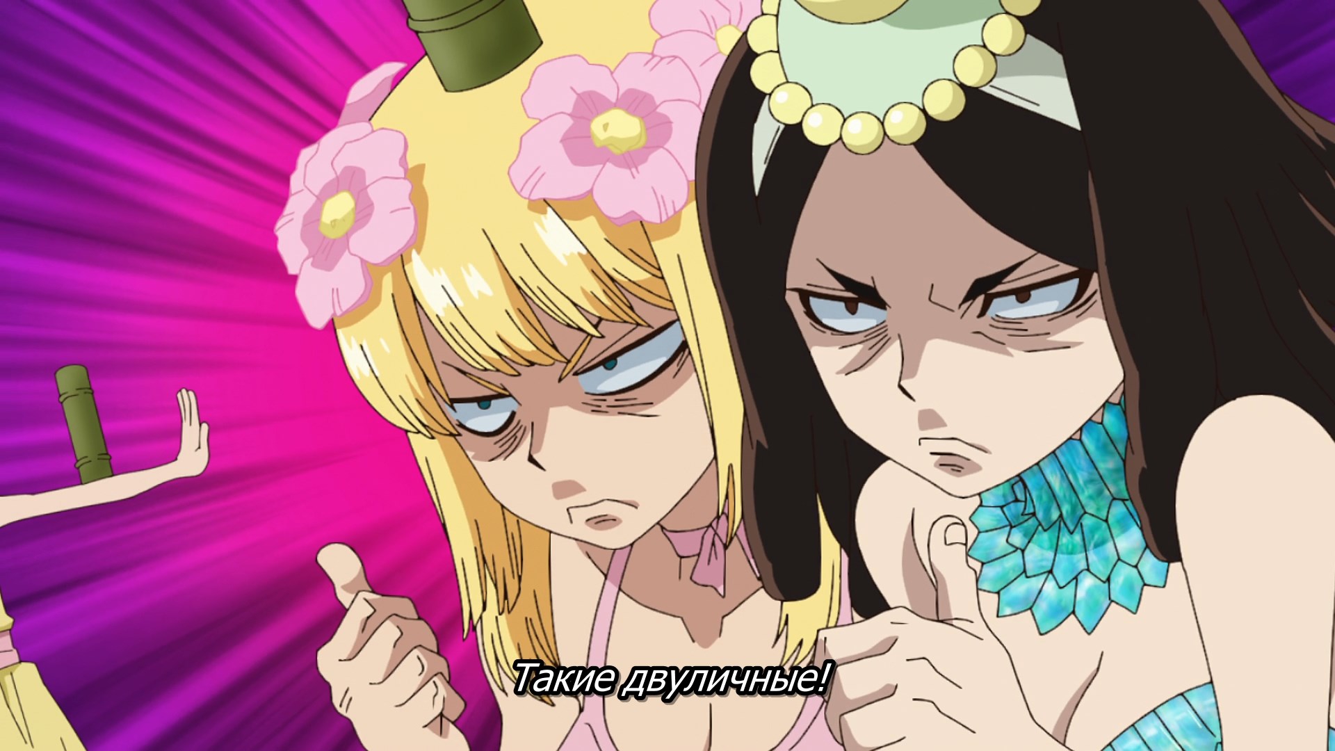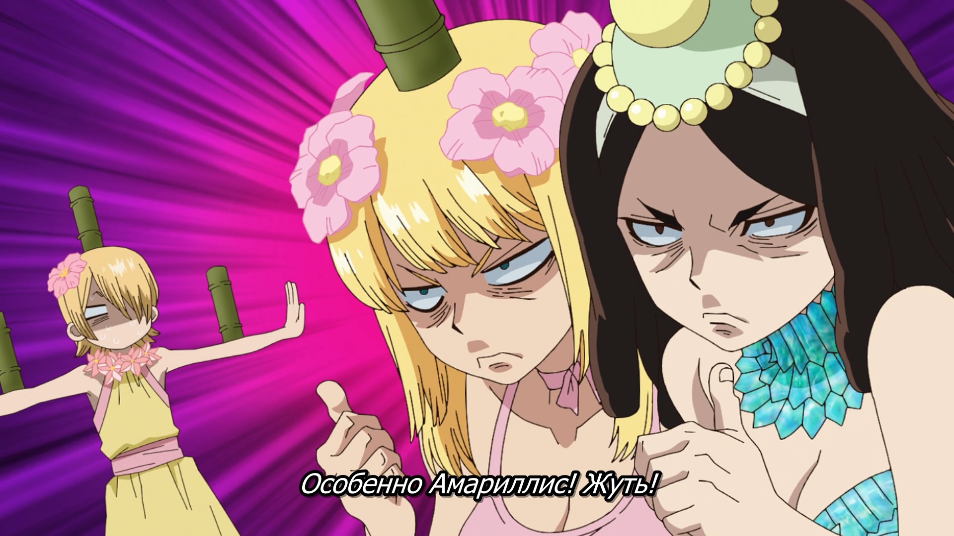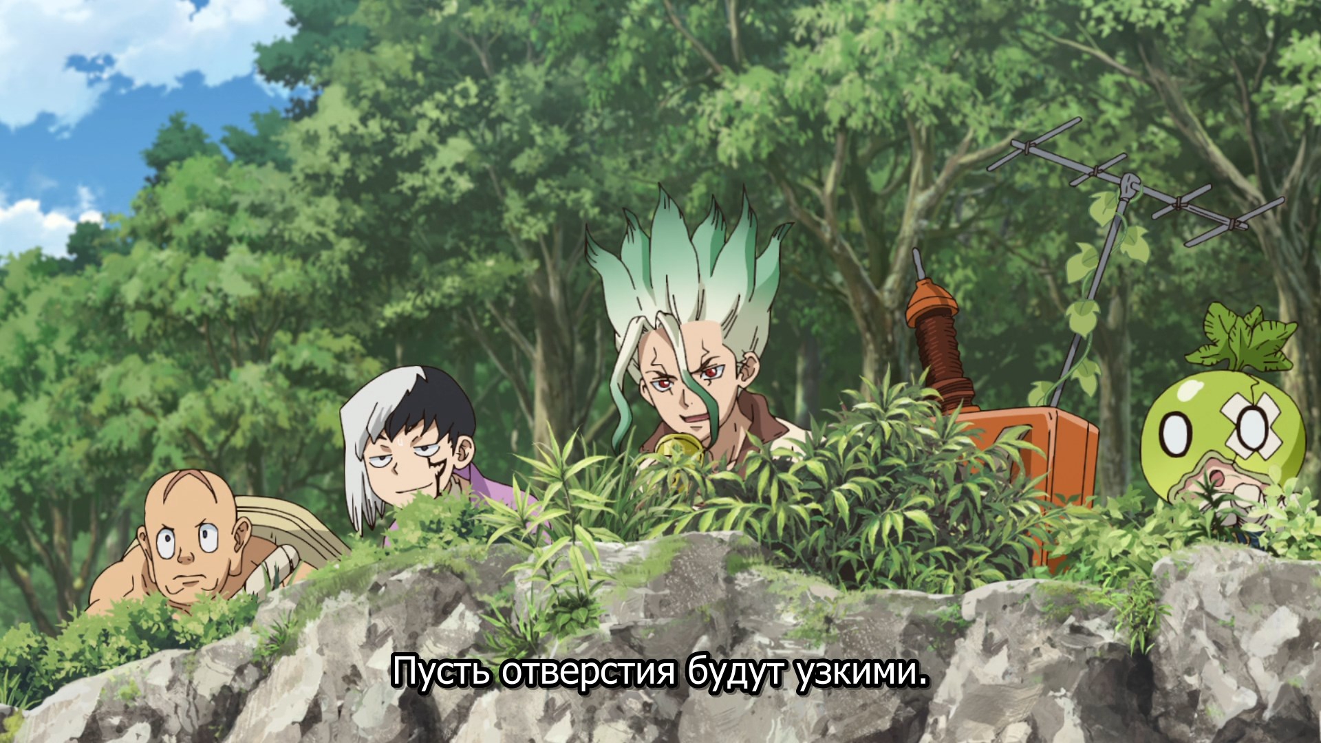Потом когда они добрались уже до этого острова, у меня тут возникла по-моему очевидная мысль - Сенку буквально может создать что угодно, и оружие типа слезоточивого газа уже делал. Какого хуя он не делает какое-нибудь эффективное оружие против этого племени? Но вместо этого смехуешки с проникновением в деревню под видом наложниц