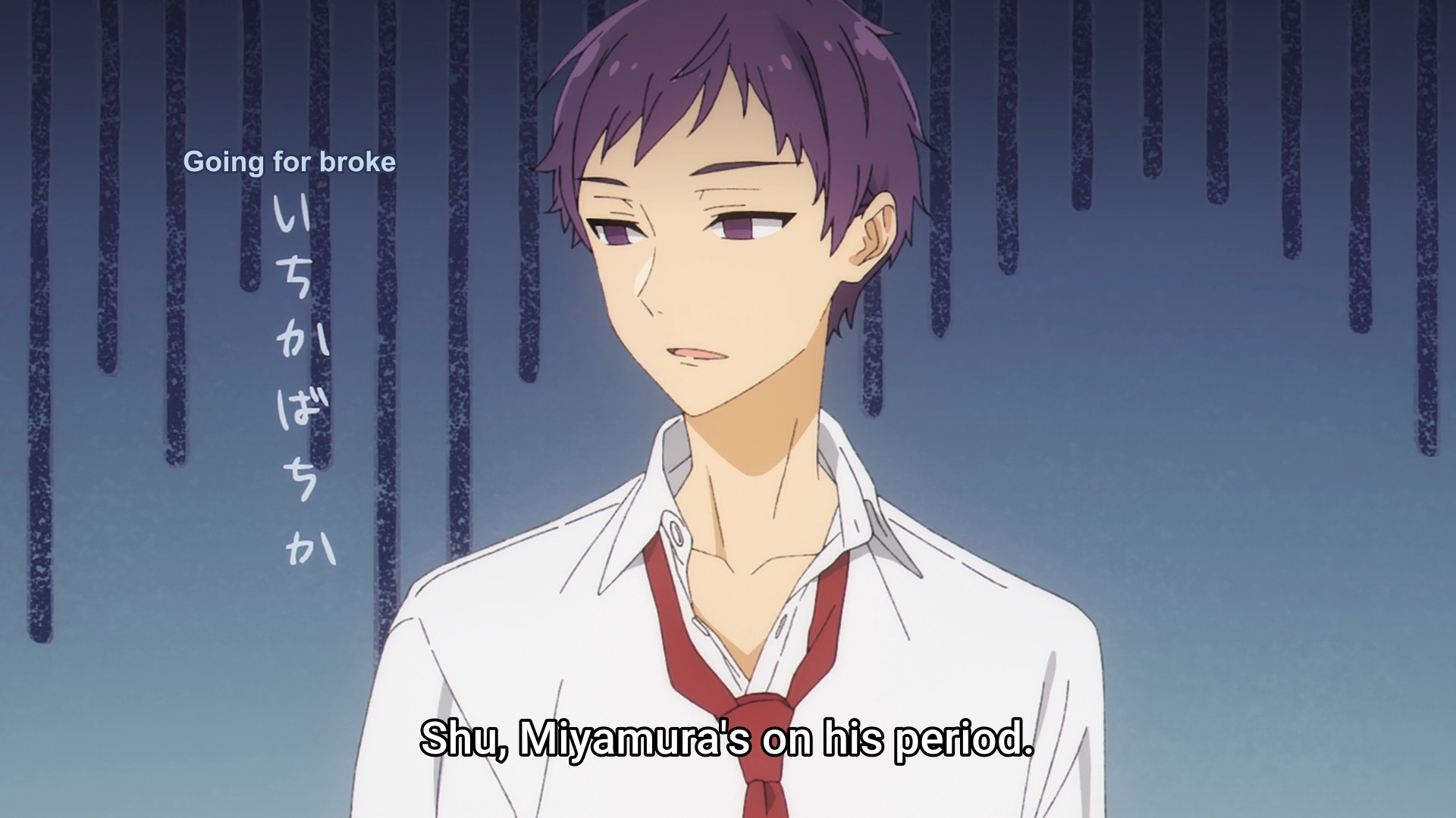 Интересно, почему мал выдал тайтлу этот тэг? > Demographic: Seinen Очевидно же, что тут ШОДЖО, просто градус драмы пониже и героиня попроще. Но это же не повод считать это тайтлом для молодых мужчин? Кого я пытаюсь обмануть, я же такое смотрю. Судите сами. Яойные бишонены - чек. Девичьи заморочки - чек. Мэрисьюшная героиня - чек. Драма - чек. Хотя с последним у меня лично проблемы. На выходе тайтл настолько легкий, что кажется поверхностным. А главное, суть драмы то НЕ РАСКРЫЛИ! Да, всё уходит корнями в семью Симы, из-за этого он ведет свободный образ жизни, но вот так чтобы прямо в лицо-то зрителю это не развернули. Женат ли его отец второй раз? Или это мать вышла второй раз замуж? Насколько он чувствует себя покинутым и забытым по сравнению с братом? Как он оказался в компании старшаков и алкоголя? И откуда в нем эта "легкость бытия"? И тут как не подумать о том, что ТАК И ЗАДУМАНО. Нет смысла в который раз выливать на зрителя историю бедных подростков. Достаточно показать, как эта жизнь видится глазами другого, в частности главной героини. А тут уже можно ей простить некоторую идеальность, иначе она не сможет стать соединительным звеном для слишком разных персонажей.