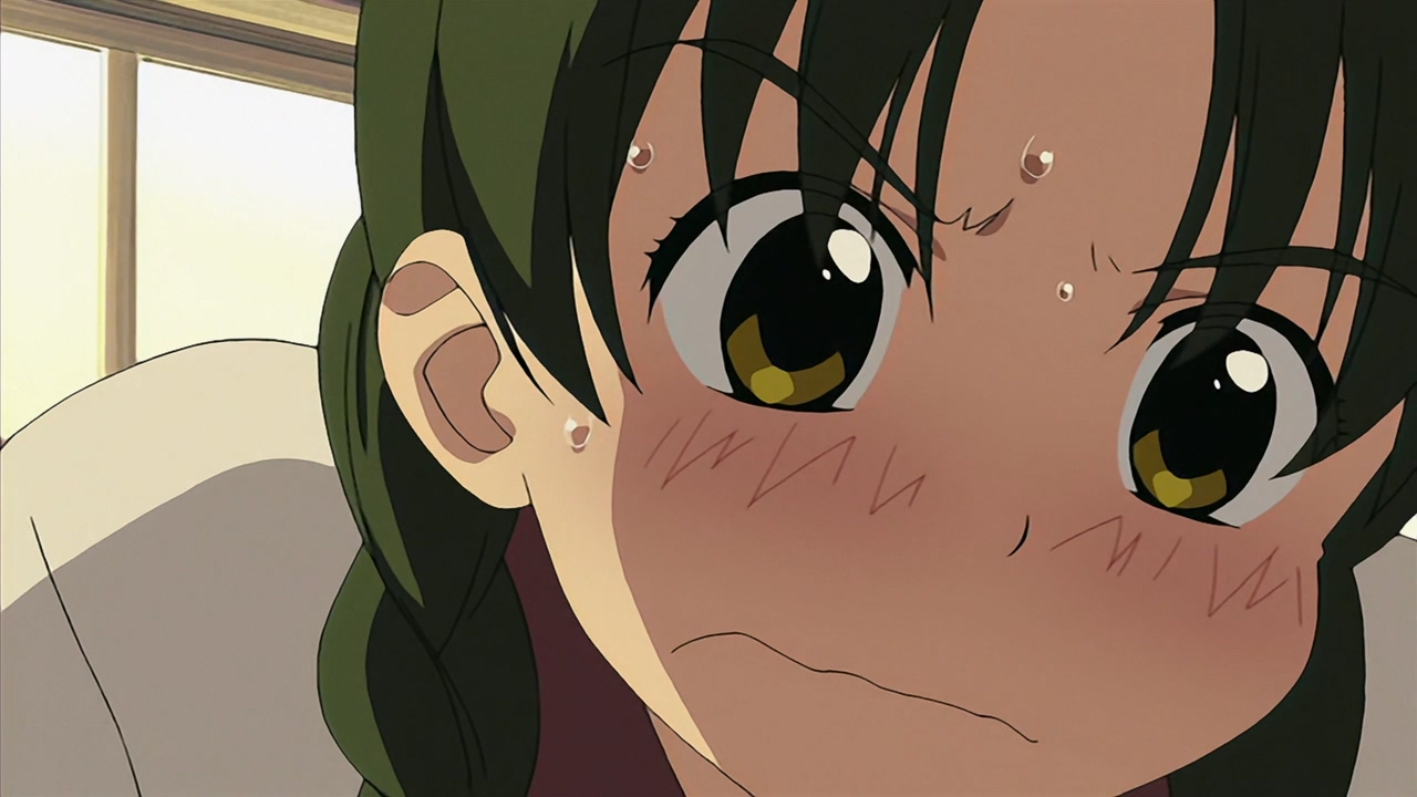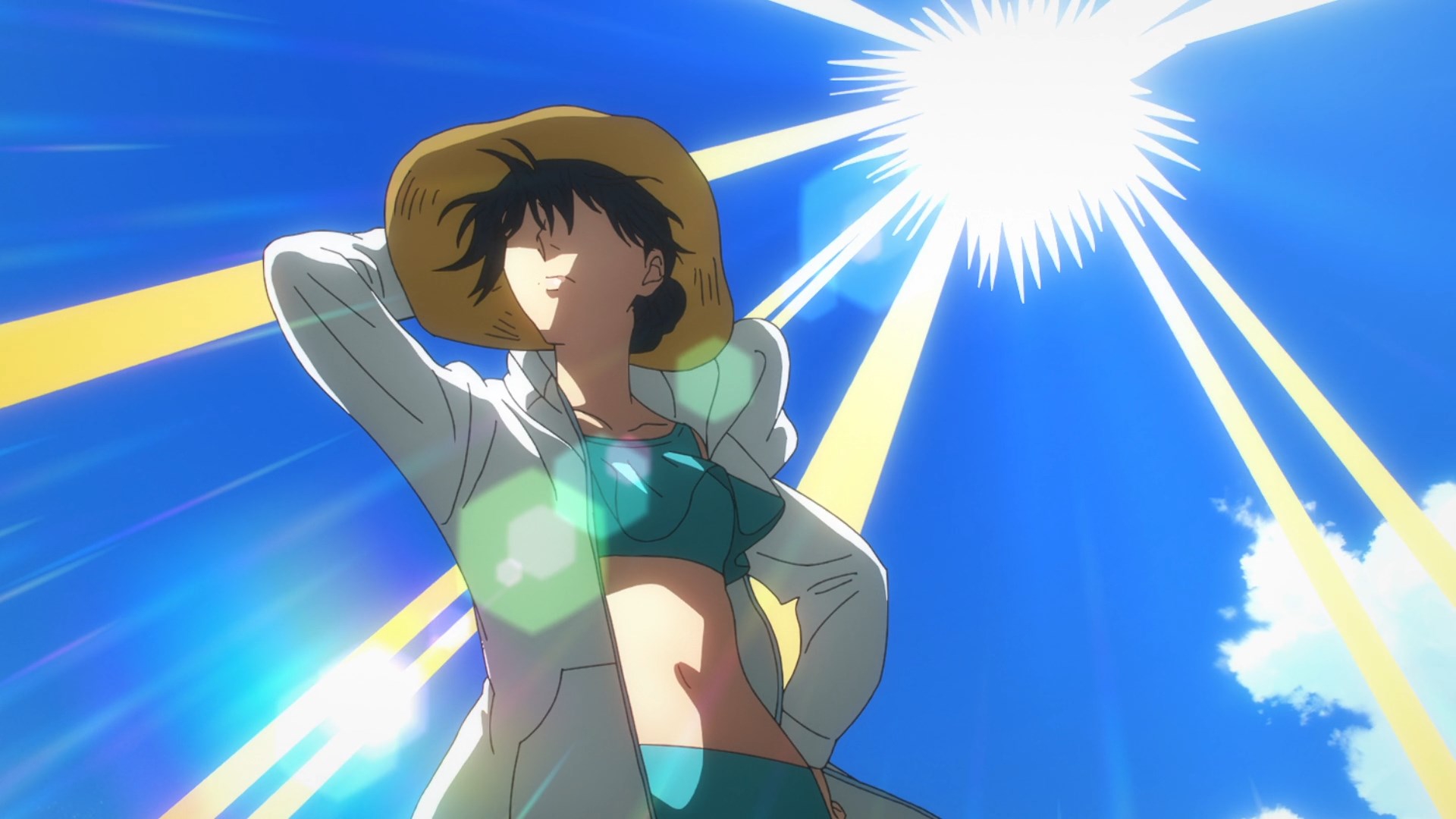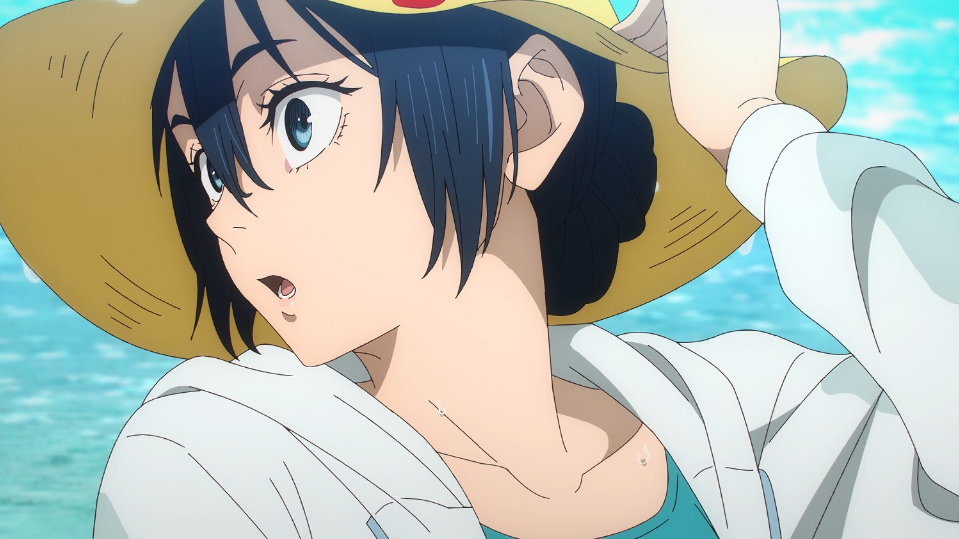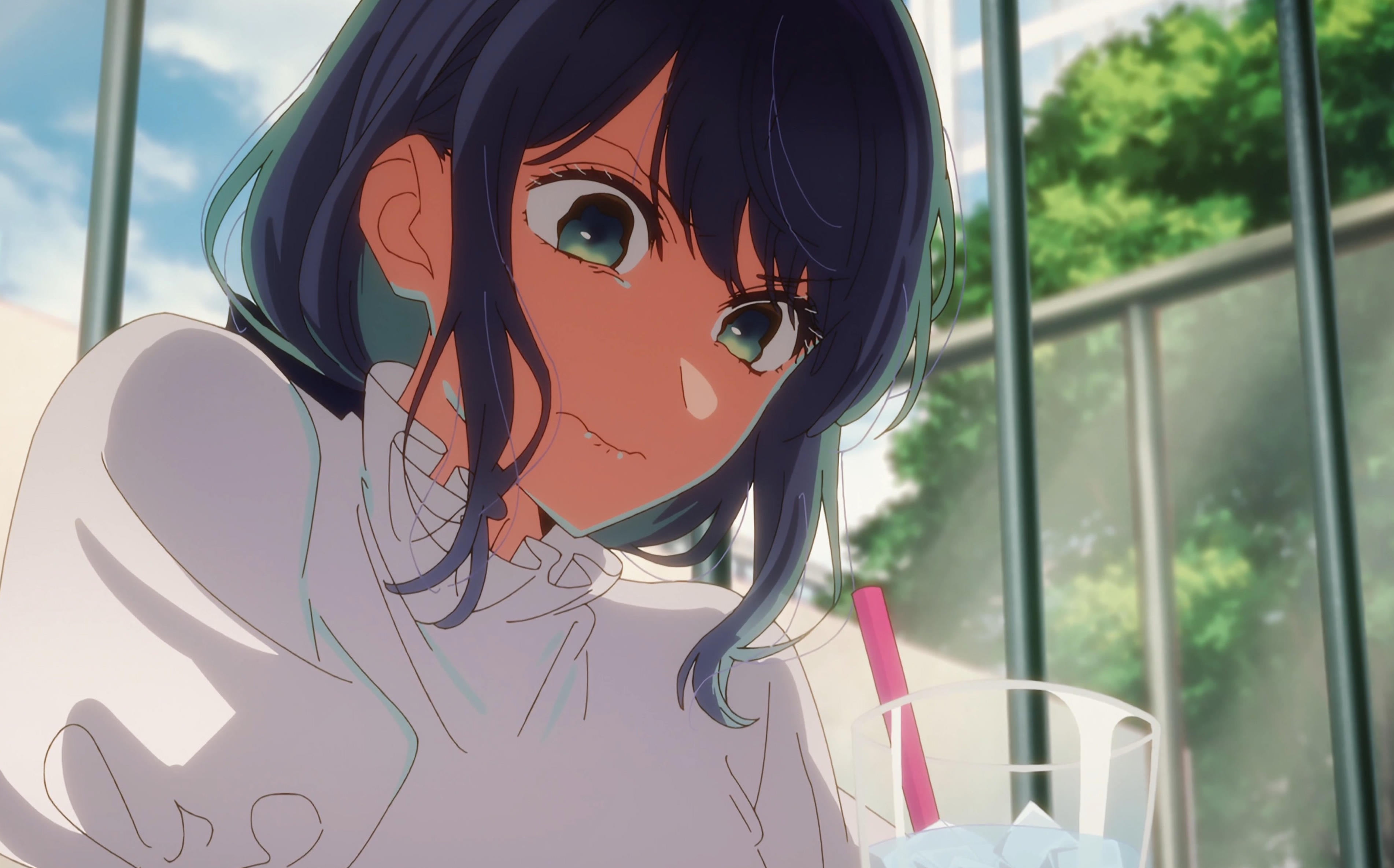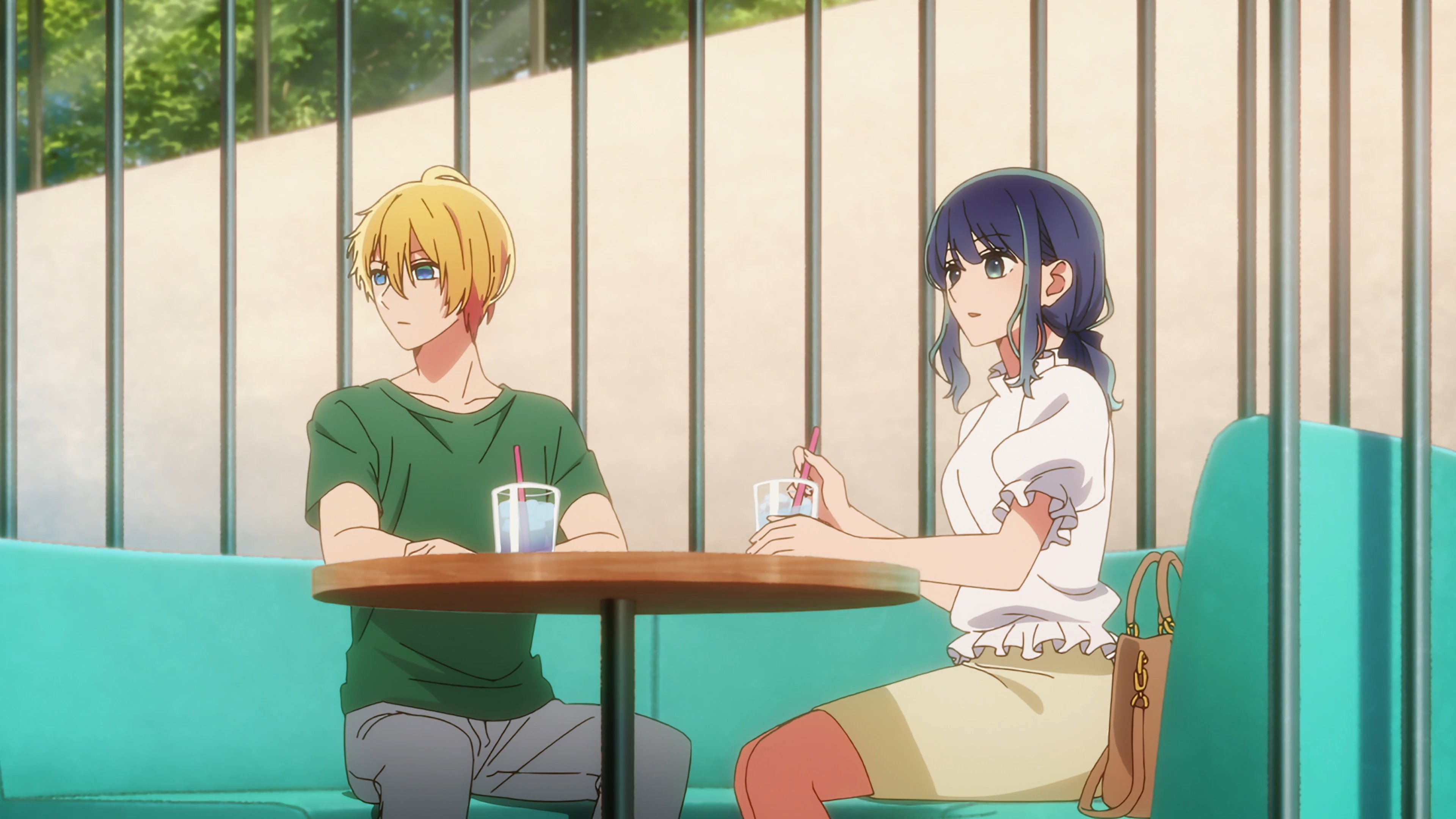Забавно, что первая половина эпизода - такая более стилизованная и неанатомичная, хотя казалось бы - эпизод в летней пляжной кафешке. Немного похоже на имаишевский стиль, особенно анимация, но не он.
