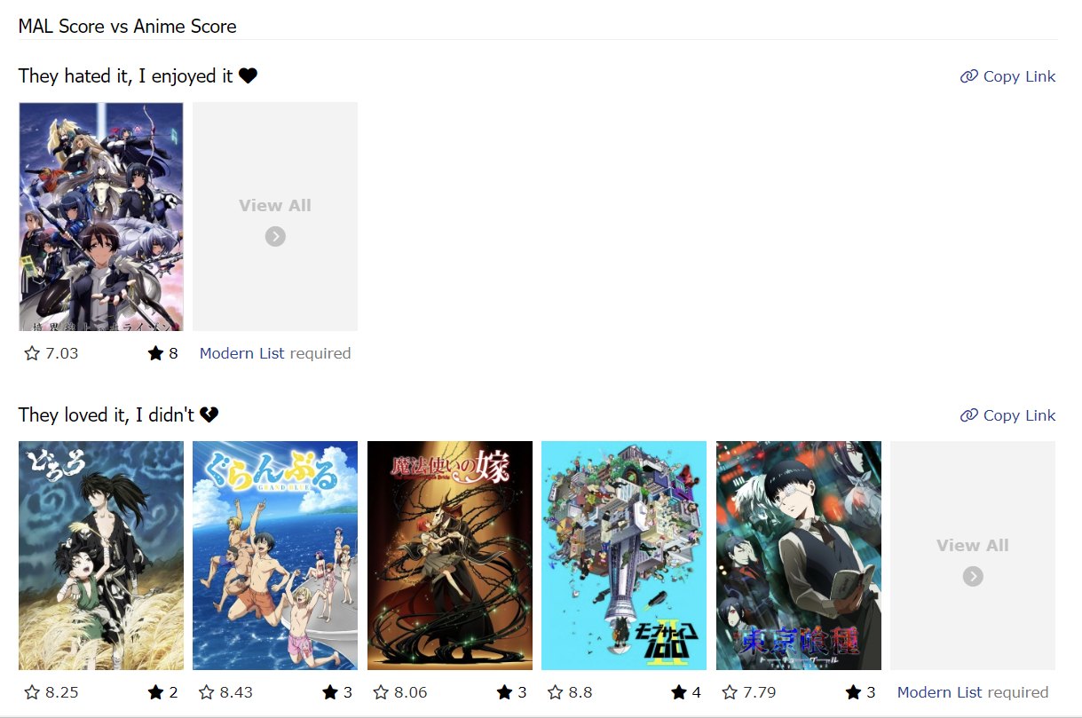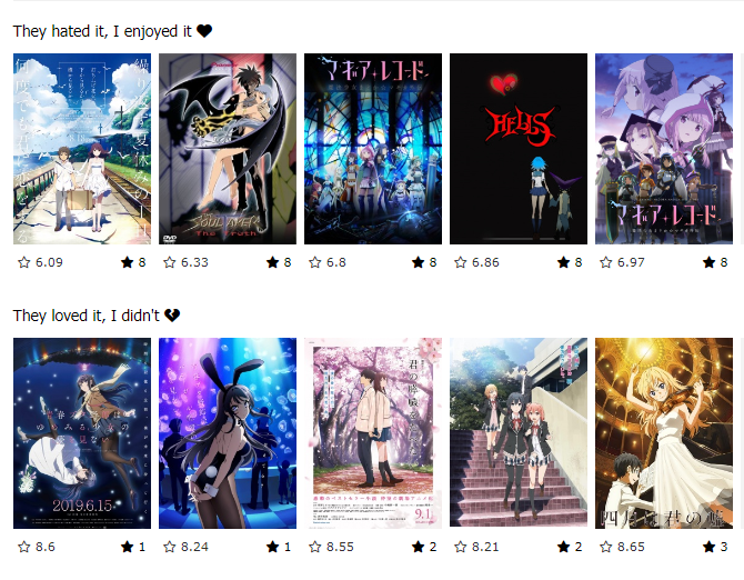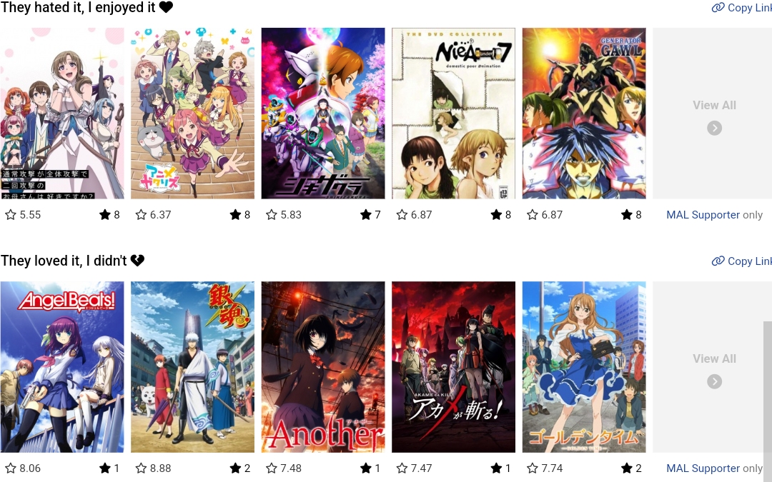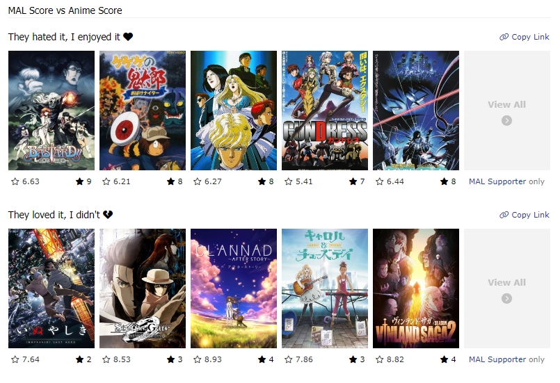 >>178706 В малграфе такое тоже было (и наверное есть), просто там это было менее нитакусечно обставлено - просто список тайтлов, у которых твоя оценка больше всего превосходит среднюю, и наоборот.