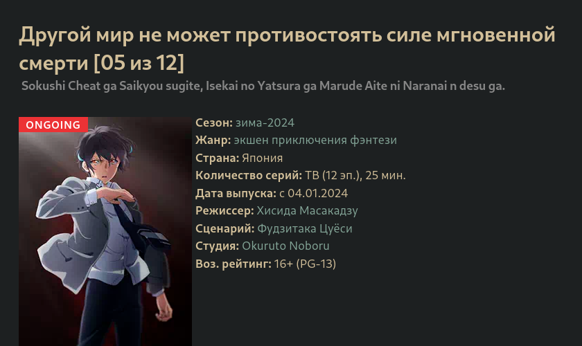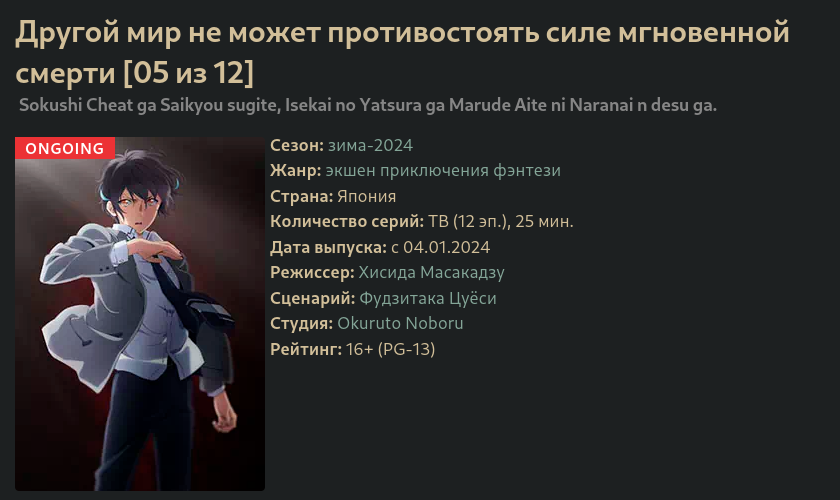 Какой-то проходной титул, просто не знаю за что зацепиться. Я вообще устал от аниме, даже ТТГЛ на 25 серии дропнул. Короче, я купил плойку и укатываюсь в Ярнам, буду пиздить бывших людей и мохнатые пятиэтажки. Не поминайте лихом, братцы, вернусь через неделю. Пик стронгли релейтед.