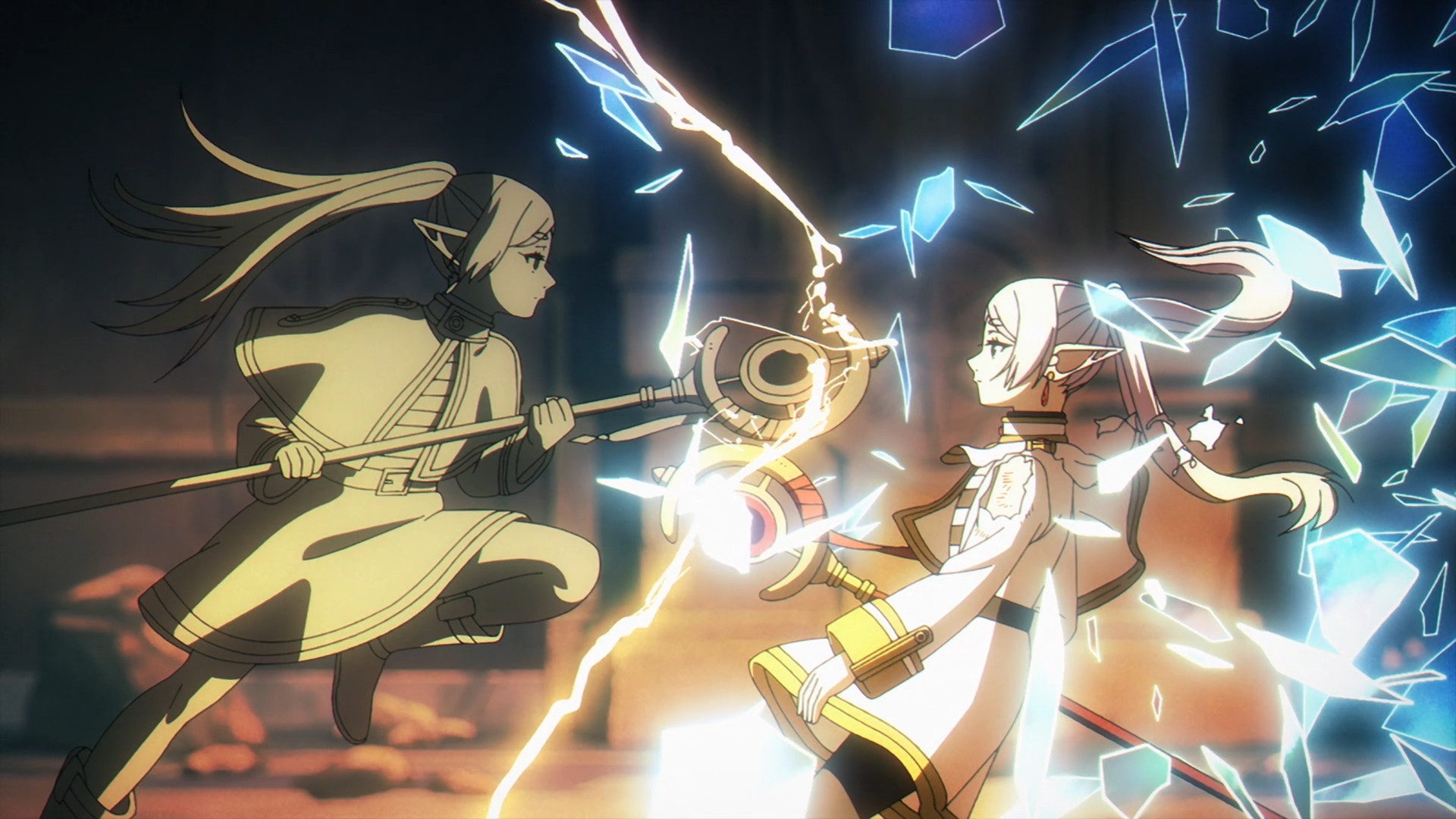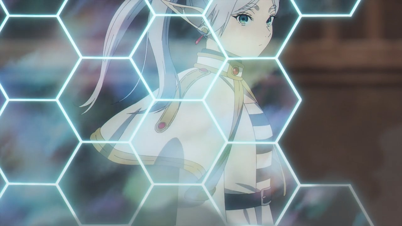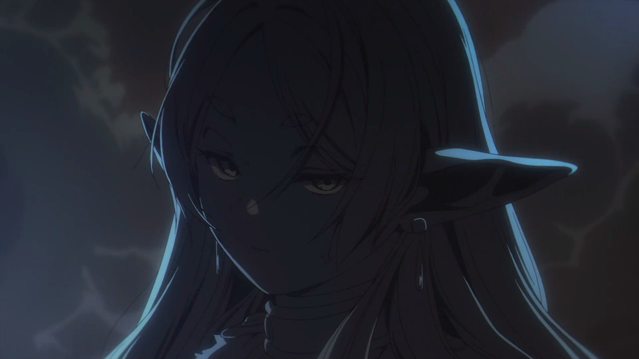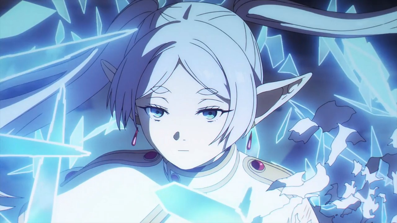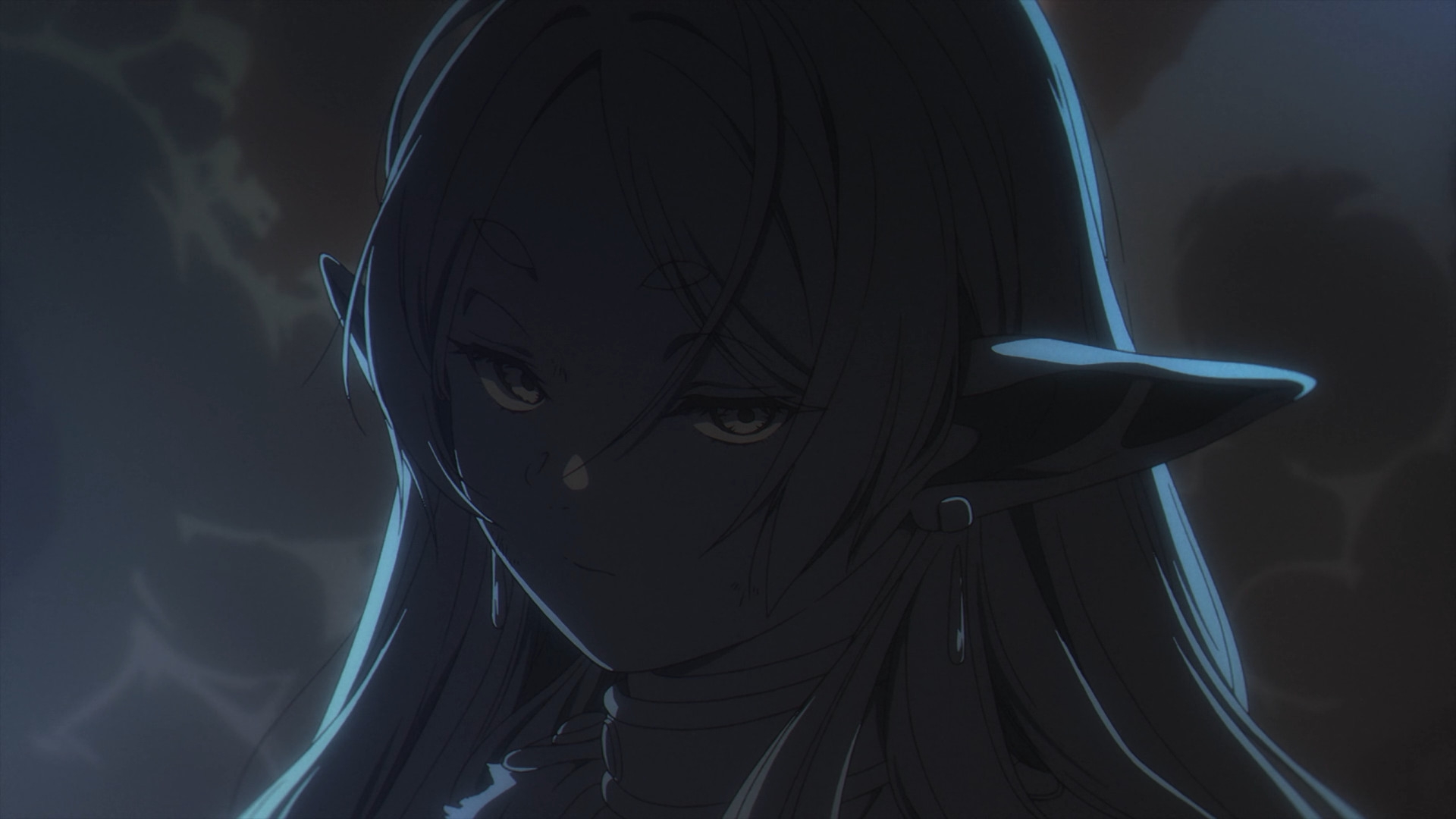 А второй просто красивая и типичная для этого аниме композиция, где персонаж находится на монотонном фоне неба в приятных глазу пастельных цветах. Если бы Фрирен лицом в камеру смотрела, можно бы сразу на обои ставить.