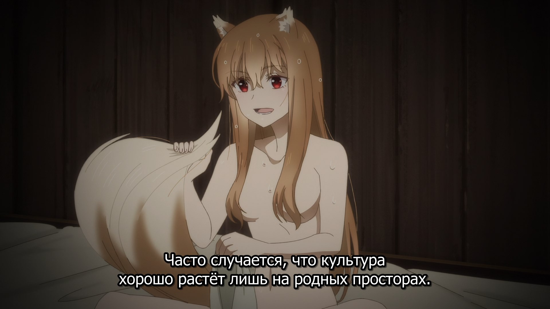 А в ранобэ она ему после этого предложила попробовать сделать ожог ей на лицо, а он ответил, что так как он мужик, не может поставить рану на такое красивое лицо. А ещё этот разговор в ранобэ был между разговором про пшеницу и разговором про то, что он воняет.
