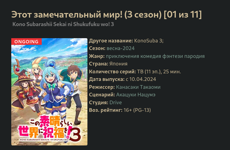 >>183661 Хз, я прошлогодний спин-офф дропнул после двух серий, когда я даже ни разу не улыбнулся, посмотрел эту серию и все то же самое Наверное всегда было калом, просто 8 лет назад мне это было смешно, а сейчас уже нет Не думаю что юмор третьего сезона Коносубы изменился по сравнению с первым