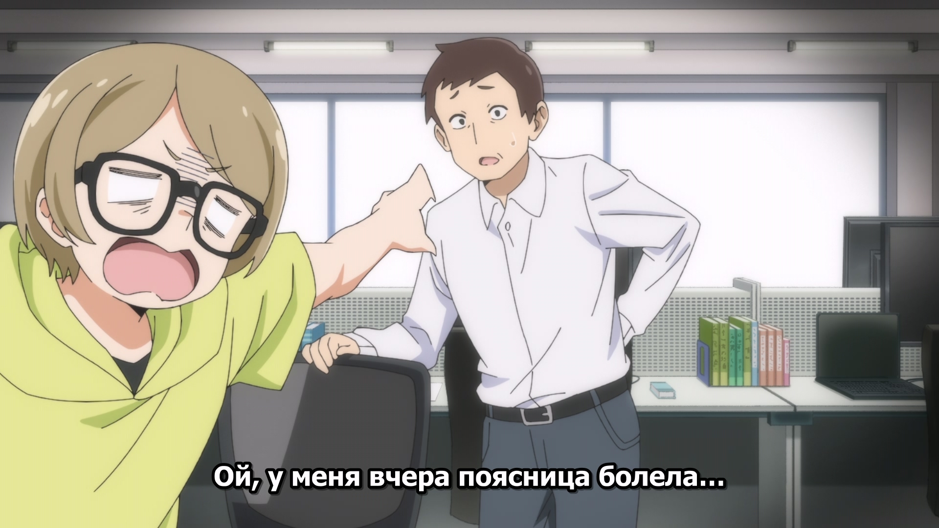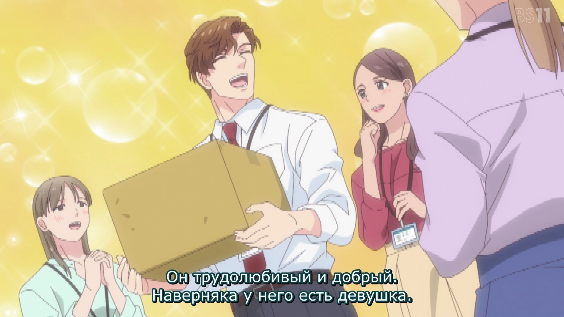Вот за это я и люблю аниме. Идеальные отношения с идеальной девушкой на идеальной работе в окружении идеальных коллег. Плюс парень при этом адекватный, не трясун, не визгун и не бревно. За такого и порадоваться не зазорно.