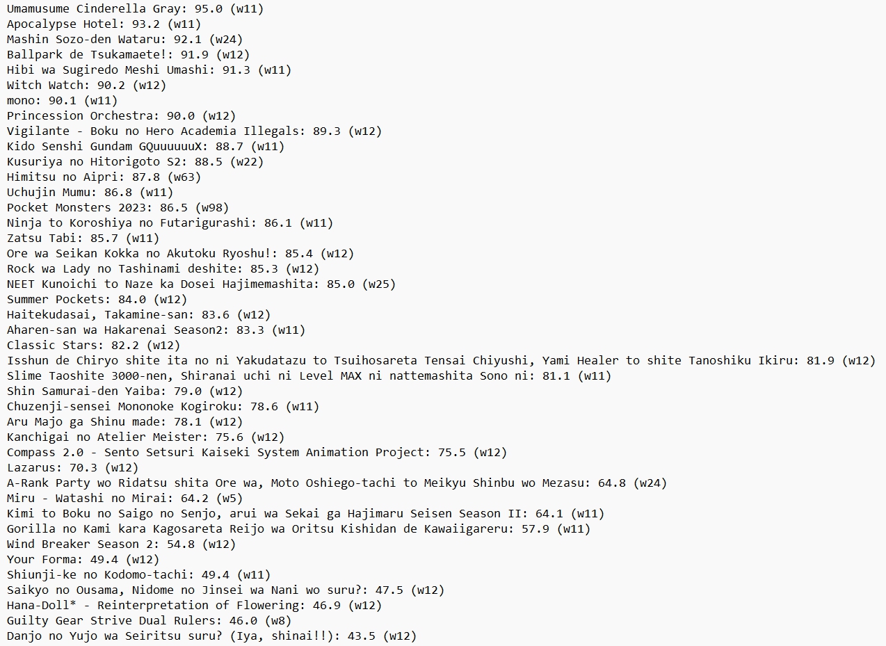Лень ждать завершения оставшихся онгоингов, поэтому напишу сейчас про сезон: Ninkoro - АОТС. Отличный тайтл от начала и до конца, даже всякие переходные главы сделаны так, что не придраться. Плюс тайтл смог во всё: в юмор, в чёрный юмор, в трагедию на фоне юмора, в преображение персонажей и в развитие их отношений. И концовка получилась такая приятная, что одновременно и допускает возможность продолжения, и ставит достаточно твёрдую точку, что даже не расстроишься, если второго сезона не будет. Apocalypse Hotel - был бы твёрдым АОТС, если бы не Нинкоро. Редкий случай, когда тайтл рождён исключительно в творческих целях, не пытается ничего прорекламировать, продать, не пытается ни в какую претензию, не пытается даже рассказать историю. Просто полёт фантазии и ничего больше. Чисто изобразительное искусство. В этом его плюс и отчасти его минус, но такое в любом случае хочется ценить. Тануки немного подпортили итоговое впечатление, но не настолько, чтобы обесценить его в целом. Ну а одиннадцатая серия с пятнадцатью минутами без единого слова - лучшая серия сезона и наверняка года. Rock wa Lady no Tashinami deshite - начало было очень мощное, и в принципе с самого начала Лилиса и Отоха были офигенным дуэтом. Но с середины и со введения двух других участниц группы пошла какая-то хуйня в оригинале, ну а последняя арка вообще была просто смешной по драматургии. Причём классных моментов хватило даже в последних сериях, но тут всё равно явно авторский провал, ну а экранизация ситуацию никак не спасла, к тому же визуально она выглядит на порядок хуже манги, судя по тому, что я видел. Zatsu Tabi - начиналось бледно, так и продолжилось, но всё же добавление других персонажей, особенно Коёми, во многом спасло тайтл, поездки с ней были самыми милыми, потому что у персонажей ощущалась химия прям. В принципе тайтл пытается делать примерно то же, что и Юрукян, просто хуже выходит. mono - ещё не кончилось, но как я уже писал, тайтл тоже просто на уровень ниже Юрукяна. Авторшу бросает из стороны в сторону, и ничего осмысленного написать не получается. Тут, пожалуй, одна Сакурако создавала какую-то жизнь, несмотря на свою визуальную безжизненность - но такие персонажи работают как поддержка, а поддерживать было особо некого. Aru Majo ga Shinu Made - совершенно мучительно выдавливаемые серии и сюжеты. Я уже к середине совершенно заебался это смотреть, и досматривал скорее на автопилоте. S'berry конечно смешная и всё такое, но по факту эти её ужимки тоже к середине стали выглядеть вымученными. Kusuriya no Hitorigoto S2 - как экранизация хуже не стало, но мне неслабо припекло от нынешней арки - от непонимания, почему все себя так ведут и так невозмутимо или нелогично реагируют на происходящий пиздец. Ну а мать Лоулан - просто какой-то карикатурный злодей, на уровне тех потешных заносчивых бишоненов из последней арки Рокерш. Ну и вообще тут авторша явно периодически забывает, что уже рассказала, и пытается всех удивить плоттвистами, на которые уже сама прозрачно намекнула в самом начале истории, типа происхождения Джинши и кто на самом деле его родители. Shiunji-ke no Kodomotachi - обычно арки гаремных девочек делают их более интересными и привлекательными, а тут с точностью до наоборот. Удивительный талант у мангаки, конечно.