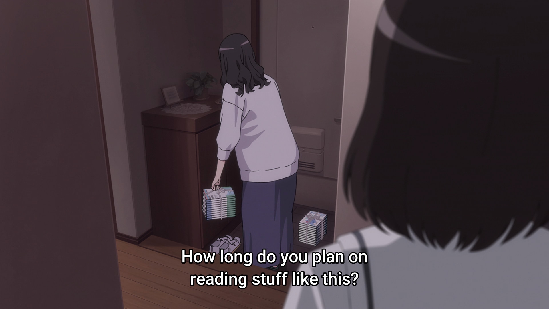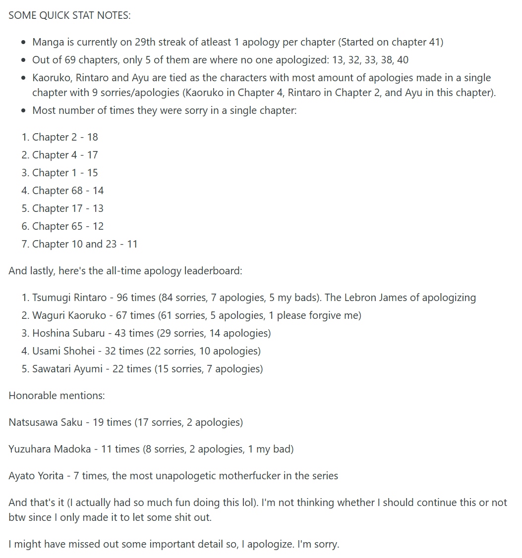 Убираем семейные темы, минимизируем ламповый отношач и у нас остается большой кусок уныния. Может последние две арки еще были более-менее, хотя и в первом сезоне была история с кохайкой, и она вроде как тоже западала на гг... Вот в этом главная проблема сериала, когда они наваливают и наваливают девок в каждой части, которые выглядят почти одинаково, которые ведут себя почти одинаково, на которых в целом плевать и на охуительные истории которых плевать в не меньшей степени. Волосню бы хоть в кислотные цвета красили, чтоб я их как-нибудь различал.