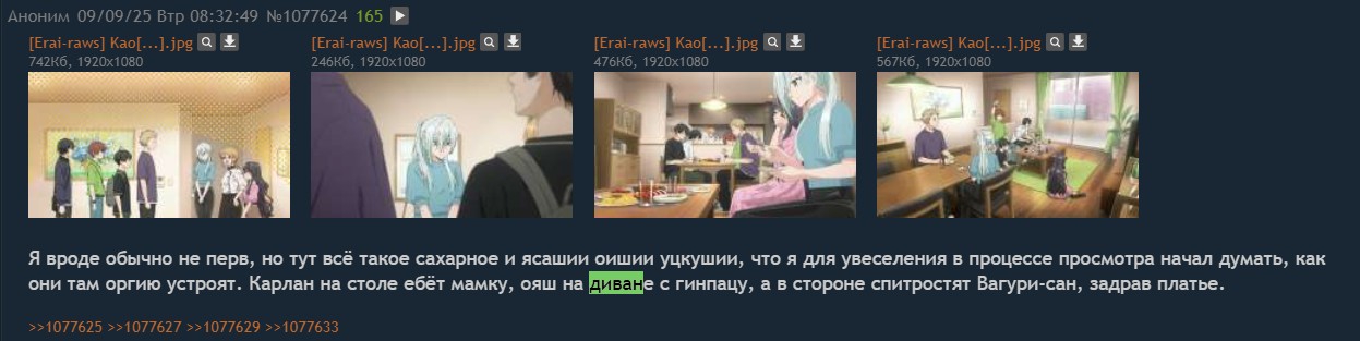 Про дропы не буду писать, хочу только отметить один Mikadono Sanshimai wa Angai, Choroi - тут тоже забайтили завязкой с тремя крутыми сёстрами, которым на основе чисто внешности можно было бы прописать интересные и волнующие взаимоотношения с ояшем. А потом тут же всё выродилось в покраснения до ушей и интенсивные выделения жидкости от того, что ОЯШ сказал иттерашай, коснулся пальчиком или приготовил бенто. И как-то быстро для себя понял, что манга вышла на волне популярности Готобуна, что автор хотел свой гаремник про близняшек, осилил чардизы, а всё остальное по заветам Вовки в тридевятом царстве. Обидно, но и хуй с ним, благо у меня есть тут манга про девочку со внешностью Казуки, которая и ведёт себя соответствующе. А иттерашаи и окаэринасаи сами себе оставьте.