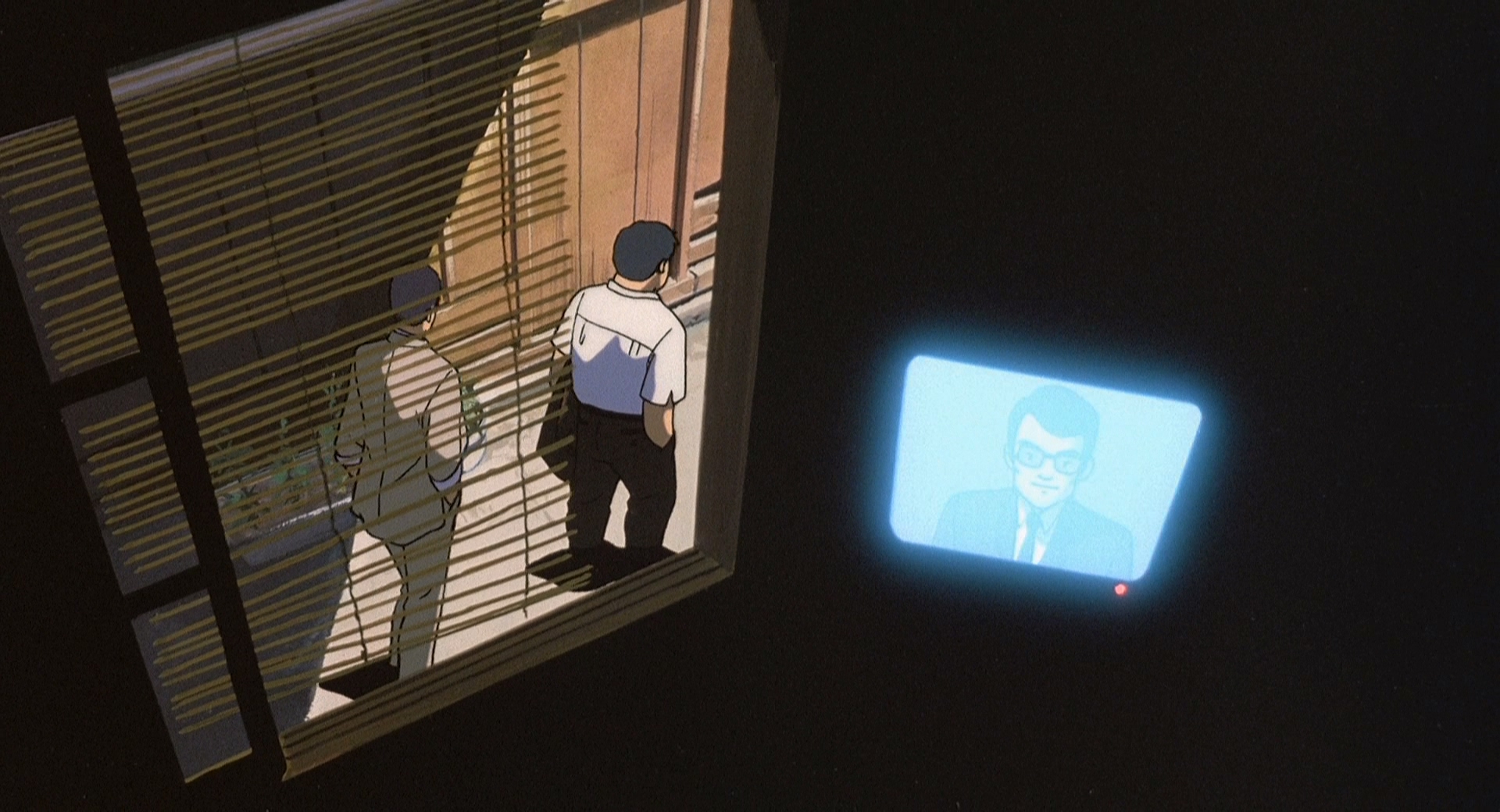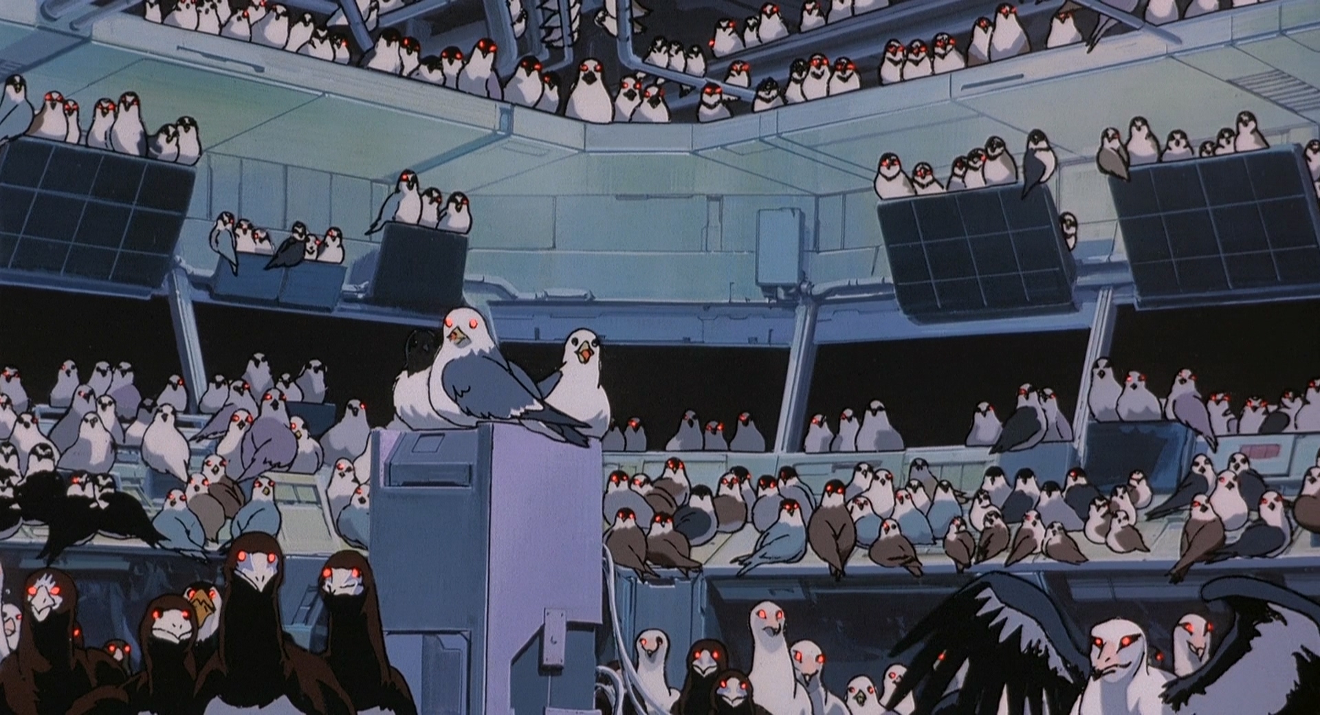 Фильм вышел в самой высшей точке "экономики пузыря", любопытно что в нем при этом нет никакой эйфории, а только тоска по утрачиваемому городу и тревога перед этим стремительным развитием с риторикой покорения и завоевания - например дополнительной земли у залива. Главный противник тут это конечно не "возомнивший себя богом" программист, но все то что он взял на вооружение - выросшие повсюду небоскребы, новейший софт и роботы, а противостоит им полицейский участок, сотрудники которого разводят кур, ростят помидоры и ходят вечером на рыбалку - и не торопятся с обновлением своих мех, к которым относятся как к родным. Не знаю к Хичкоку ли отсылают птицы с демонически горящими глазами, но само их присутствие явно намекает на божественное наказание, указывая на то, что Хоба не просто использовал мифологию Писания в припадке безумия - а был проводником его нового выражения, пророком капитализма-как-религии(прям по Беньямину), стремившимся указать на ее уязвимости и обнажить структуры. Интересно, что обычно этот мувик презентуют как весьма политический, но по факту тема политики тут на первый взгляд кажется на удивление безьяйцевой и осторожной, этот конфликт минимален, что, впрочем, уже само по себе принимает форму структурирующего остутствия, дополняя картину конца 80ых, когда казалось что даже политика распалась на комитеты и растворилась в акселерации - машина без оператора, как робот в первой сцене.