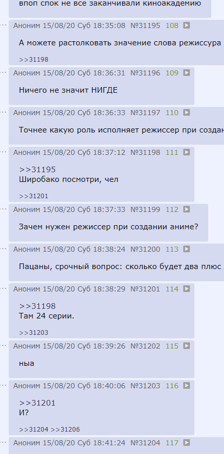 >>31161 Основной режиссер тайтла один. Просто что Симбо в шафтах, что Оонуму в сильверлинке ставят режиссером натурально во все тайтлы, что делает студия, хотя они не выполняют именно то, что традиционно понимается под режиссерской работой во всех них. Оонума сам режиссировал последним наверное tasogare otome x amnesia, Симбо вообще в нулевых что-то. У них просто времени на это все нет — они на другом уровне работают, выступая творческими руководителями студии, обучая стаф и т.п. >>31172 Вообще это естественное желание. Давай спустимся до базового уровня: почему ты вообще проводишь время, наблюдая движущиеся на экране картинки? Потому что система поощрения организма награждает тебя дофаминовой конфеткой, когда ты проявляешь внимание, наблюдаешь последовательности и т.д., т.к. потенциально это полезно для выживания(она же не знала, что ты вместо реального мира будешь это внимание направлять на китайские порномультики), так вот более углубленный интерес к этим движущимся картинкам — просто следующий лвл того же явления. Вот я прямо сейчас параллельно смотрю abenobashi mahou shoutengai и в третьей серии прямо сходу начинает безумие твориться, а стиль и анимации и режиссуры меняется кардинально "ну это какой-то Имаиши, походу, делал" — чекаю, так и есть. Это интересно.
