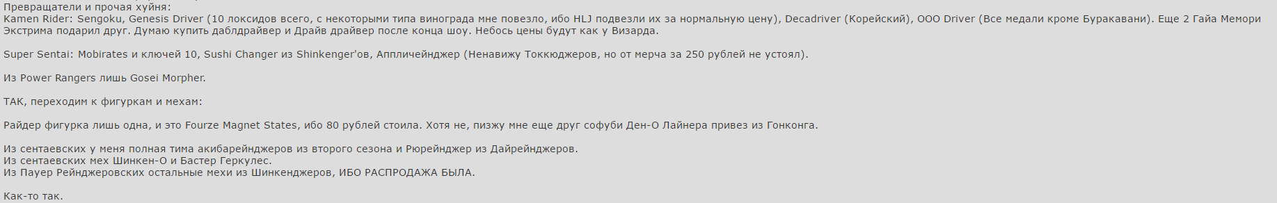 >>3235 В /pvc сейчас еще мертвее, чем у нас, да и я не видел, чтобы кто-то там токуфигурками интересовался. Всё равно как-то жалко его продавать, а тут у кого-то есть лишние райдеры, или еще что-нибудь интересное. Вообще, жалею жутко, что раньше так мало фигурок покупал, ибо с нынешним курсом это для меня почти нереально.