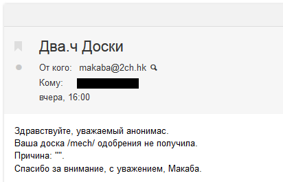 >>112 Кстати, тебе не пресылали уведомлений по поводу одобрения доски? Я тоже запрашивал и мне вчера прислали вот это, думал что скоро прикроют но пока доска стоит. Надеюсь Абу передумал..