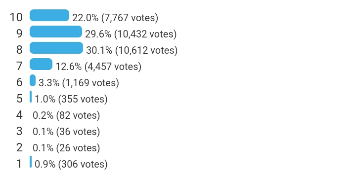 >>35555 Ну да, у меня как то так же. 1 это оценка для ненавистного тайтла, 4 - середняк с какими то заметными недостатками(либо нехваткой достоинств), а вот 2 и 3 это то, что обычно отправляется в дроп. Ты скорее досмотришь единицу, что бы потом написать пространную рецензию о том почему это говнище и поучаствовать в жарких спорах с фанатами, чем потратишь свое время на 2 и 3.