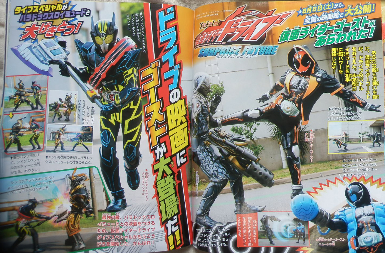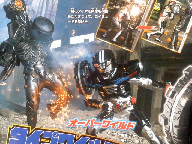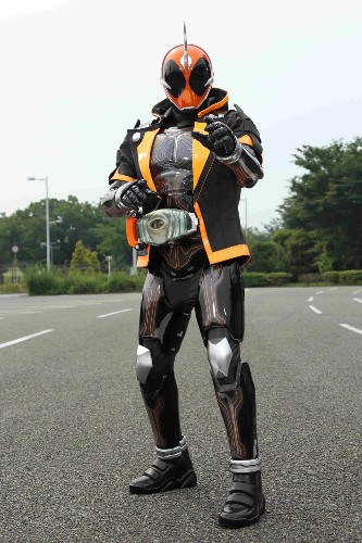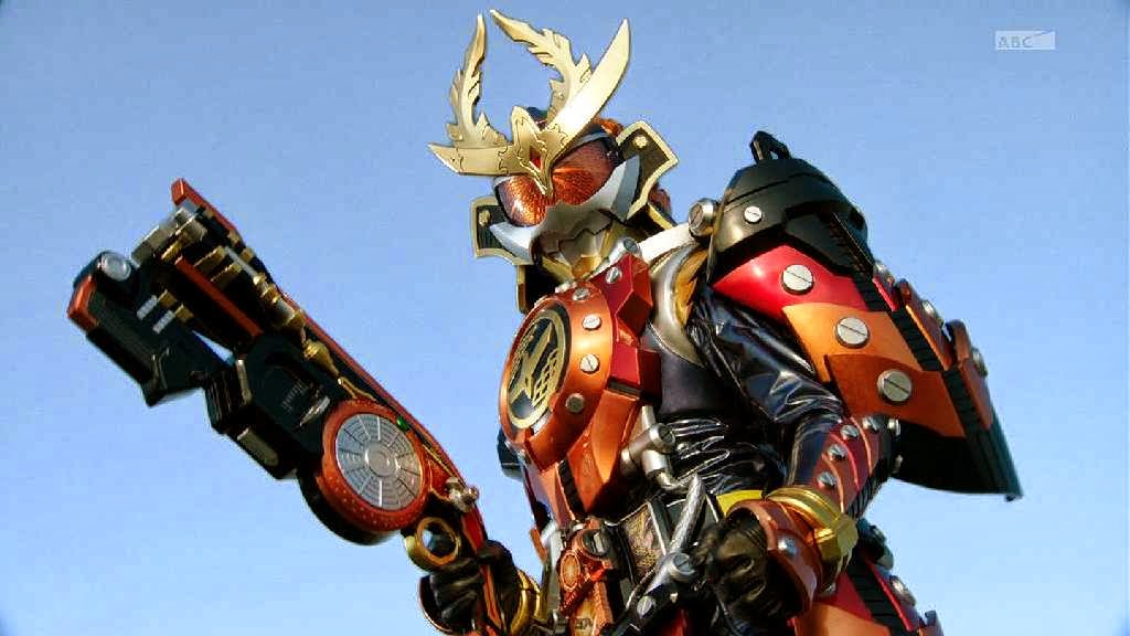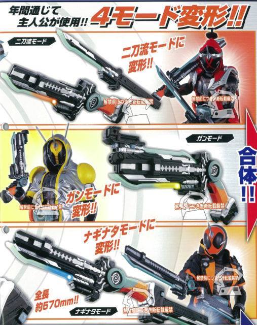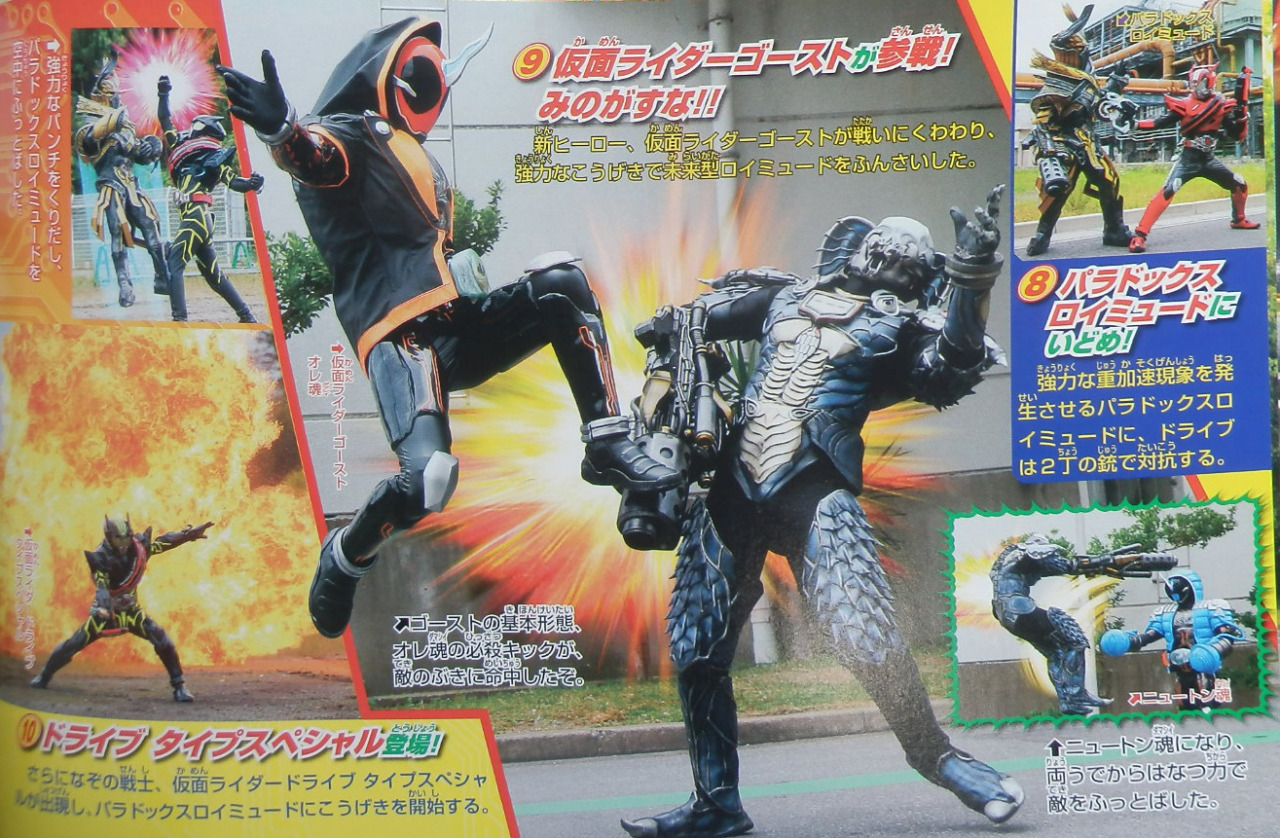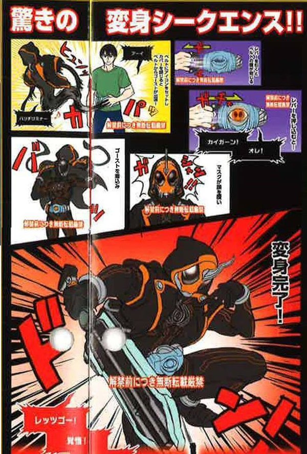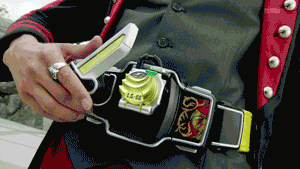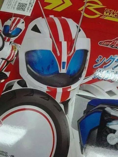 Next Kamen Rider is "Kamen Rider Ra" (ラー). Fashion + Egyptian Theme. Undersuit resemble a mummy with bandages, and main color is gold/red with ankhs embedded in body. Cards as collectibles again, are hard plastic and like credit cards with animals on them and have a barcode. Belt is a credit card reader device, and slide cards through a slot that's shaped like Sphinx. Also has a little fake-pen and pressure-censor touch screen in center that the Rider "signs". Has three interchangeable elements of suit---a "hat", armpieces, and legpiece. The Credit Cards give the Rider a complete set based on an animal and a clothing material (in some cases plastic that resembles that material rather), called an Ensemble, but can rotate the Sphinx Card Reader around and then re-slide different cards to individually change the hat, armpiece, or legpiece for a Mix Ensemble. Main Form is Nyarn Ensemble, has a red yarn cap (like Bossun), yarn mittens, and yarn leg-warmers with cat decorations. Looks really cute, and cat-based. Second Form is Allleather Ensemble, has green leather fedora, green leather sleeves, and green leather boots with spikes resembling alligator's teeth. Third Form is Wooram Ensemble, has a white afro-like wool hat, white wool armguards, and white wool kneeguards. Can mix those three together for Mix Ensembles, and presumably more Ensembles will come. Head-pieces of Ensemble give Ra different guns:, a Yarn-Ball Gun, a gun shaped like a pocket-book that unzips to fire, and a ram crossbow. The Belt speaks "French" (somewhat...), saying things like "Bonjouride!" and "Le Henshin!". Will debut in Drive Summer Movie.
