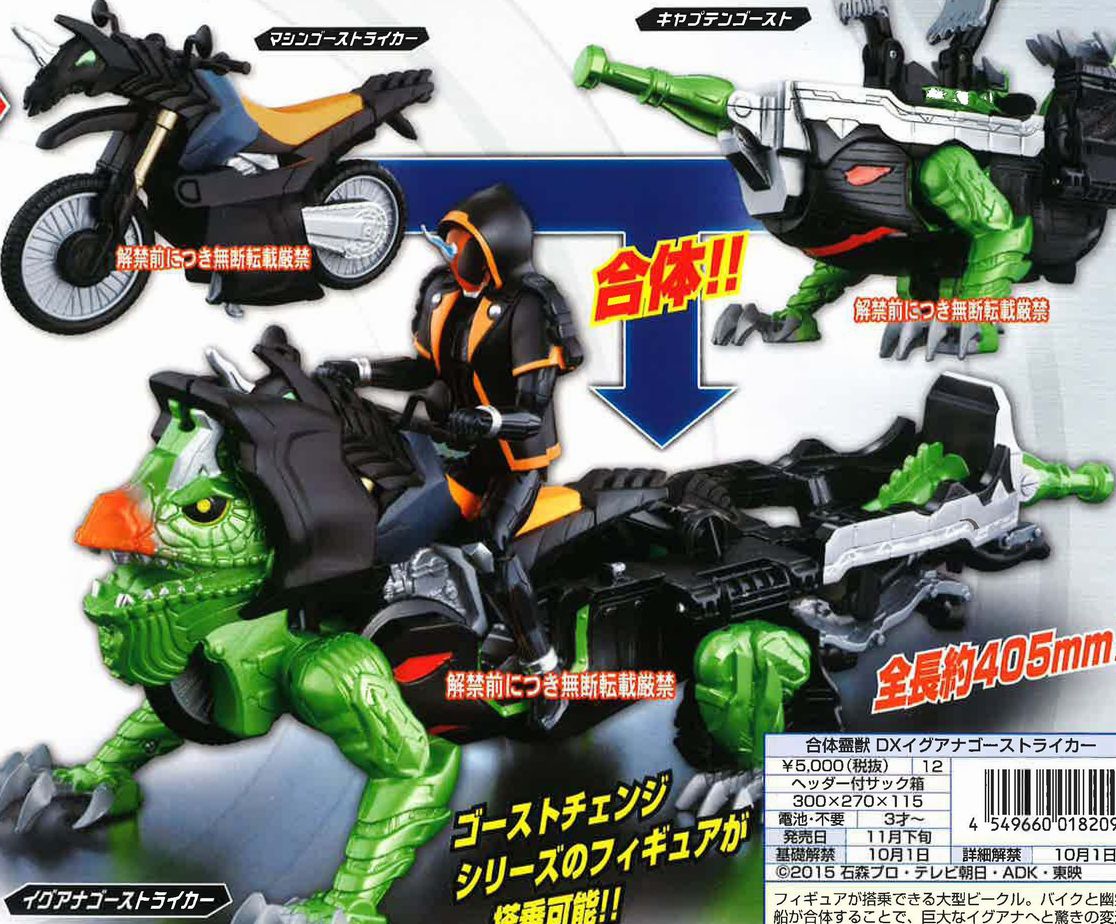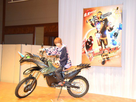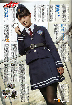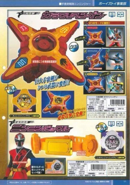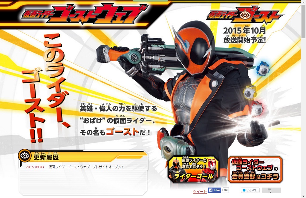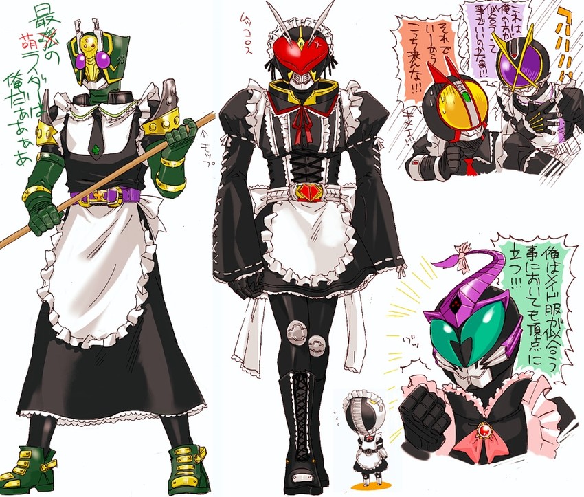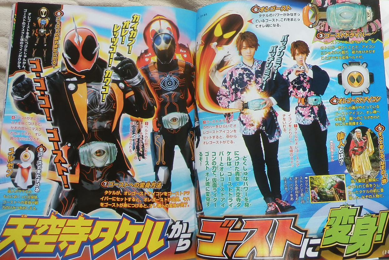 Next Kamen Rider is "Kamen Rider Ra" (ラー). Fashion + Egyptian Theme. Undersuit resemble a mummy with bandages, and main color is gold/red with ankhs embedded in body. Cards as collectibles again, are hard plastic and like credit cards with animals on them and have a barcode. Belt is a credit card reader device, and slide cards through a slot that's shaped like Sphinx. Also has a little fake-pen and pressure-censor touch screen in center that the Rider "signs". Has three interchangeable elements of suit---a "hat", armpieces, and legpiece. The Credit Cards give the Rider a complete set based on an animal and a clothing material (in some cases plastic that resembles that material rather), called an Ensemble, but can rotate the Sphinx Card Reader around and then re-slide different cards to individually change the hat, armpiece, or legpiece for a Mix Ensemble. Main Form is Nyarn Ensemble, has a red yarn cap (like Bossun), yarn mittens, and yarn leg-warmers with cat decorations. Looks really cute, and cat-based. Second Form is Allleather Ensemble, has green leather fedora, green leather sleeves, and green leather boots with spikes resembling alligator's teeth. Third Form is Wooram Ensemble, has a white afro-like wool hat, white wool armguards, and white wool kneeguards. Can mix those three together for Mix Ensembles, and presumably more Ensembles will come. Head-pieces of Ensemble give Ra different guns:, a Yarn-Ball Gun, a gun shaped like a pocket-book that unzips to fire, and a ram crossbow. The Belt speaks "French" (somewhat...), saying things like "Bonjouride!" and "Le Henshin!". Will debut in Drive Summer Movie.
