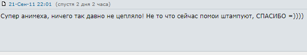 >– Ну месяца два назад. Ну как. Я поклонник аниме, а у аниме есть прикольные штучки (улыбается). Друзья мне иногда присылают. Мне нравится, чтобы там было с сюжетом, когда там какие-то супердевушки. Их отряд, они там борются, монстры там. Это интересно, это я люблю посмотреть (улыбается).