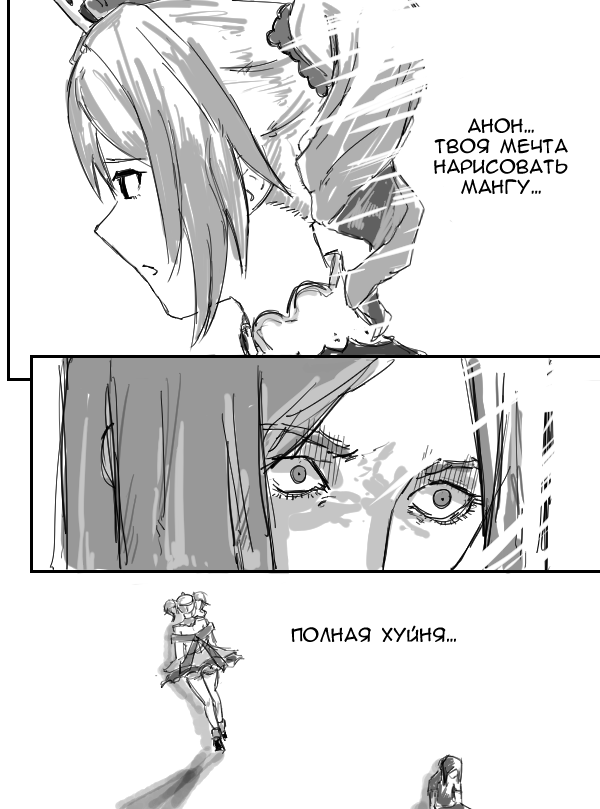 И главная идея манги - АНФАБУЛА... недосказанность это сильнейшая сила поддерживающая интерес к истории. Особенно в современно мире хайпа. Персонажи манги должны нихуя не объяснить читателю. Всё происходящее вокруг должно быть интерпретирована самими читателями. После каждой главы у читателя должно быть чувство - Какого хуя? И желание искать спгс.