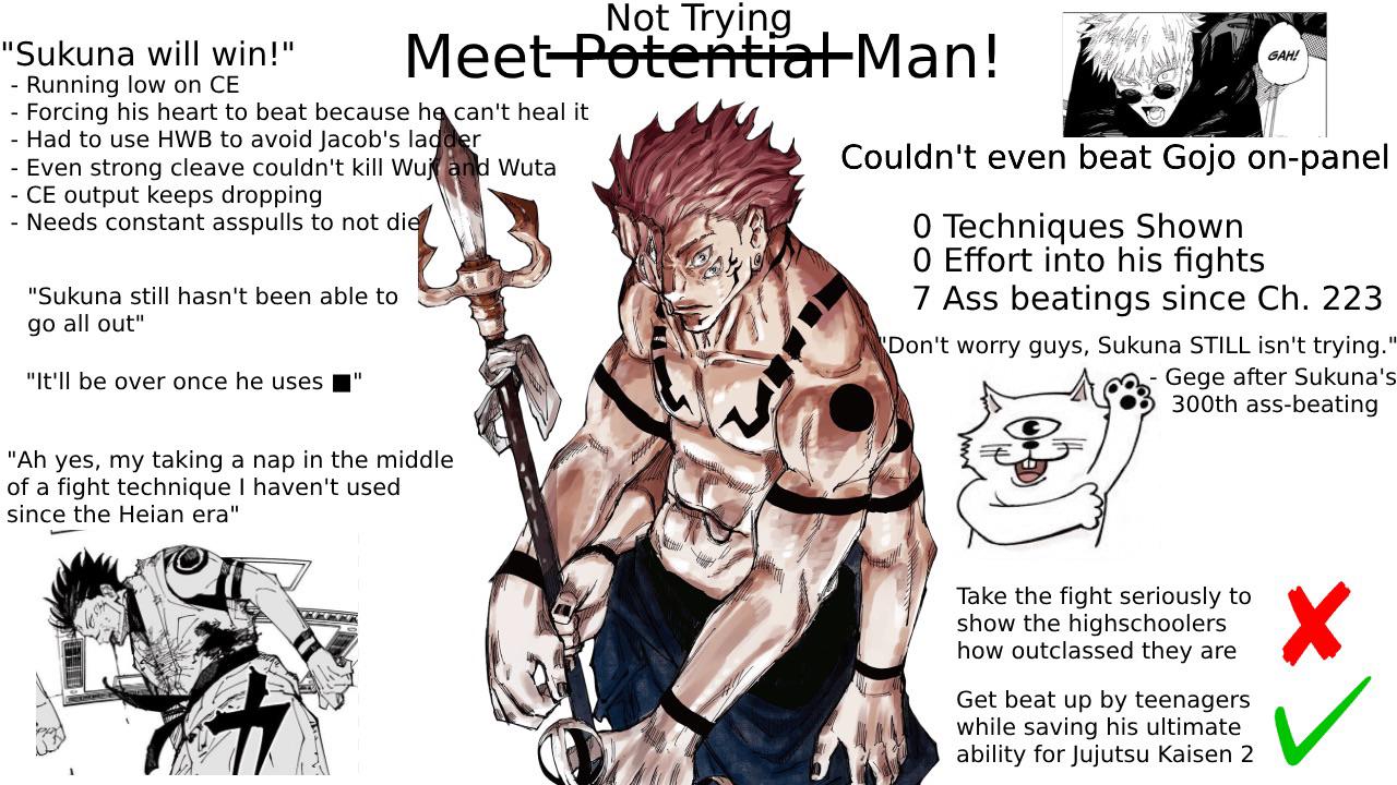 Геге настолько хуевый писака что тредовский каловый канон про сон, дрёму и порез кала имеет больший логический смысл и меньше рояльных противоречий, чем сам оригинальный сюжет. Вон даже срема в бою с юджи реально почти заснул