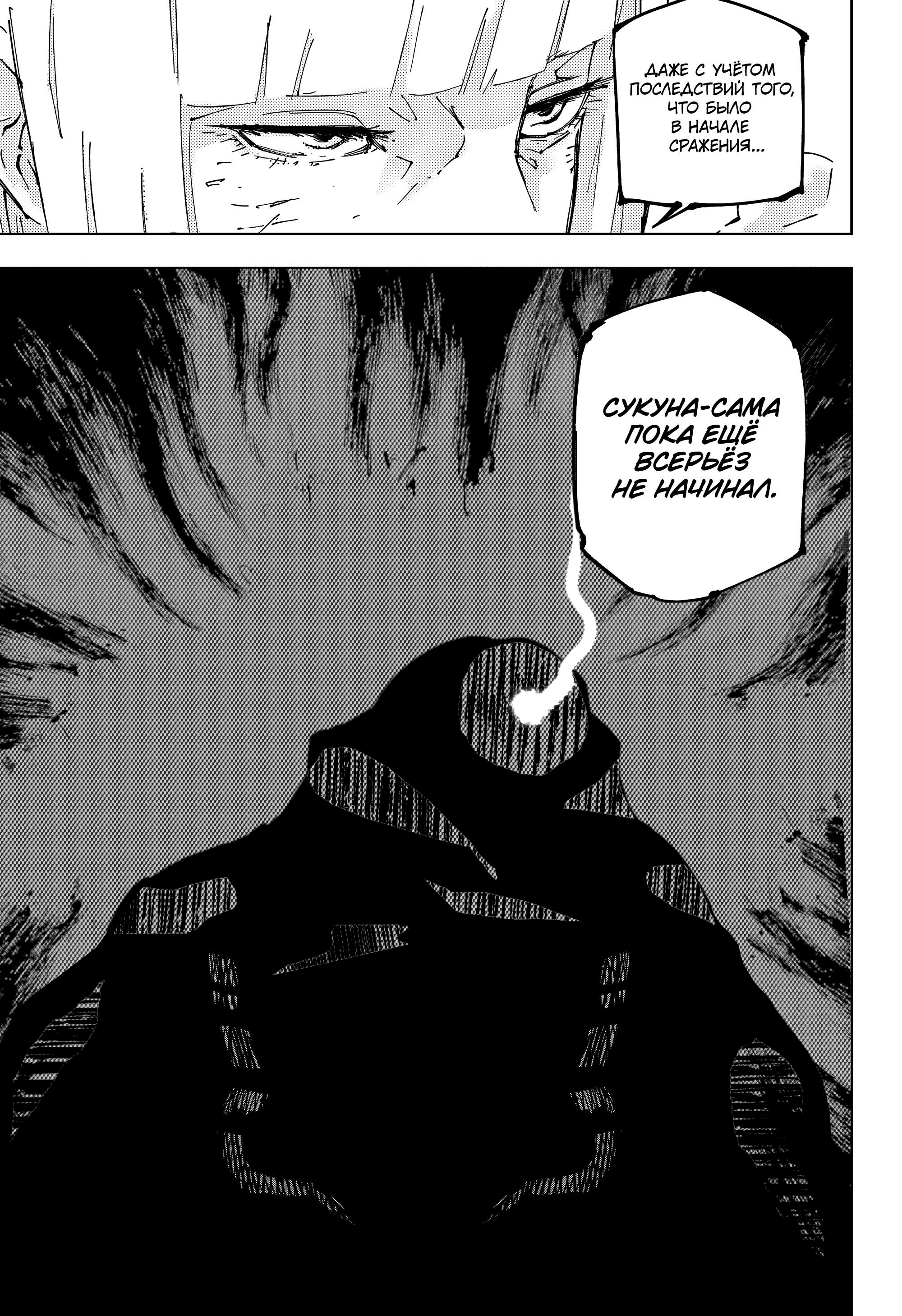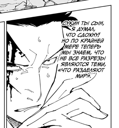 246 глава. Сукуна пукает порезиками и все обсираются. Чтобы хоть как-то выжить поспевает кусакабе и танкует своим симплом димплом, а он реальный танк, выдерживал изумаки с махито от кринжа. И то он сам говорит что думал что умрет
